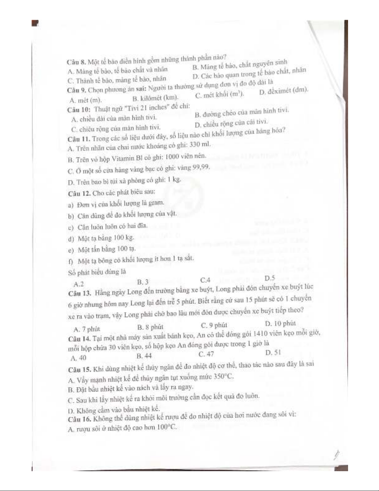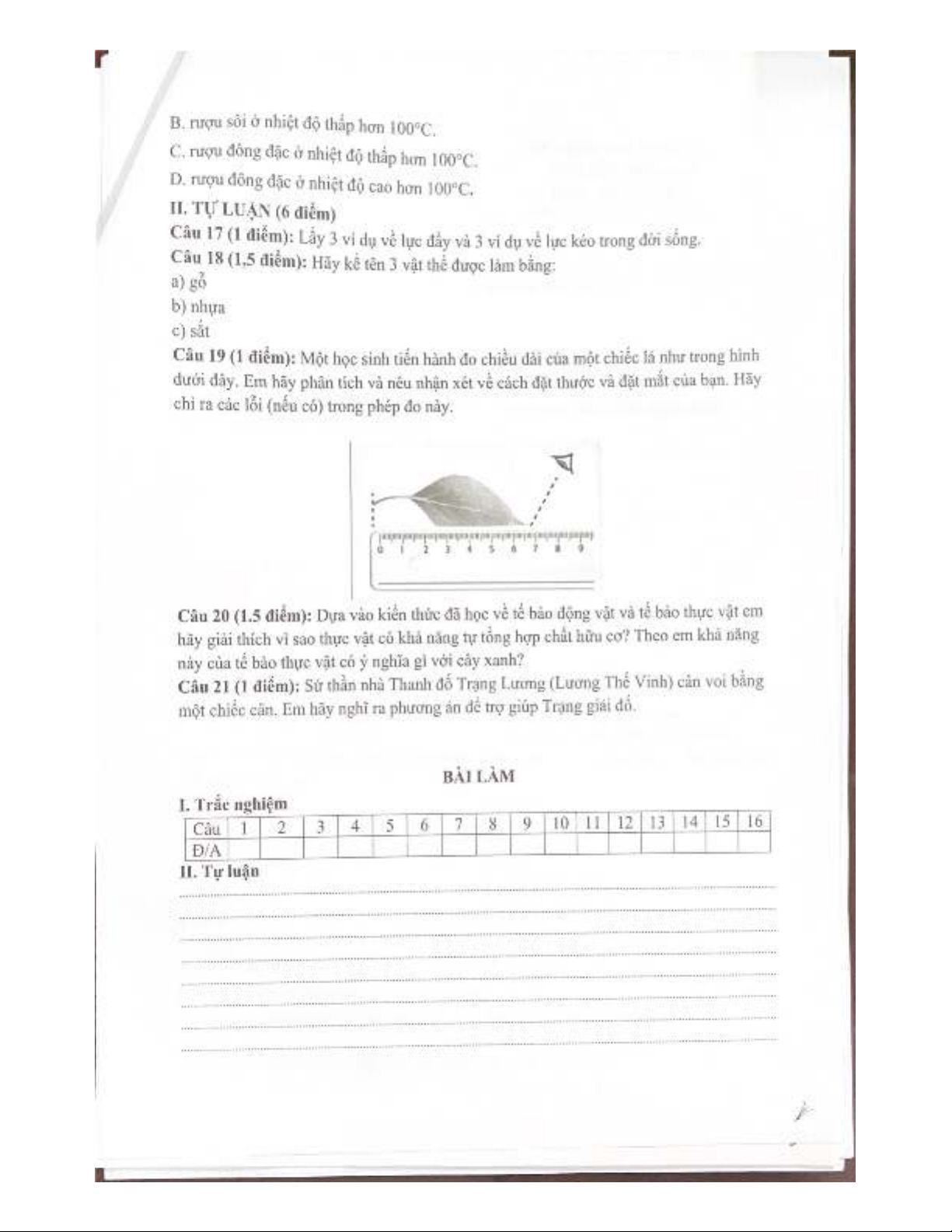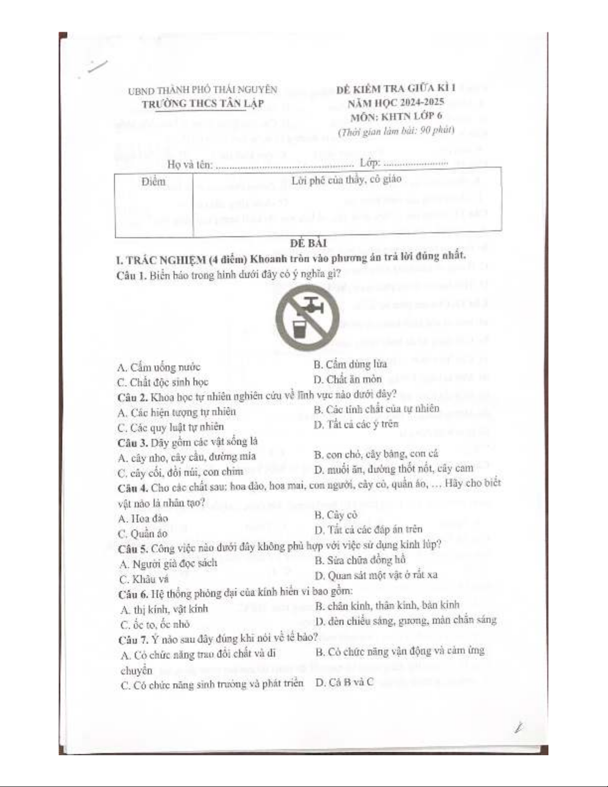 Đề thi giữa học kì 1 môn KHTN lớp 6 năm 2024-2025 - Trường THCS Tân Lập, Thái Nguyên
