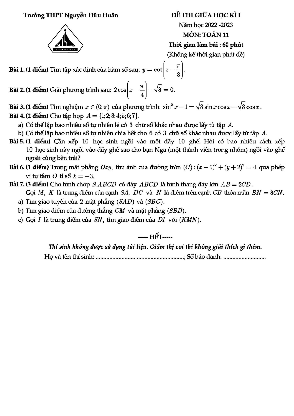 Đề thi giữa học kì 1 môn Toán lớp 11 năm 2022-2023 - Trường THPT Nguyễn Hữu Huân