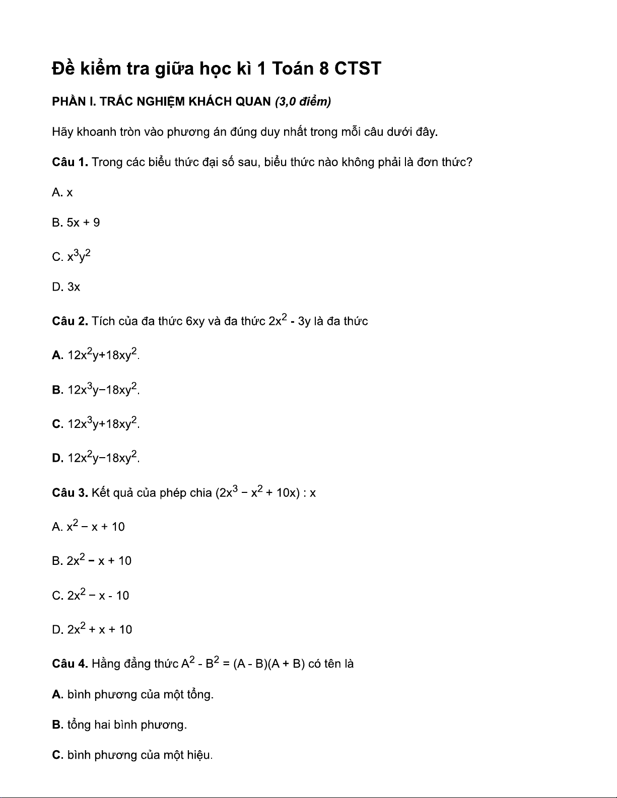 TOÁN 8- CTST – ĐỀ SỐ 1