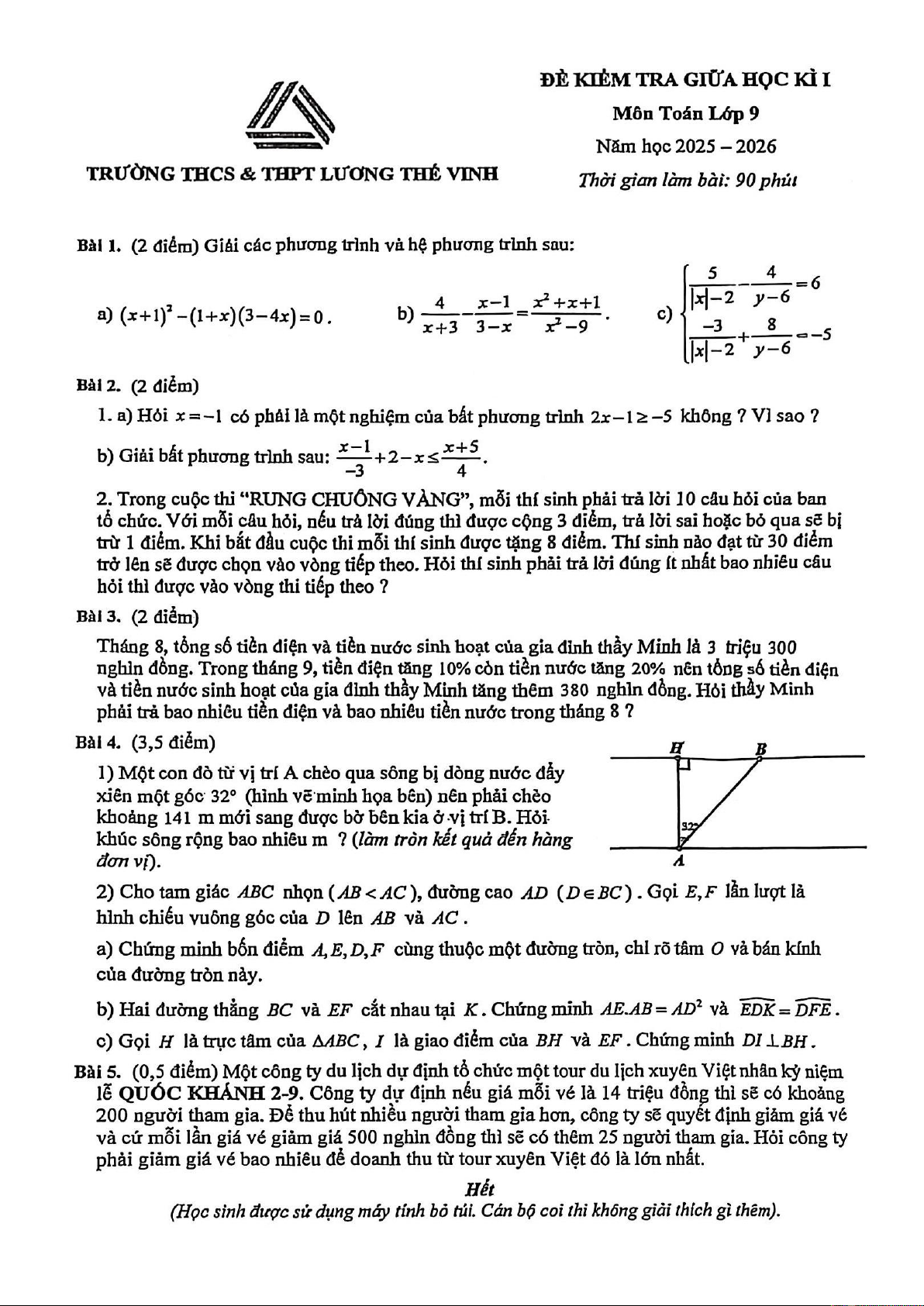 Đề kiểm tra Toán lớp 9 giữa học kỳ I (2025-2026) trường Lương Thế Vinh gồm các câu hỏi về: giải phương trình, bất phương trình, hình học và ứng dụng thực tế. Đề kiểm tra này đánh giá toàn diện kiến thức và kỹ năng của học sinh lớp 9 trong chương trình Toán học kỳ I, bao gồm cả kiến thức lý thuyết và khả năng ứng dụng vào các bài toán thực tế.