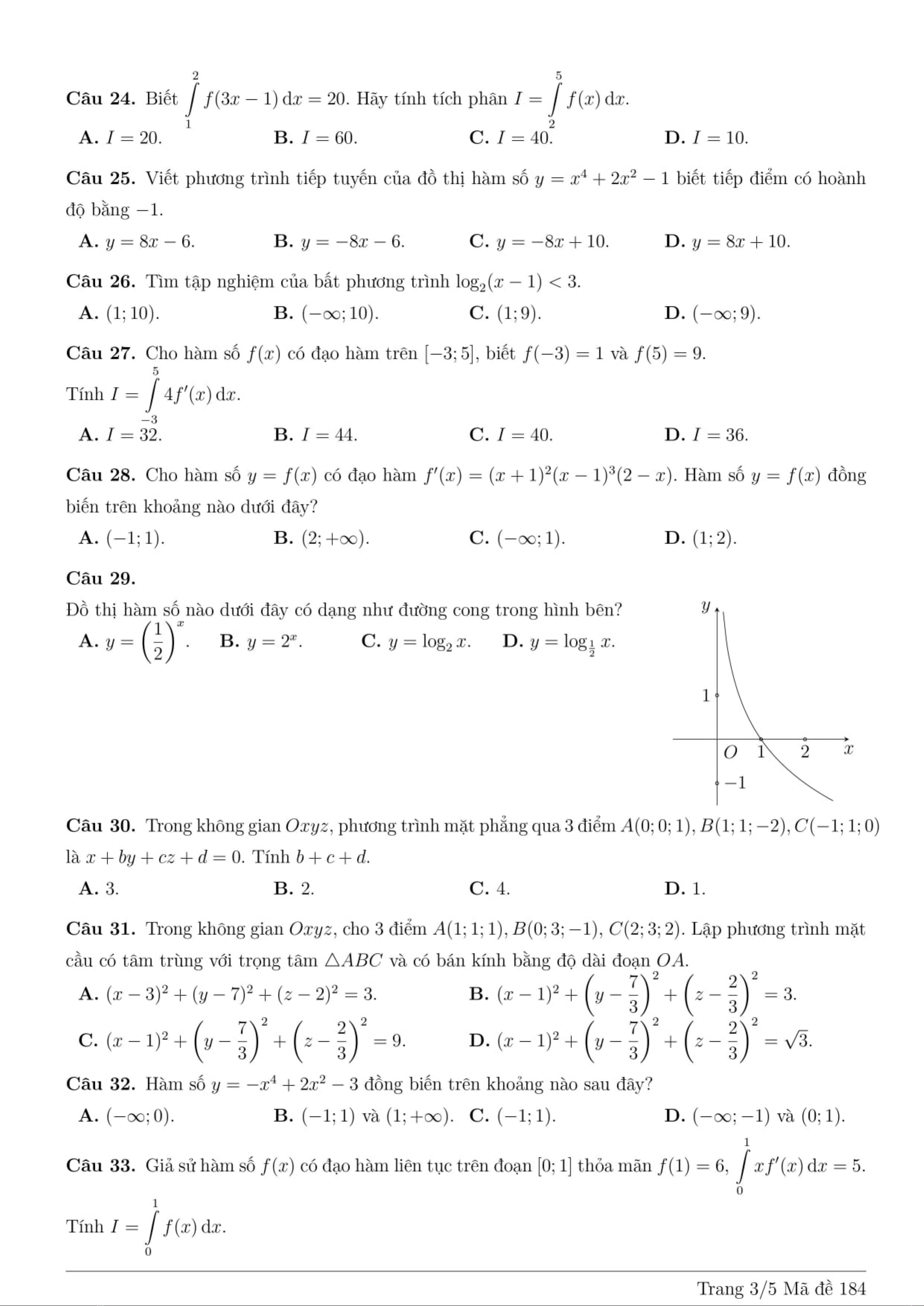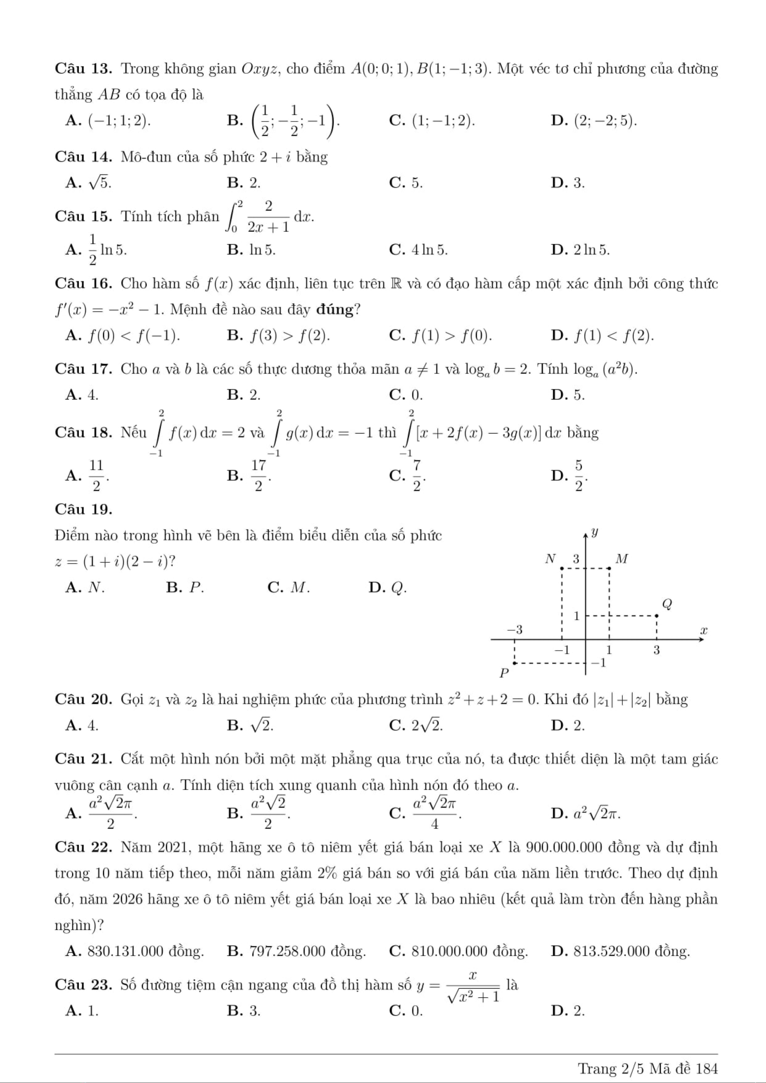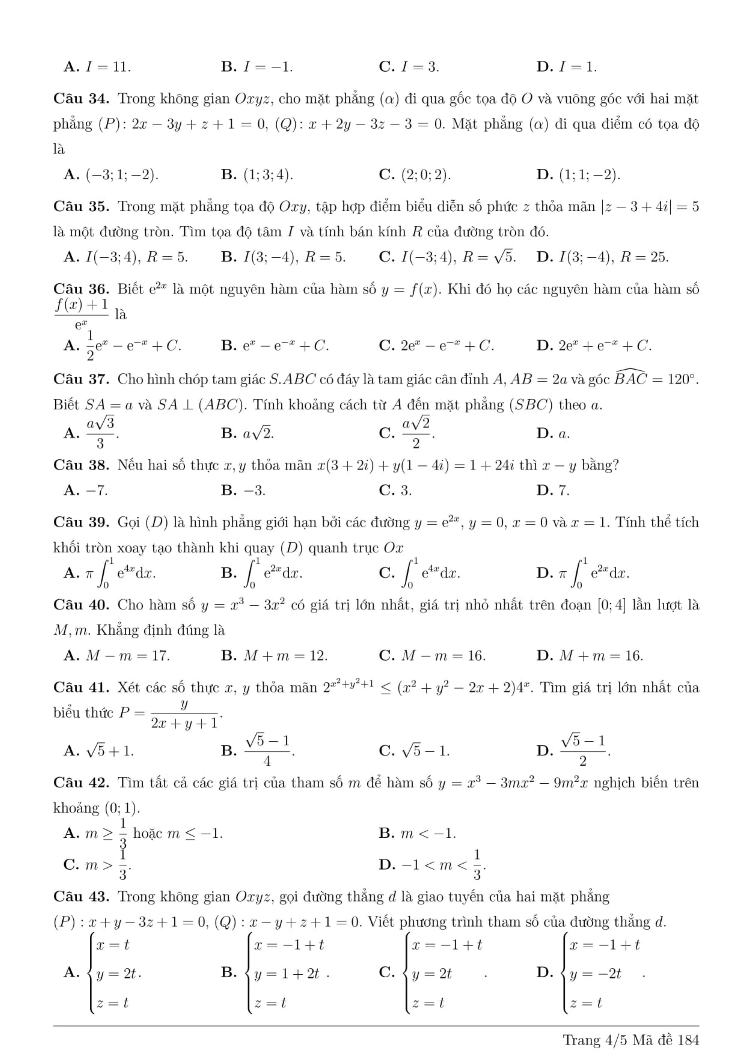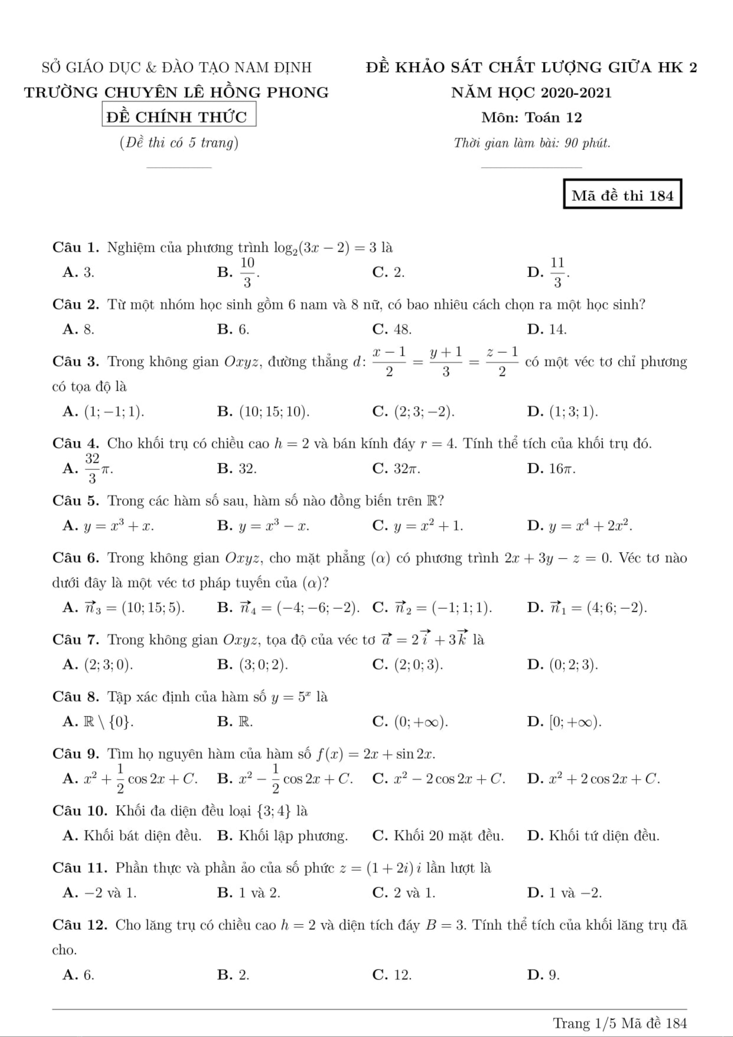 Đề thi giữa học kì 2 môn Toán lớp 12 năm 2020-2021 có đáp án - Trường THPT Lê Hồng Phong