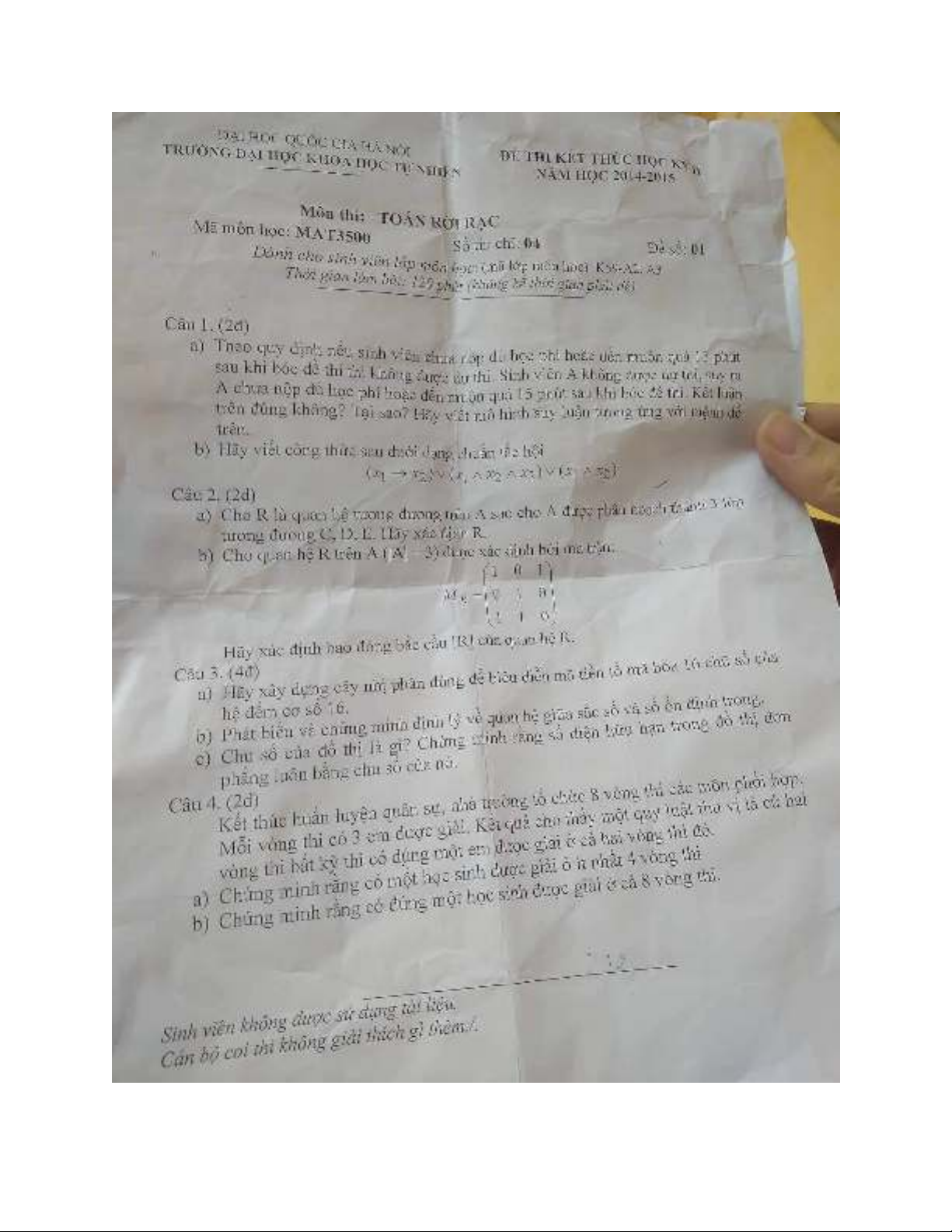 Đề thi hết học kỳ II năm học 2014-2015 môn Toán rời rạc - ĐH Khoa học Tự nhiên