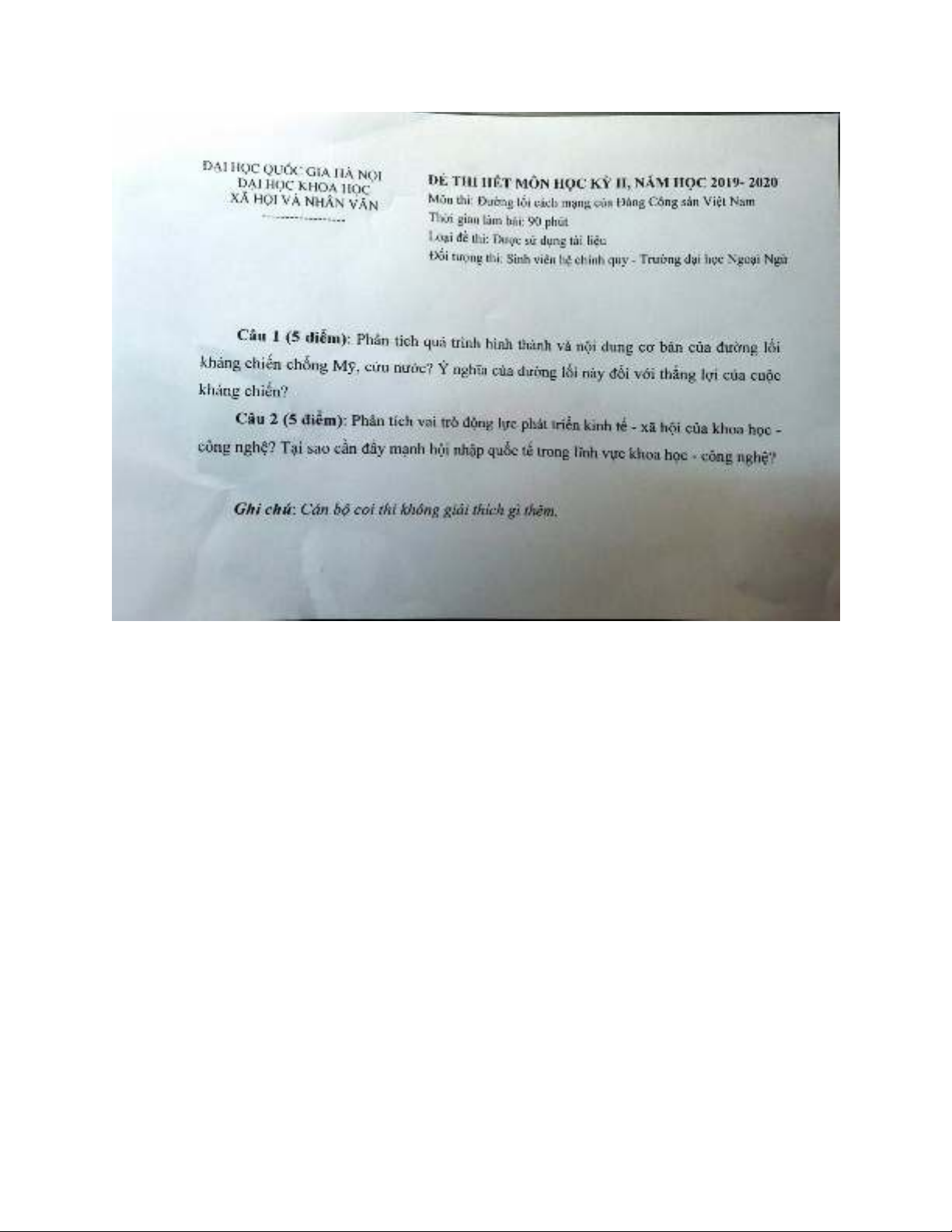 Đề thi hết môn học kỳ II năm học 2019-2020 môn Đường lối cách mạng của Đảng CSVN - ĐH Ngoại ngữ