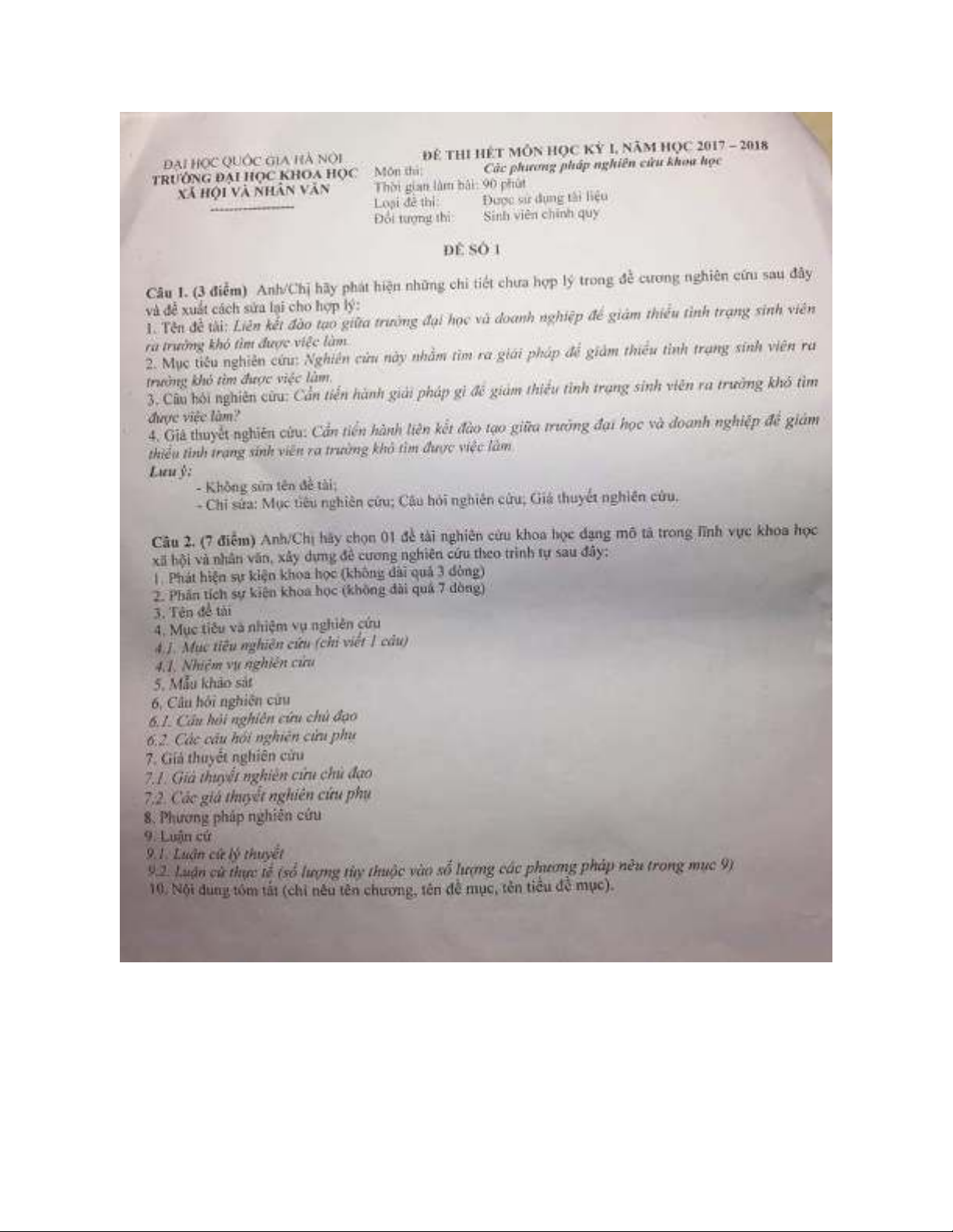 Đề thi hết môn học kỳ I năm học 2017-2018 môn Các phương pháp nghiên cứu khoa học (Đề số 1) - ĐH Khoa học Xã hội và Nhân văn Hà Nội