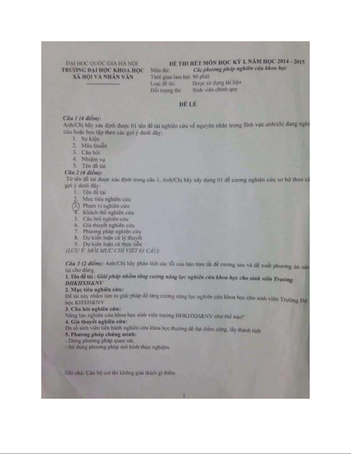 Đề thi hết môn học kỳ I năm học 2014-2015 môn Các phương pháp nghiên cứu khoa học - ĐH Khoa học Xã hội và Nhân văn Hà Nội