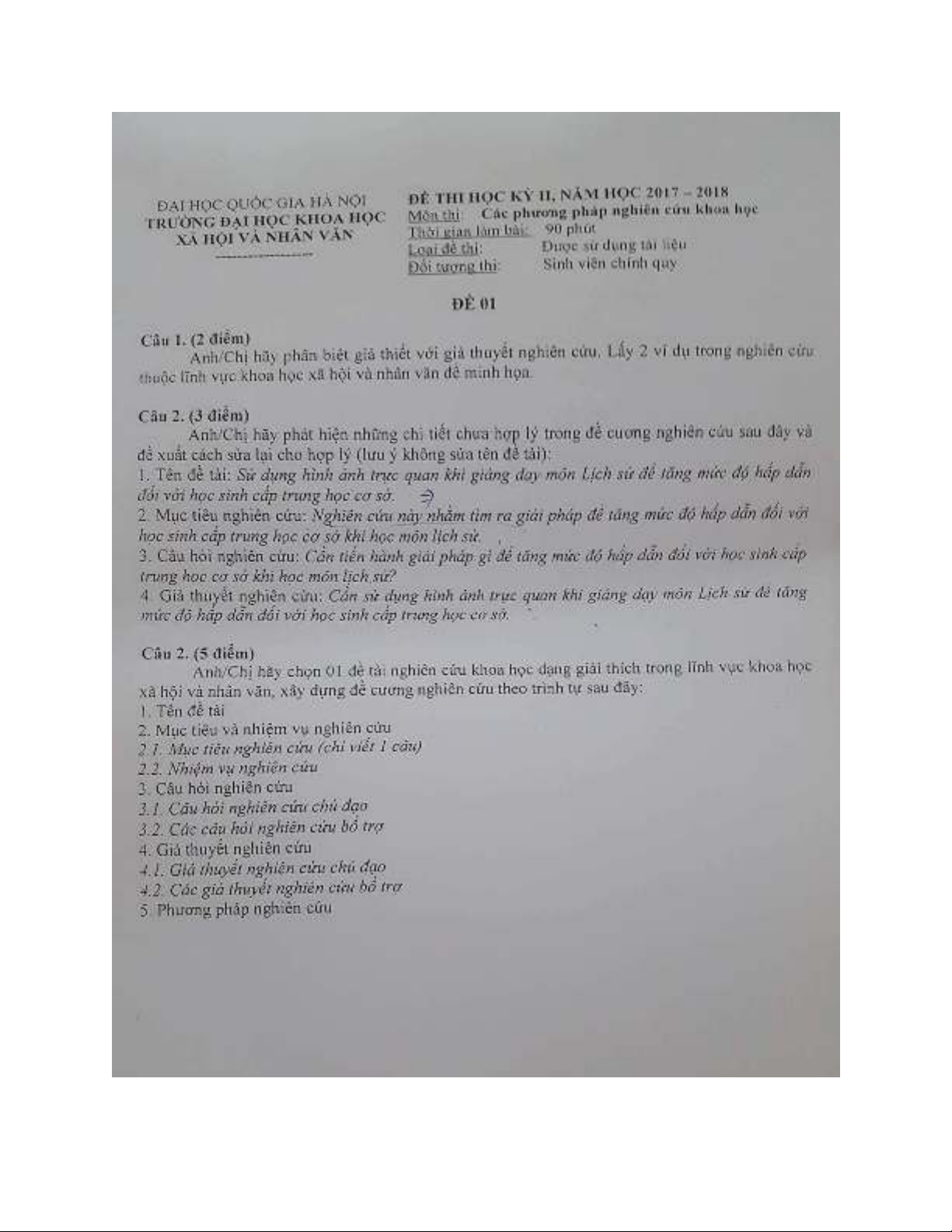 Đề thi hết môn học kỳ II năm học 2017-2018 môn Các phương pháp nghiên cứu khoa học (Đề số 1) - ĐH Khoa học Xã hội và Nhân văn Hà Nội