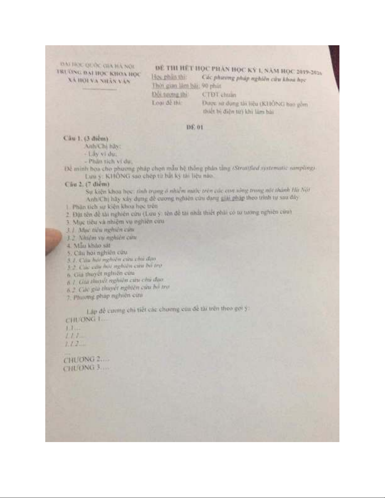 Đề thi hết môn học kỳ I năm học 2019-2020 môn Các phương pháp nghiên cứu khoa học (Đề số 1) - ĐH Khoa học Xã hội và Nhân văn Hà Nội