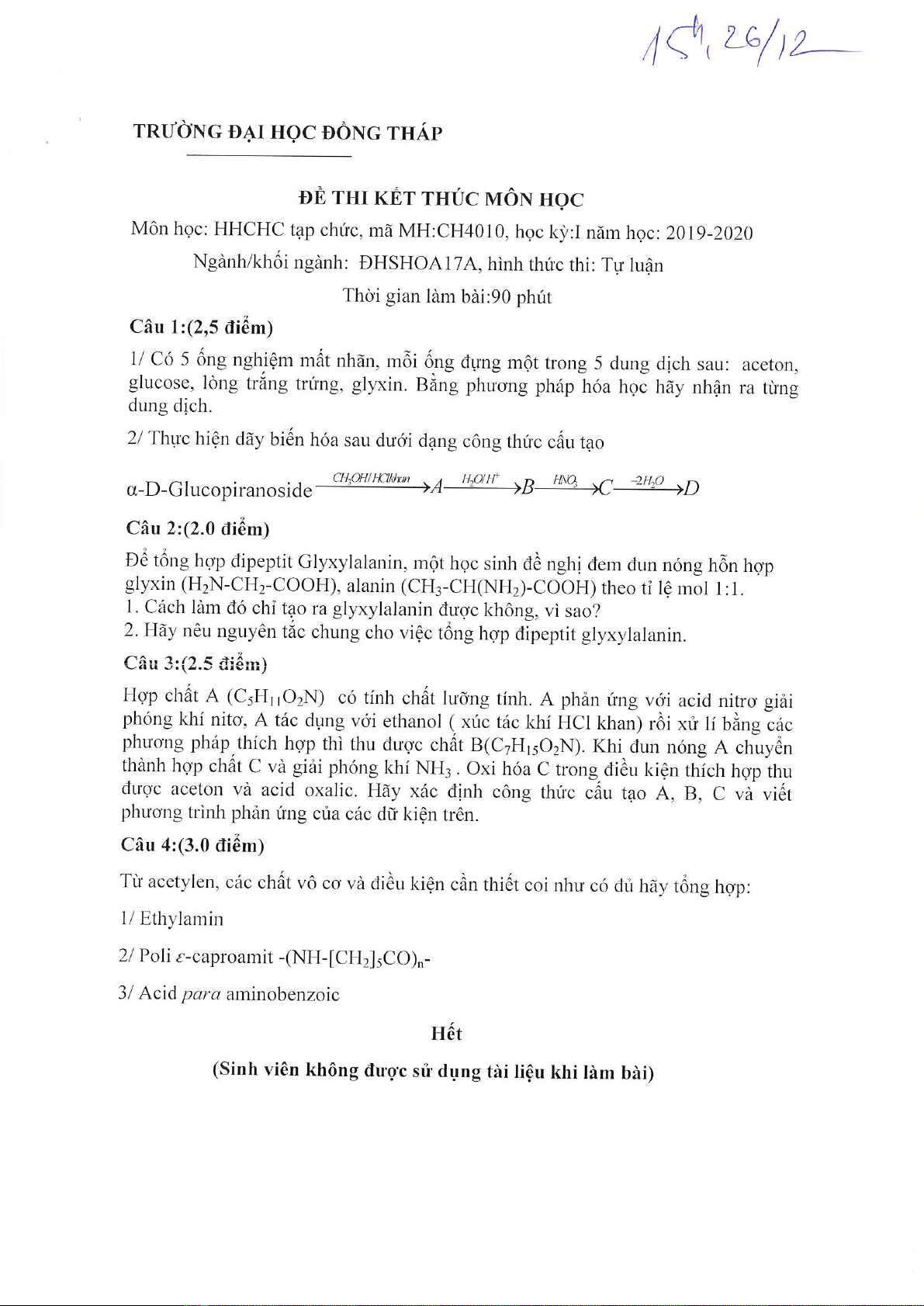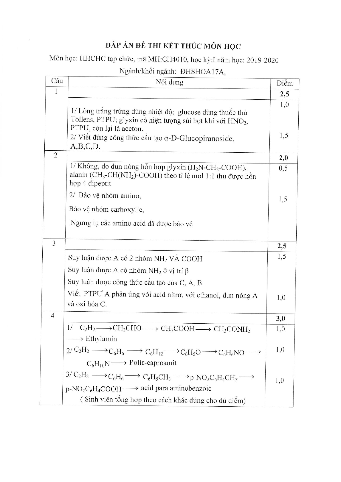 Đề thi kết thúc học phần học kì 1 môn Hóa hợp chất hữu cơ tạp chức năm 2019-2020 có đáp án - Trường ĐH Đồng Tháp