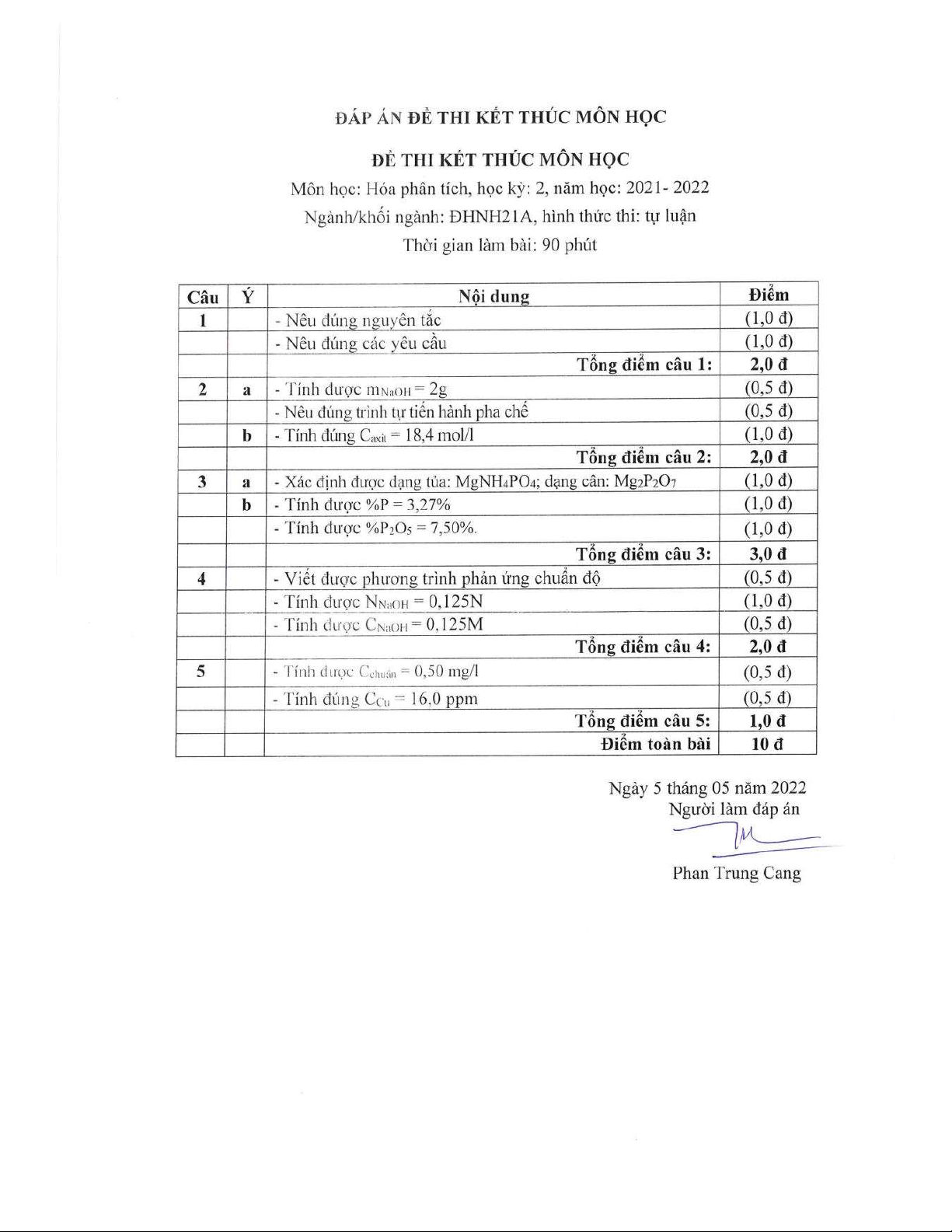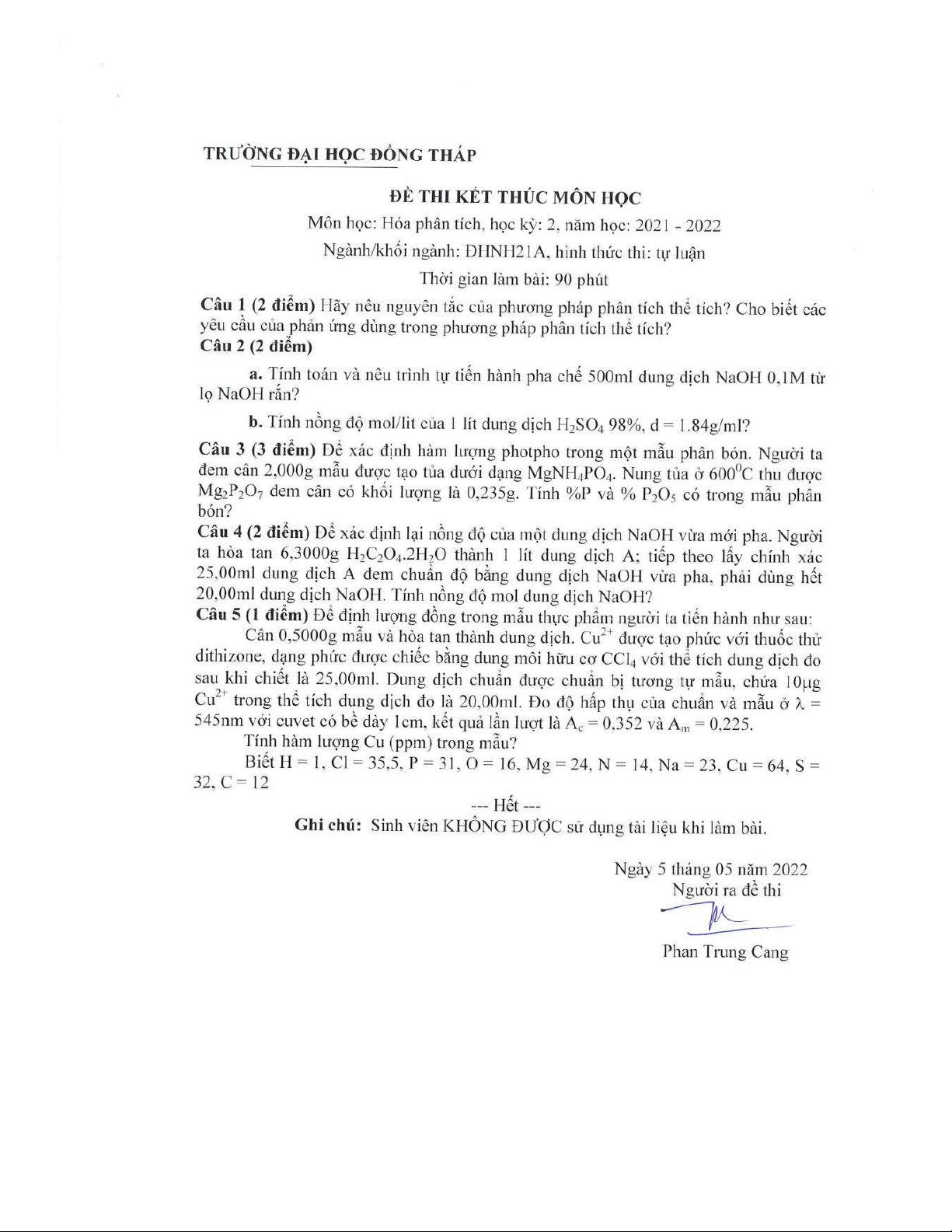 Đề thi kết thúc học phần học kì 2 môn Hóa phân tích năm 2021-2022 có đáp án - Trường ĐH Đồng Tháp