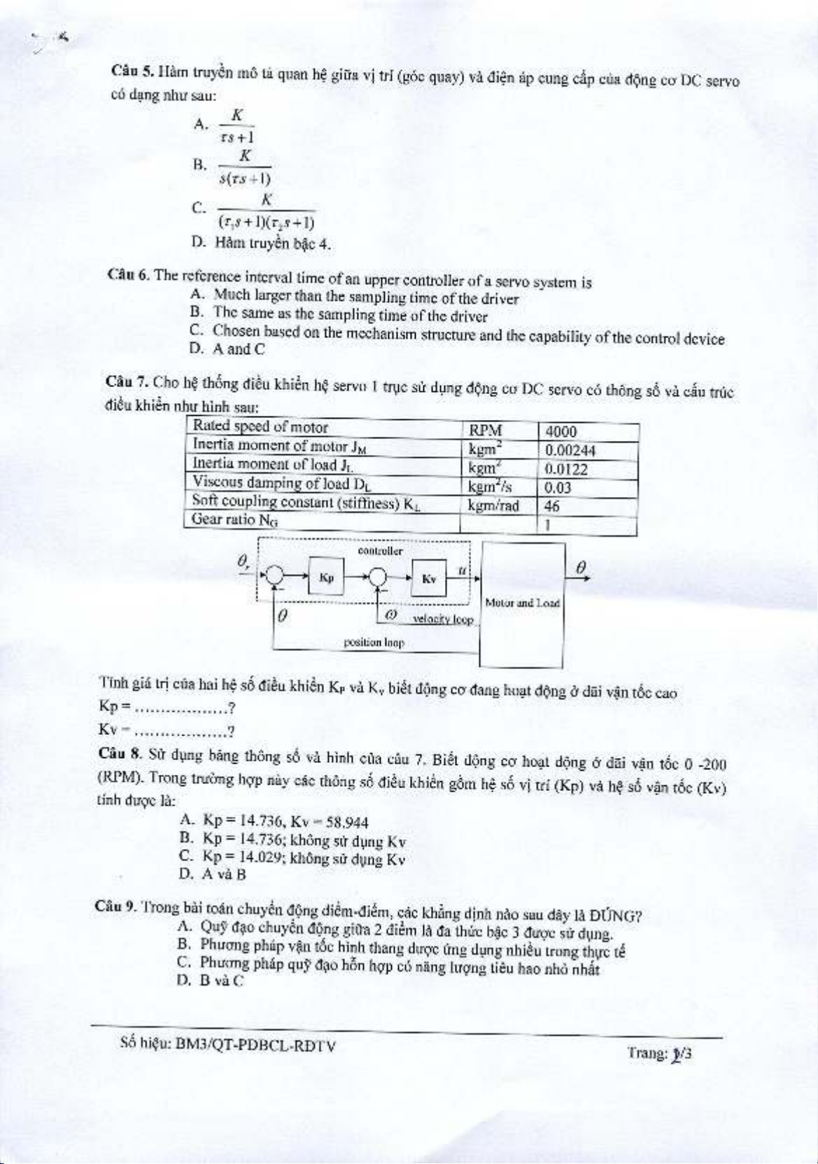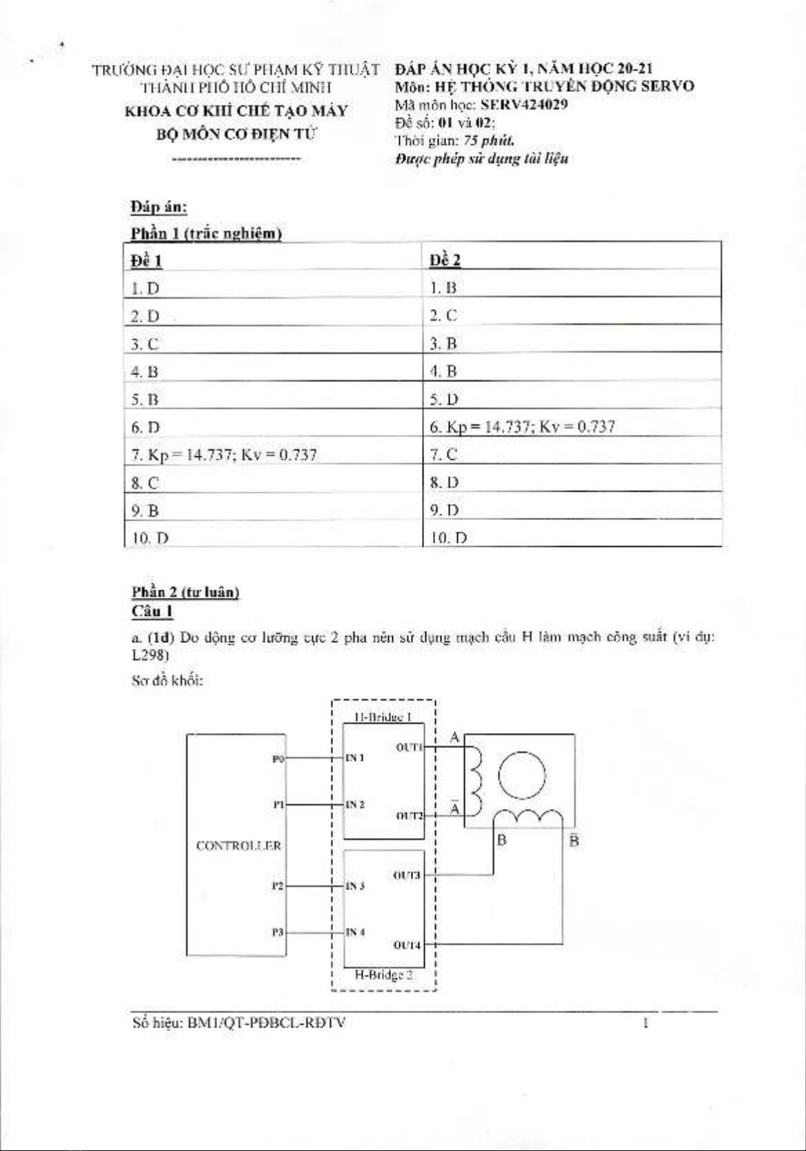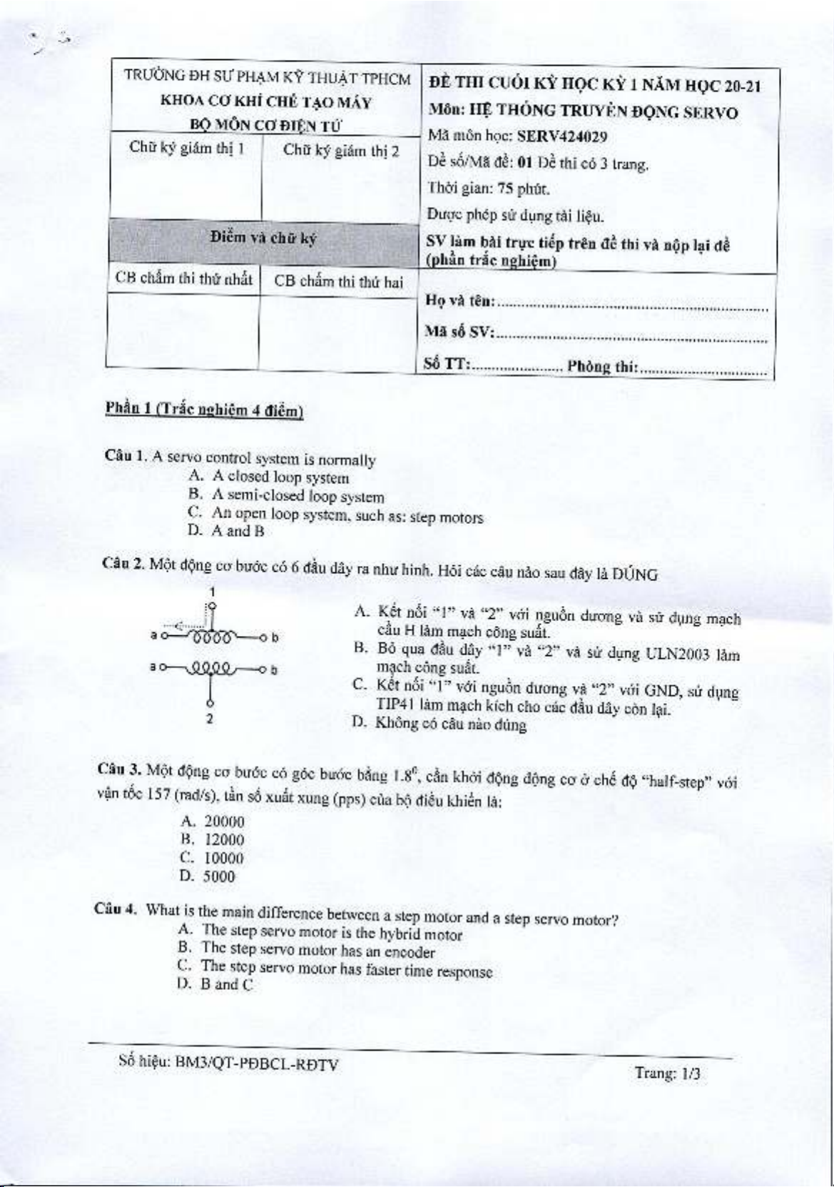 Đề thi học kì 1 môn Hệ thống truyền động Servo năm 2020-2021 có đáp án - Trường ĐH Sư Phạm Kỹ Thuật TP.HCM