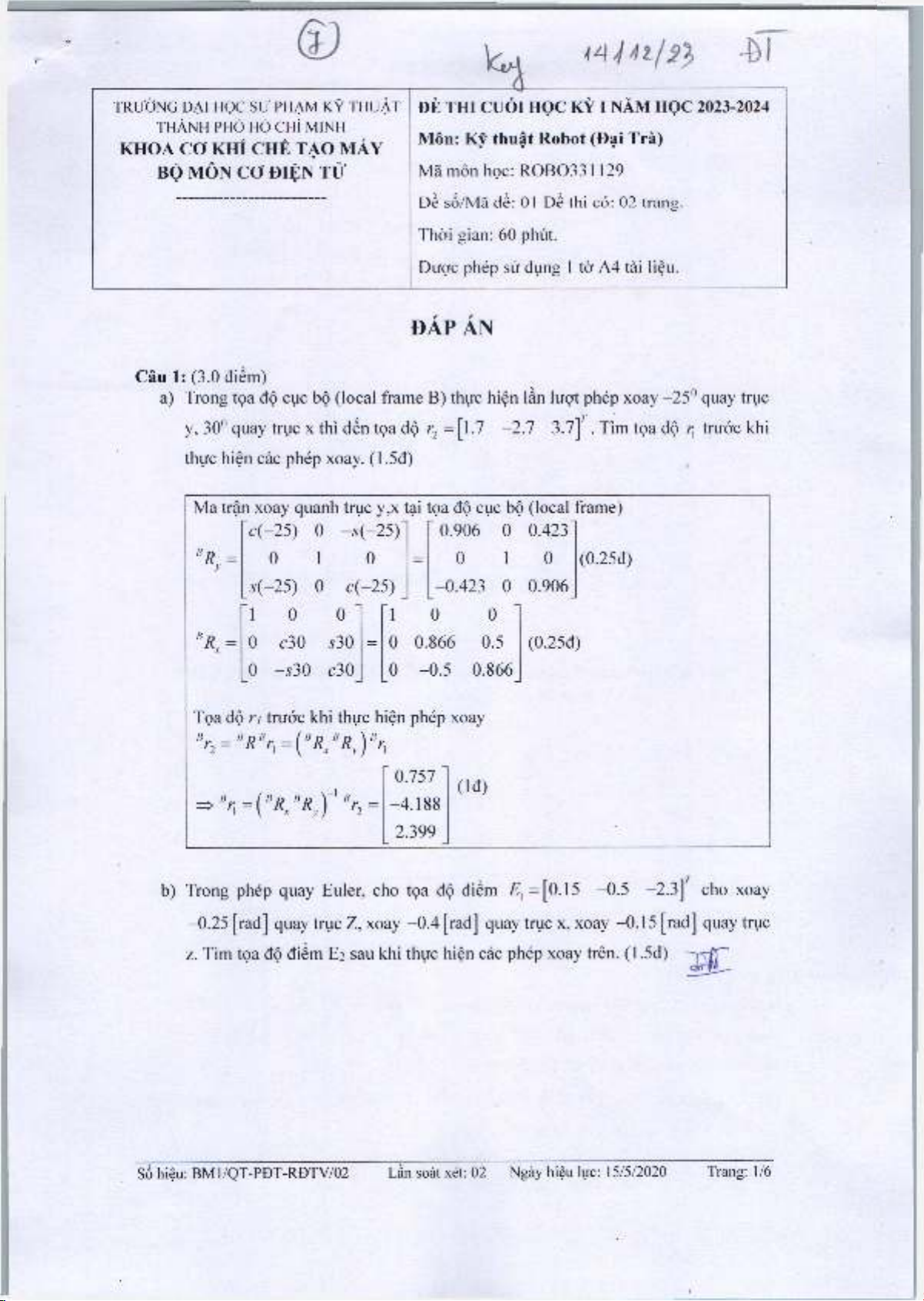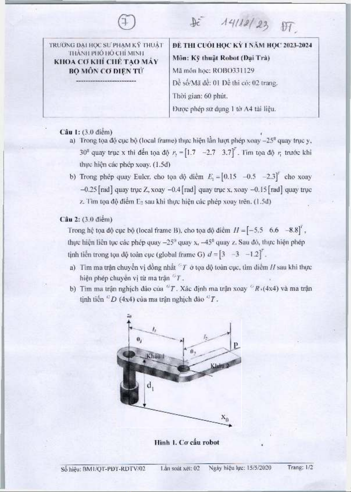 KHOA CO KHI CHE TAO MAY Mon: Ky thuat Robot (Dai Tra)