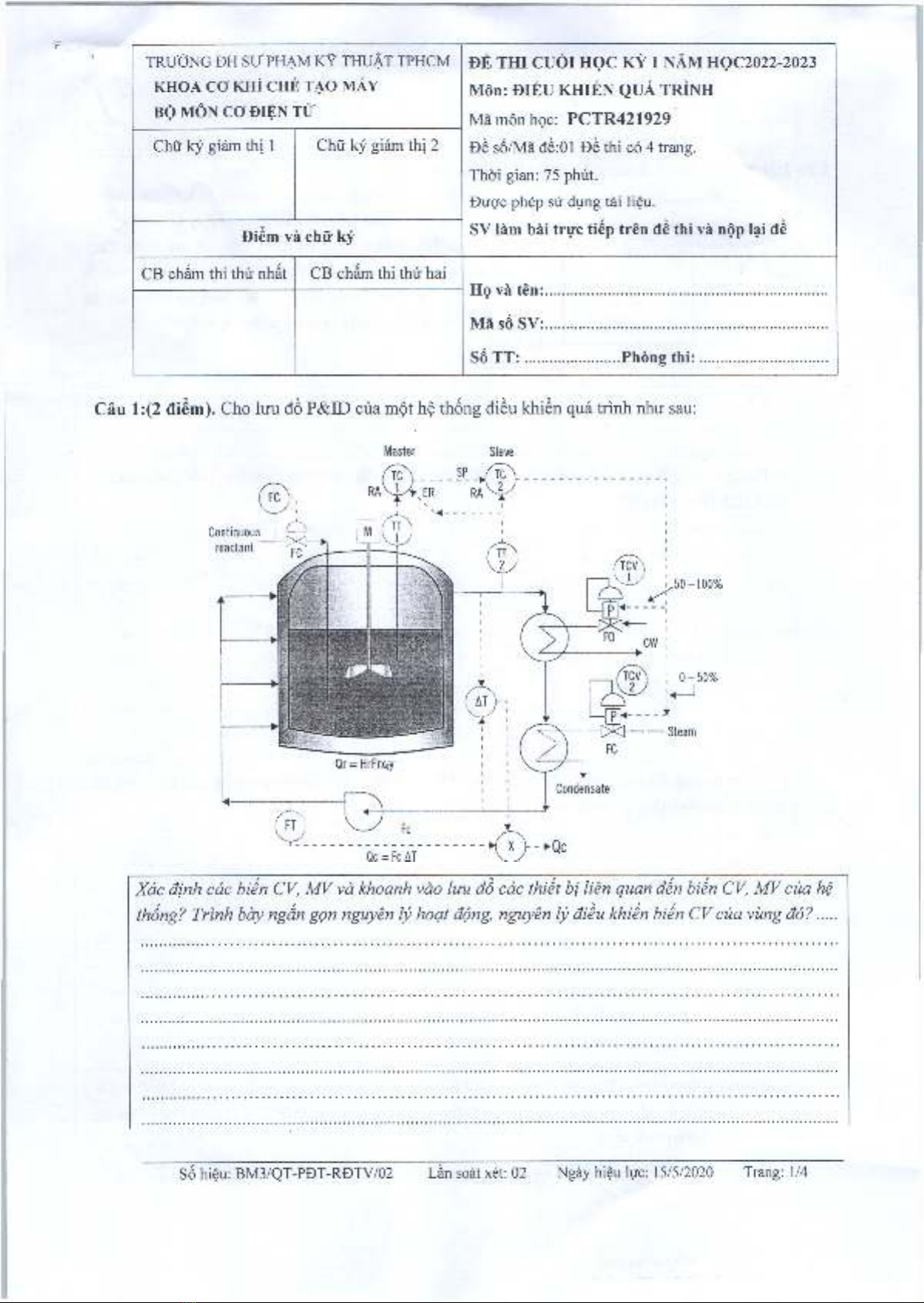 Cäu 1:(2 diem). Cho luu dö P&ID cüa möt he thong dieu khien quä trinh nhu sau: