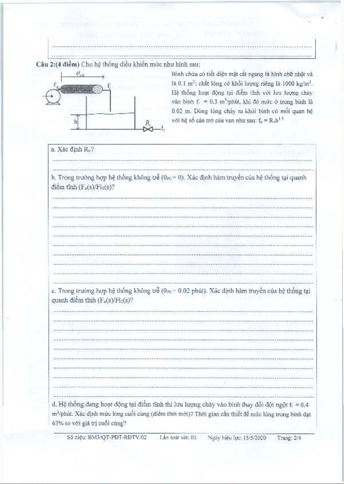 Cäu 3 (4 diem). Giä sü he thöng dieu khien müc löng trong binh ngung tu cö so dö khöi nhu sau: