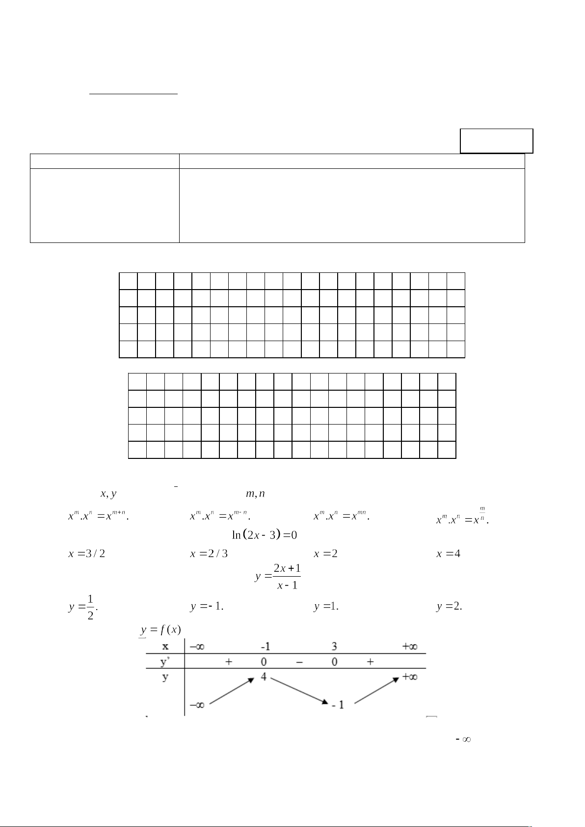 Câu 4. Cho hàm số có bảng biến thiên như sau: