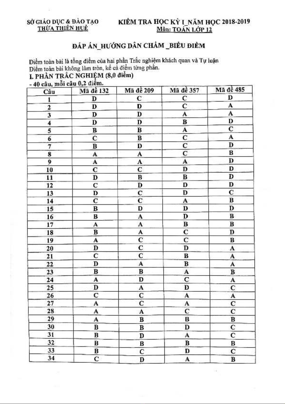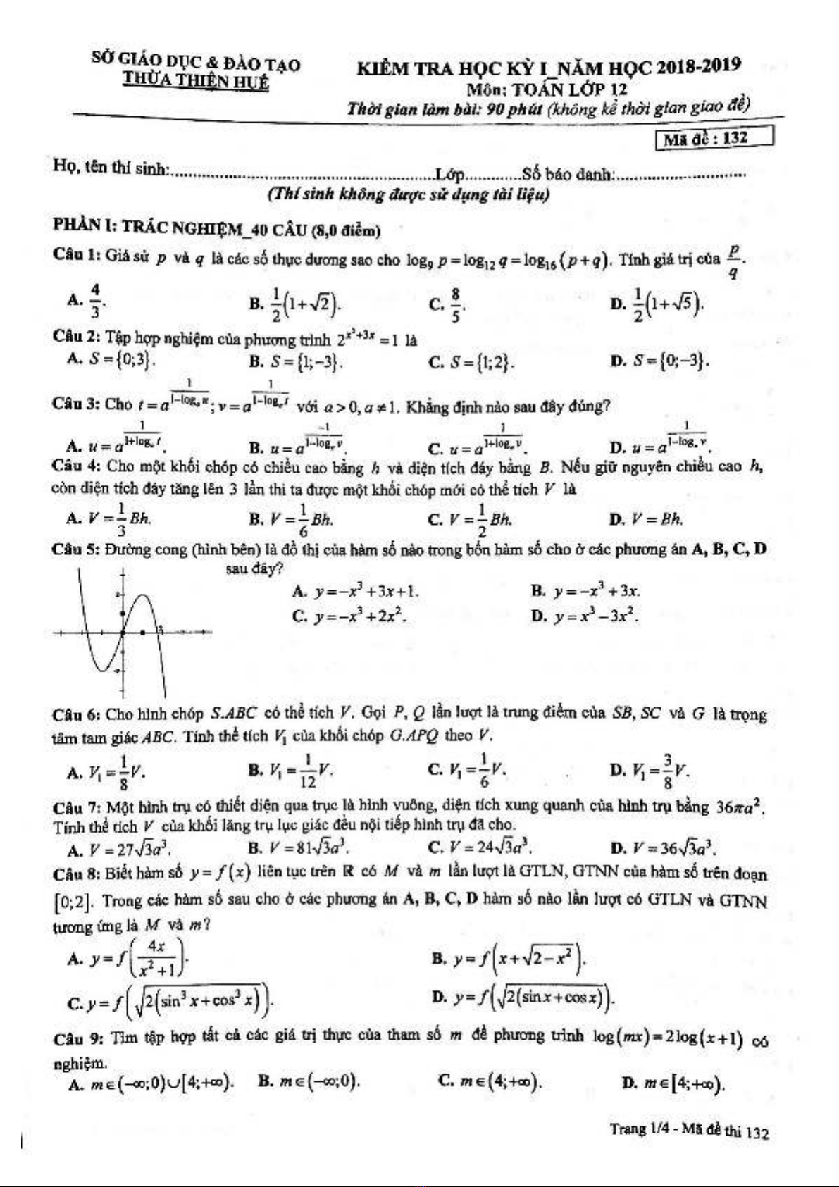 Đề thi học kì 1 môn Toán 12 năm 2018-2019 có đáp án - Sở GD&ĐT Thừa Thiên Huế - Mã đề 132