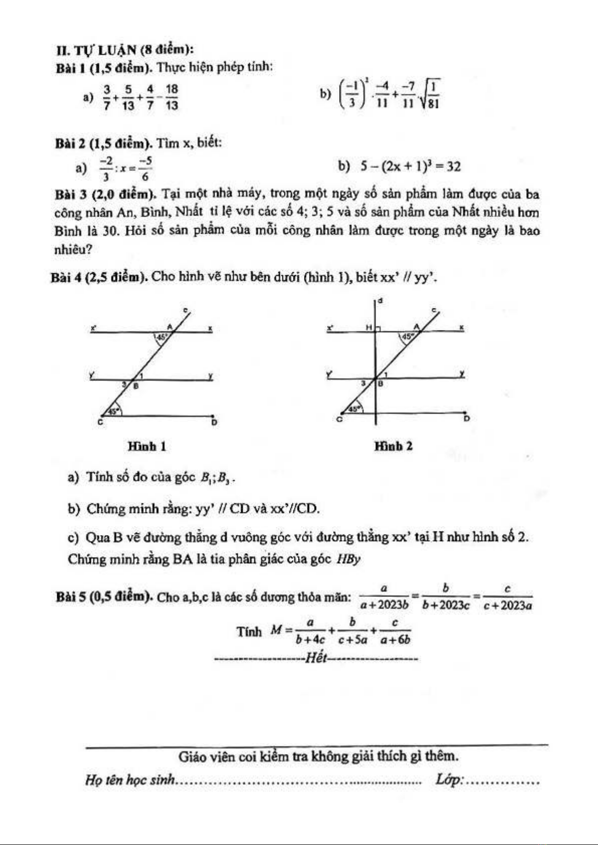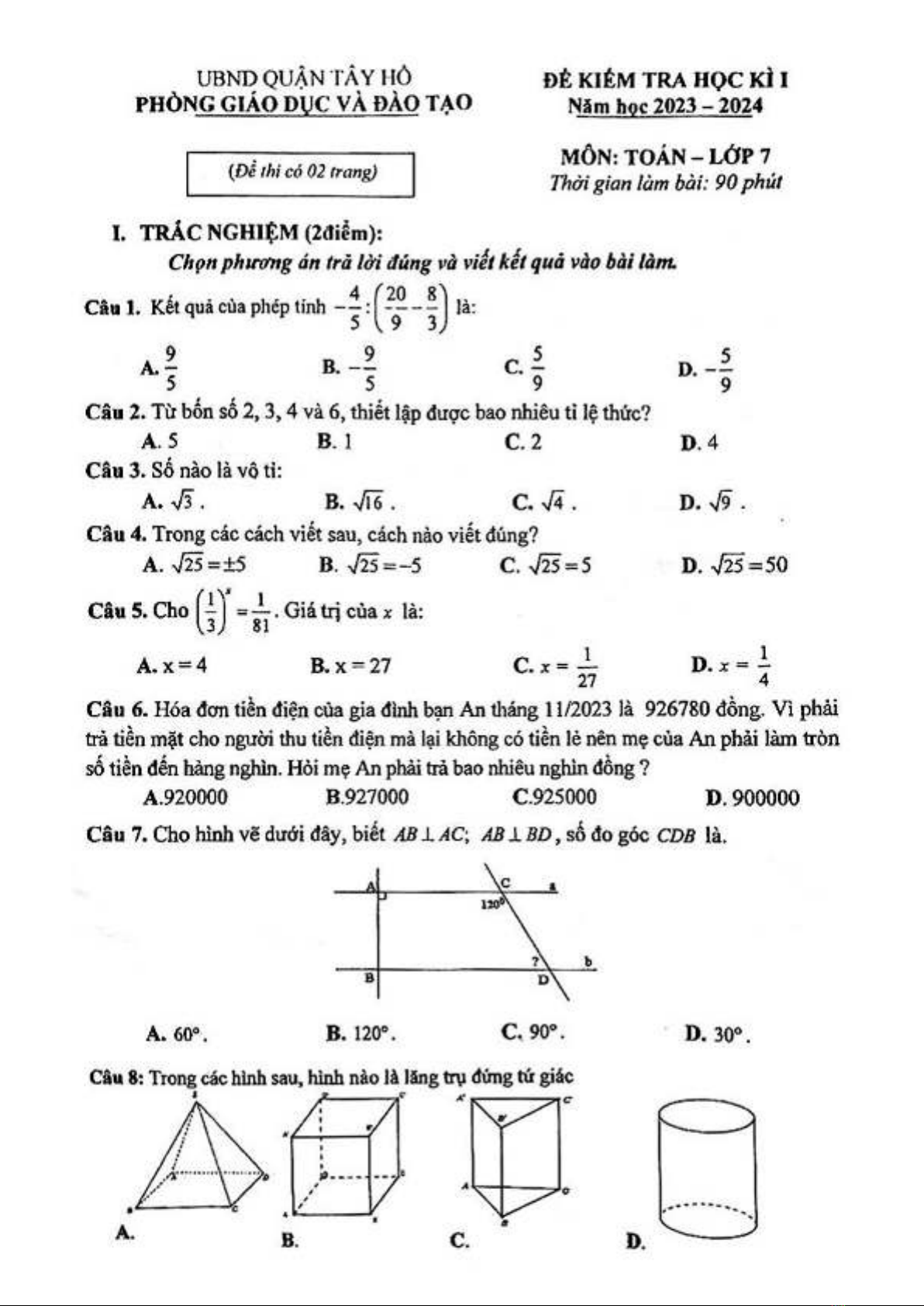 Đề thi học kì 1 môn Toán lớp 7 năm 2023-2024 - Phòng GD&ĐT Tây Hồ