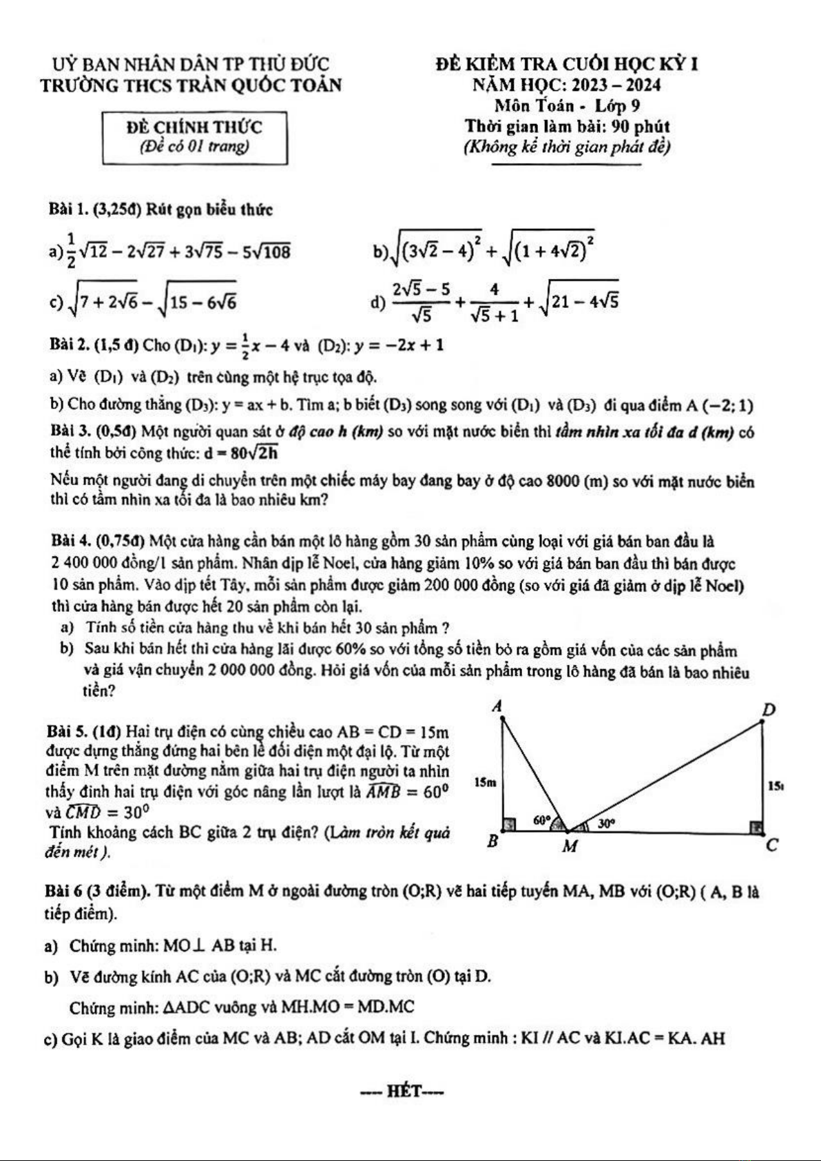 Đề thi học kì 1 môn Toán lớp 9 năm 2023-2024 - Trường THCS Trần Quốc Toản, Thủ Đức
