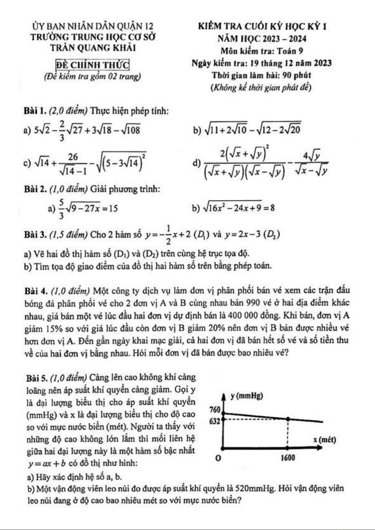 Đề thi học kì 1 môn Toán lớp 9 năm 2023-2024 - Trường THCS Trần Quang Khải, Quận 12