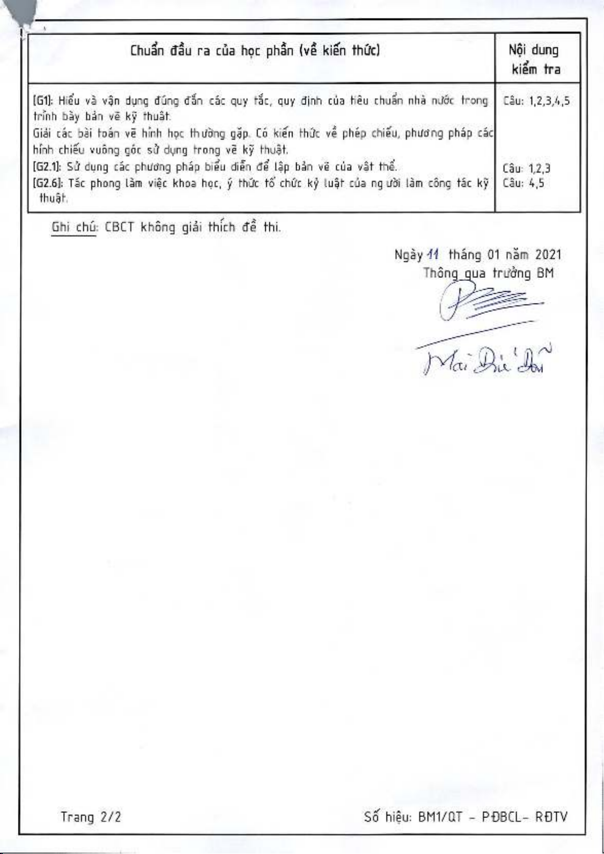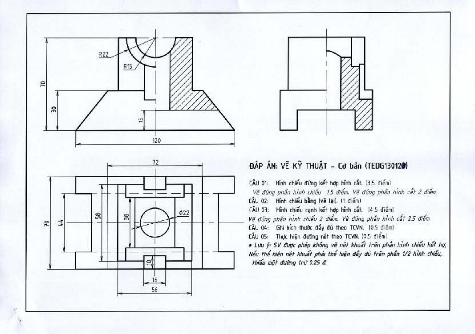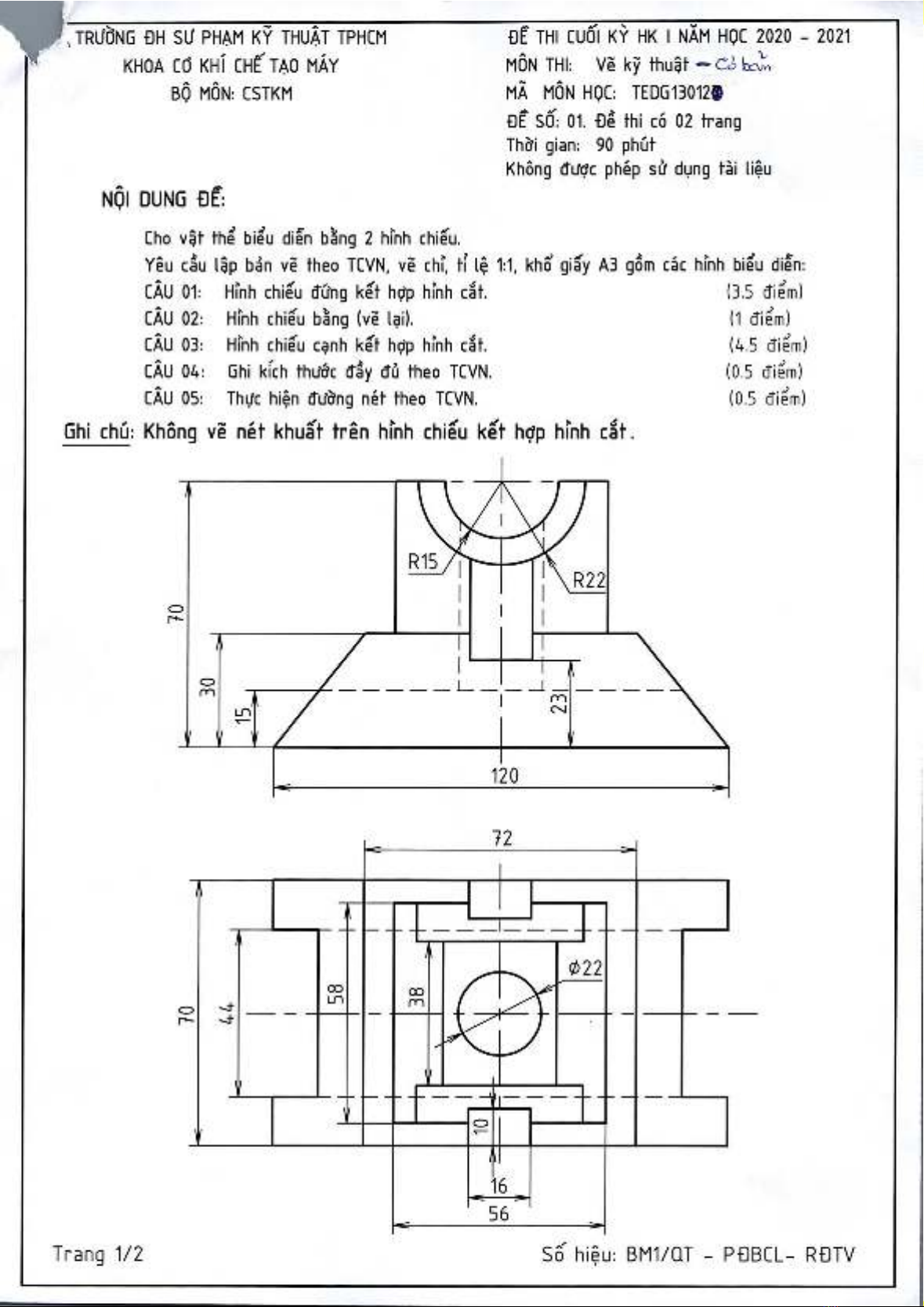 Đề thi học kì 1 môn Vẽ kỹ thuật năm 2020-2021 có đáp án - Trường ĐH Sư Phạm Kỹ Thuật TP.HCM