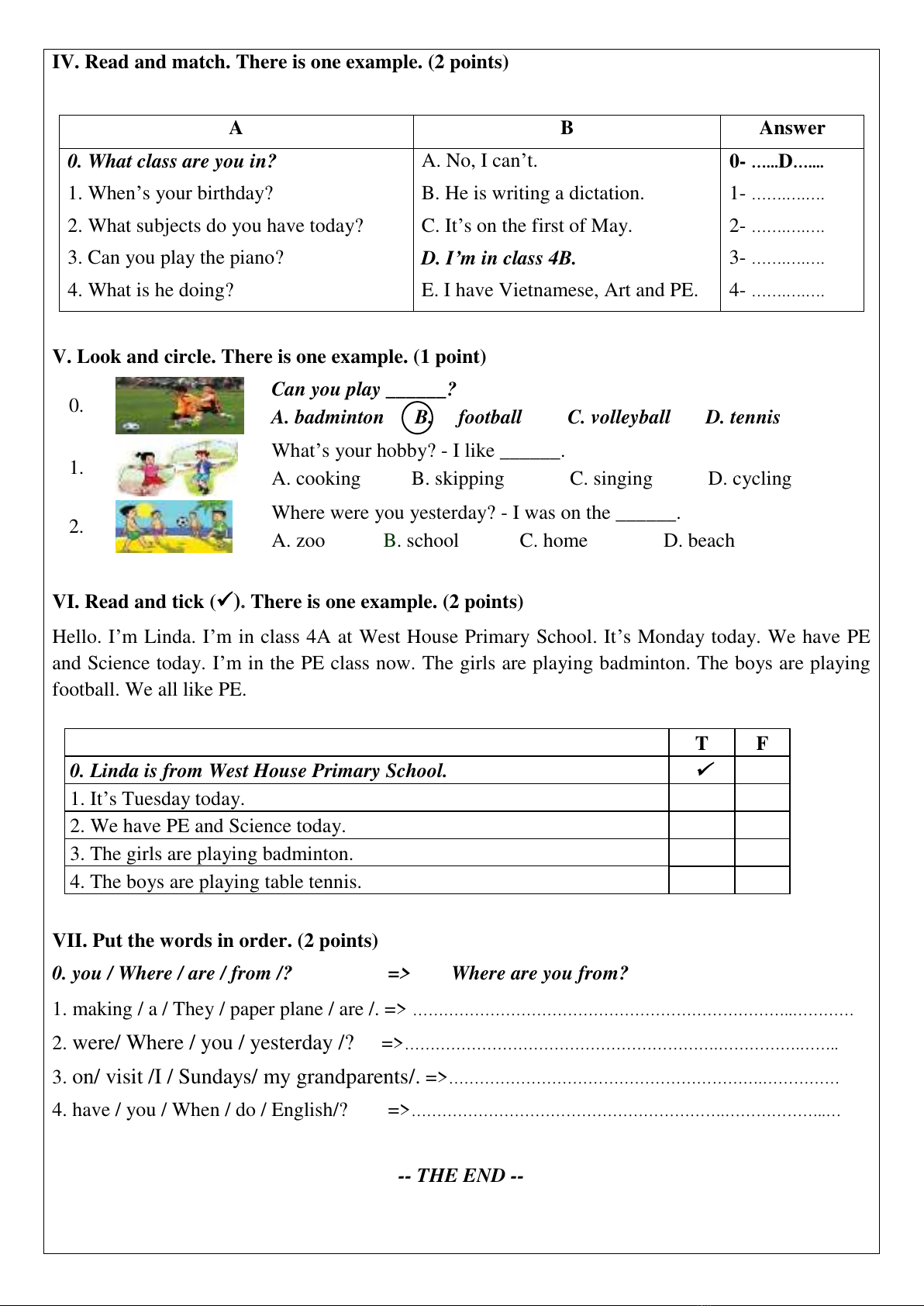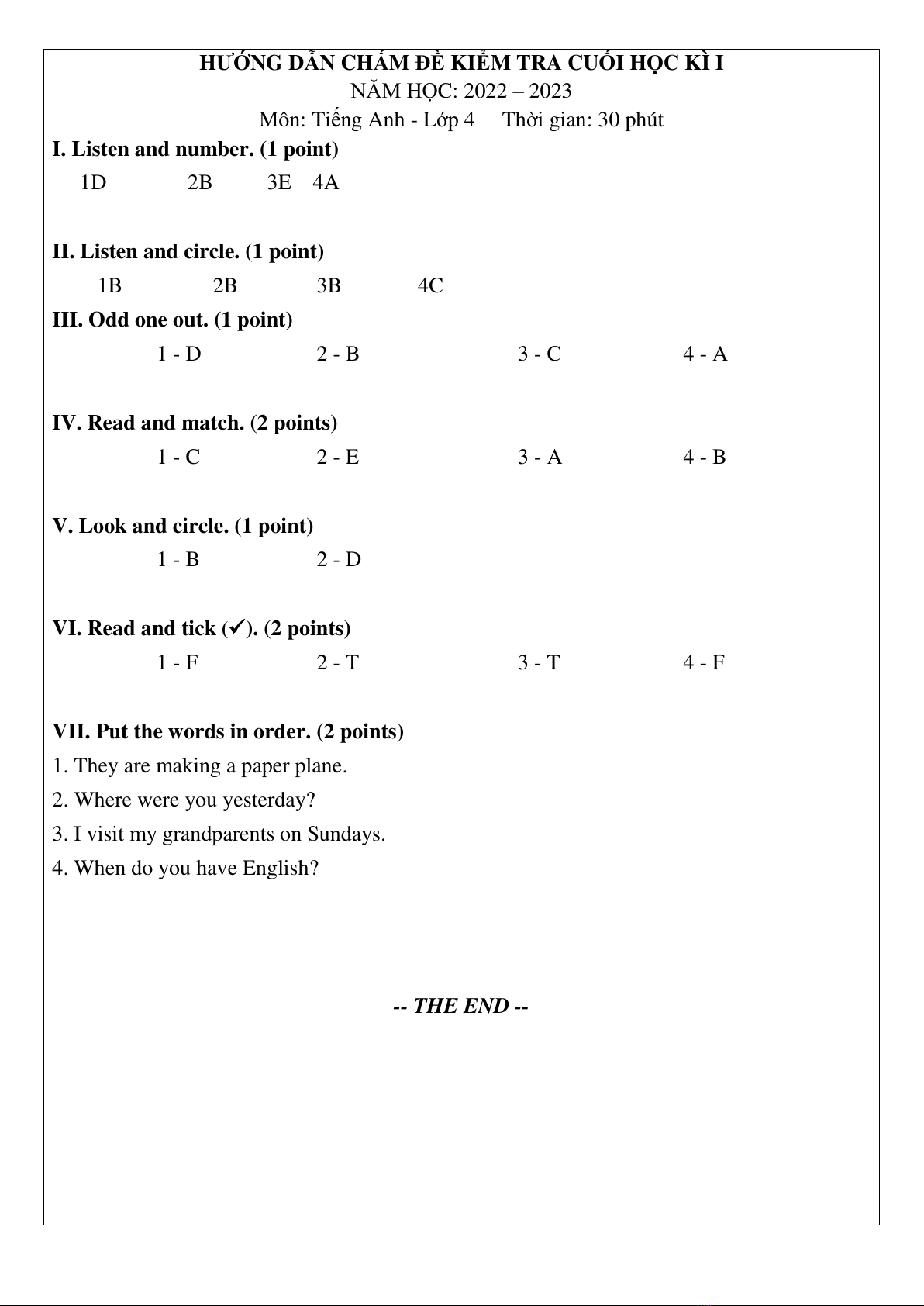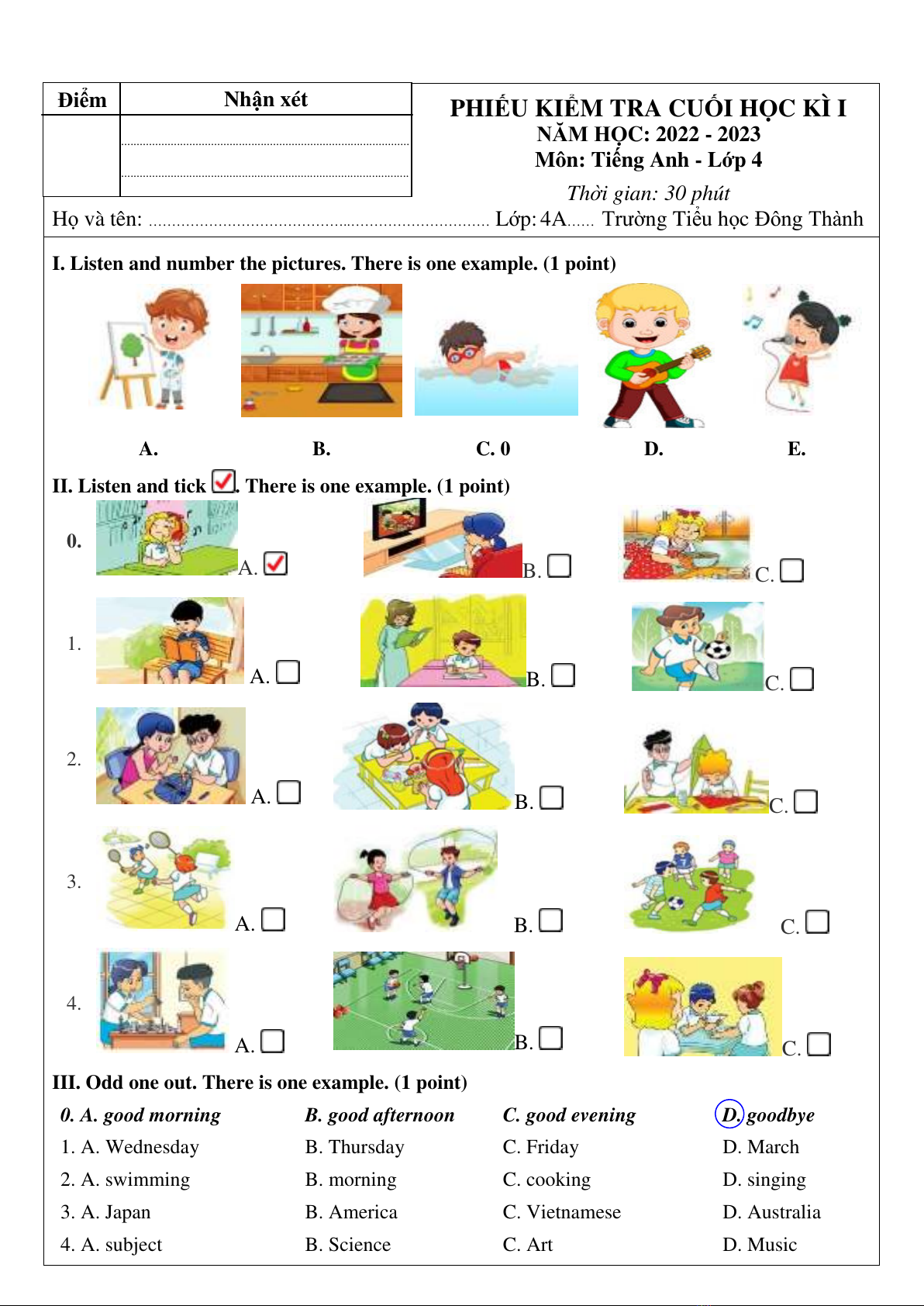 Môn: Tiếng Anh - Lớp 4 Thời gian: 30 phút