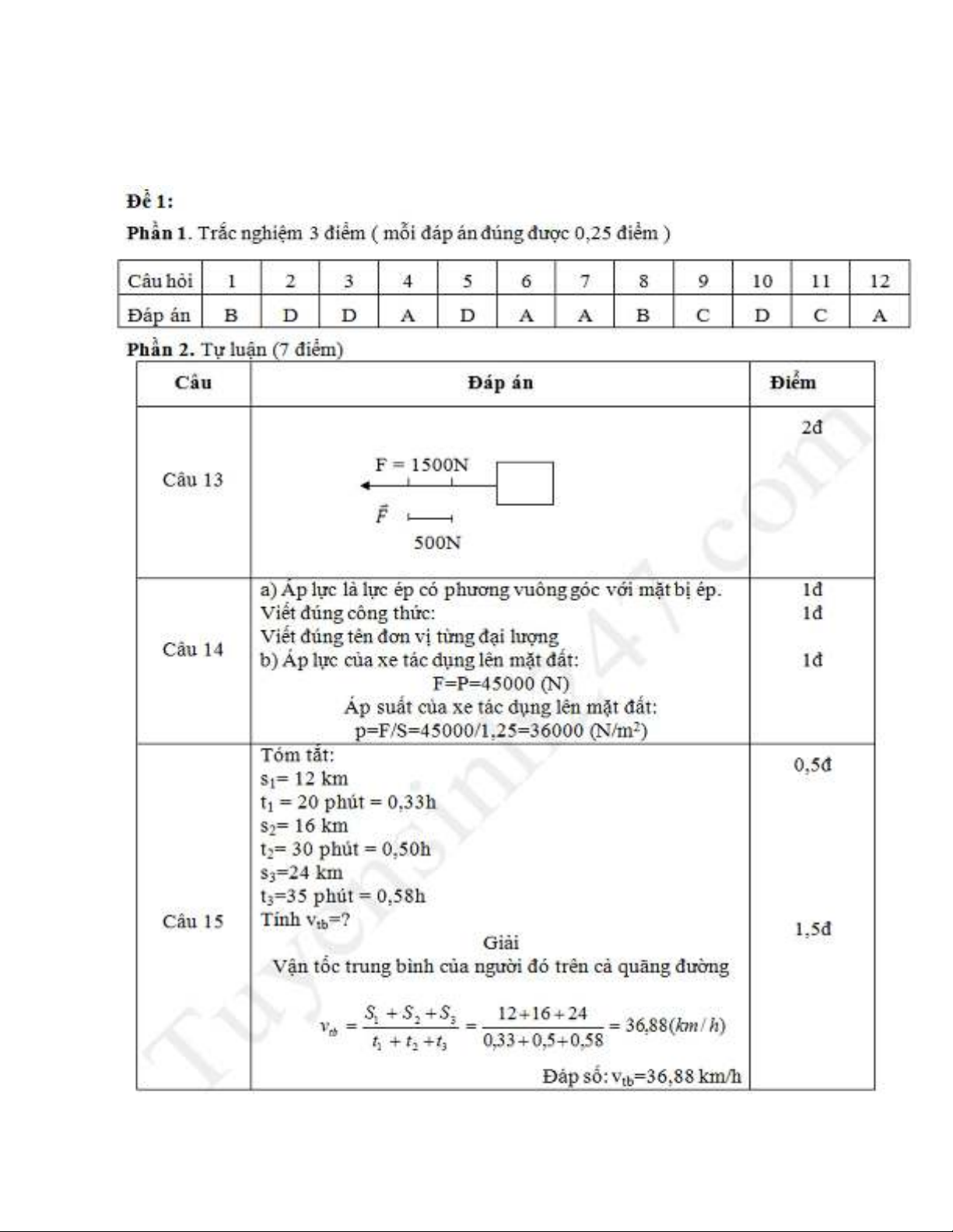 Đáp án đề thi kì 1 lớp 8 môn Lý THCS n Định năm 2017 - 2018