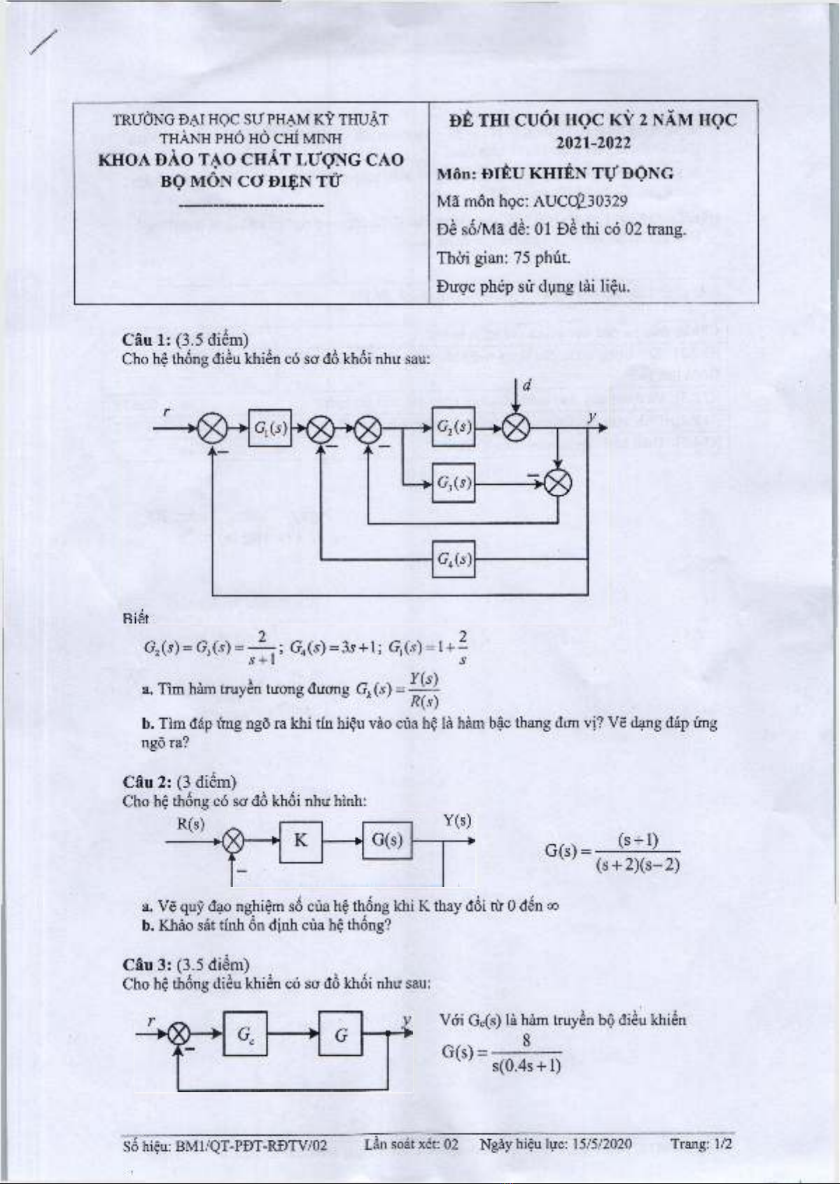 TRƯỜNG ĐẠI HỌC SƯ PHẠM KỶ THUẬT ĐỀ THI CUÓI HỌC KỲ 2 NĂM HỌC