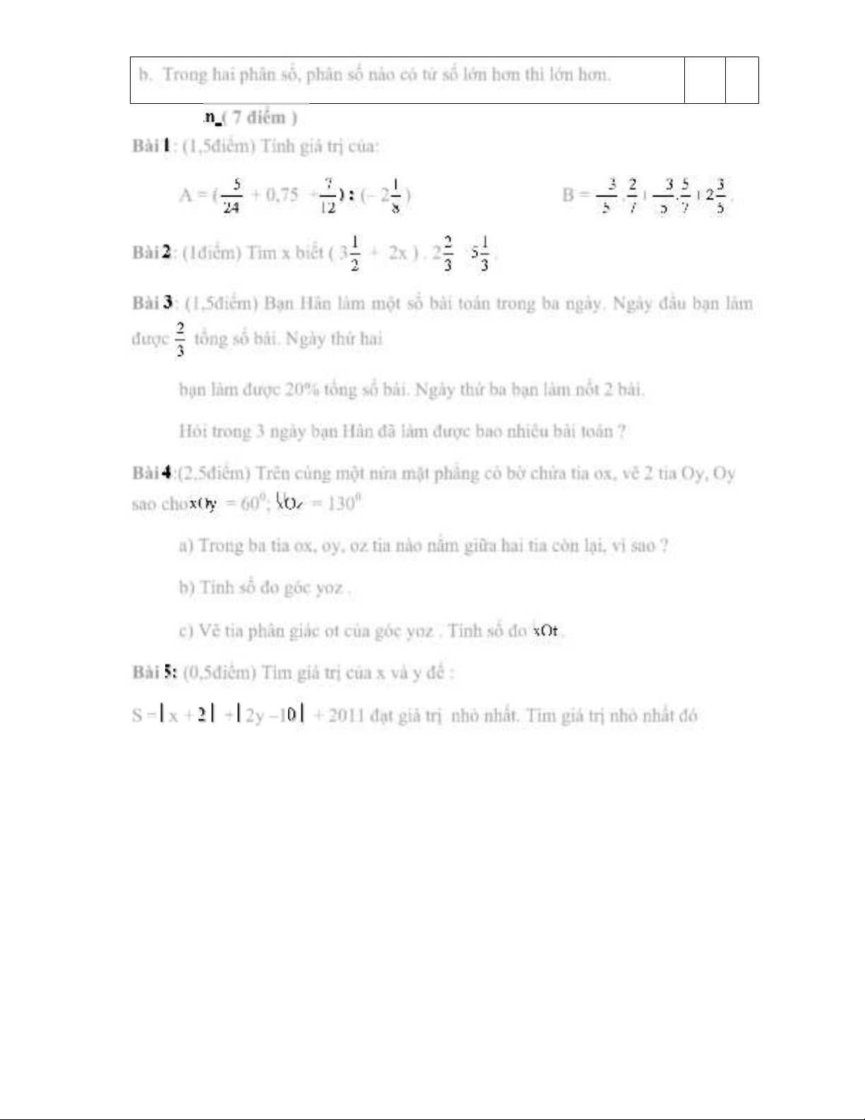 Bài 4:(2,5điểm) Trên cùng một nửa mặt phẳng có bờ chứa tia ox, vẽ 2 tia Oy, Oy