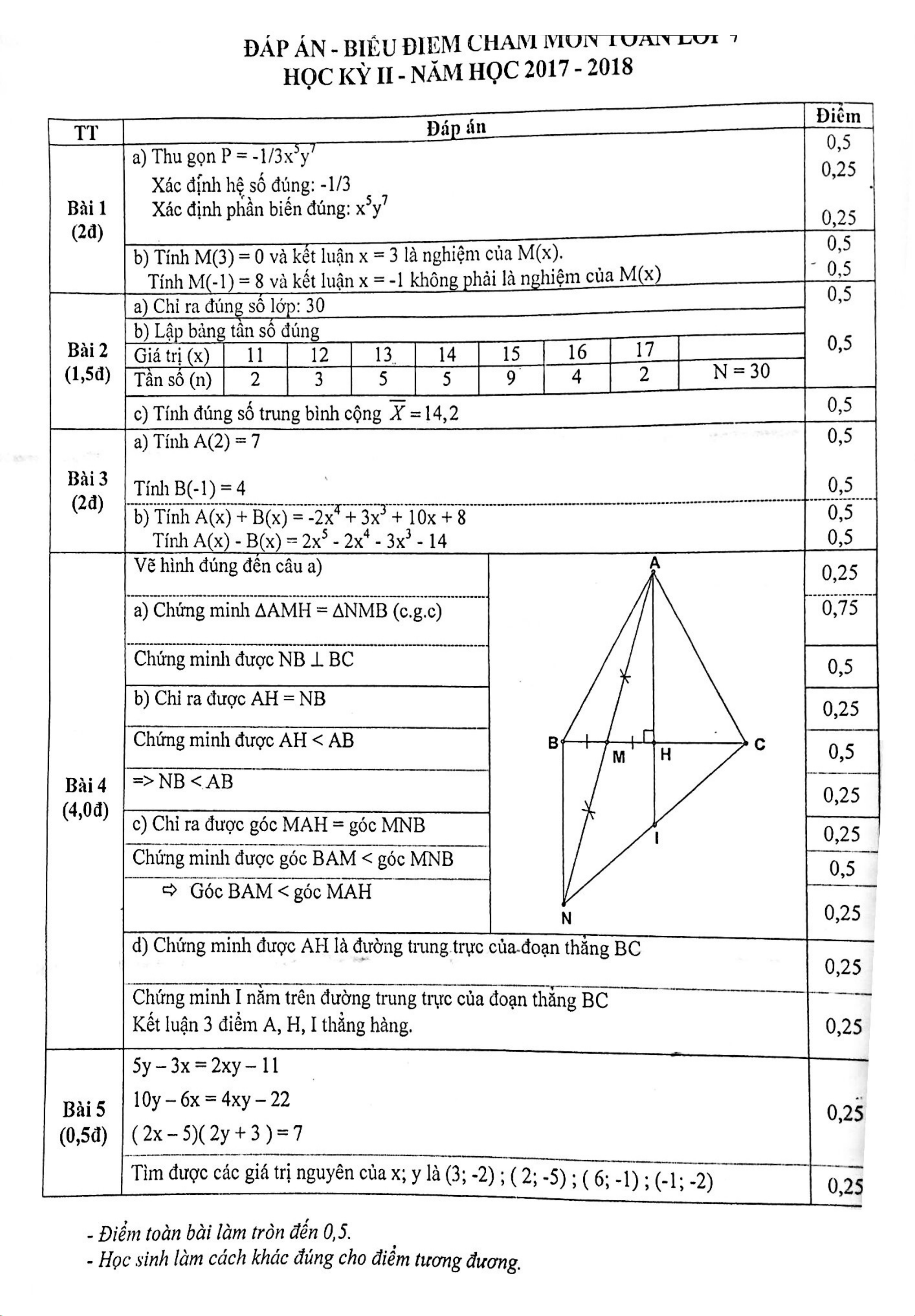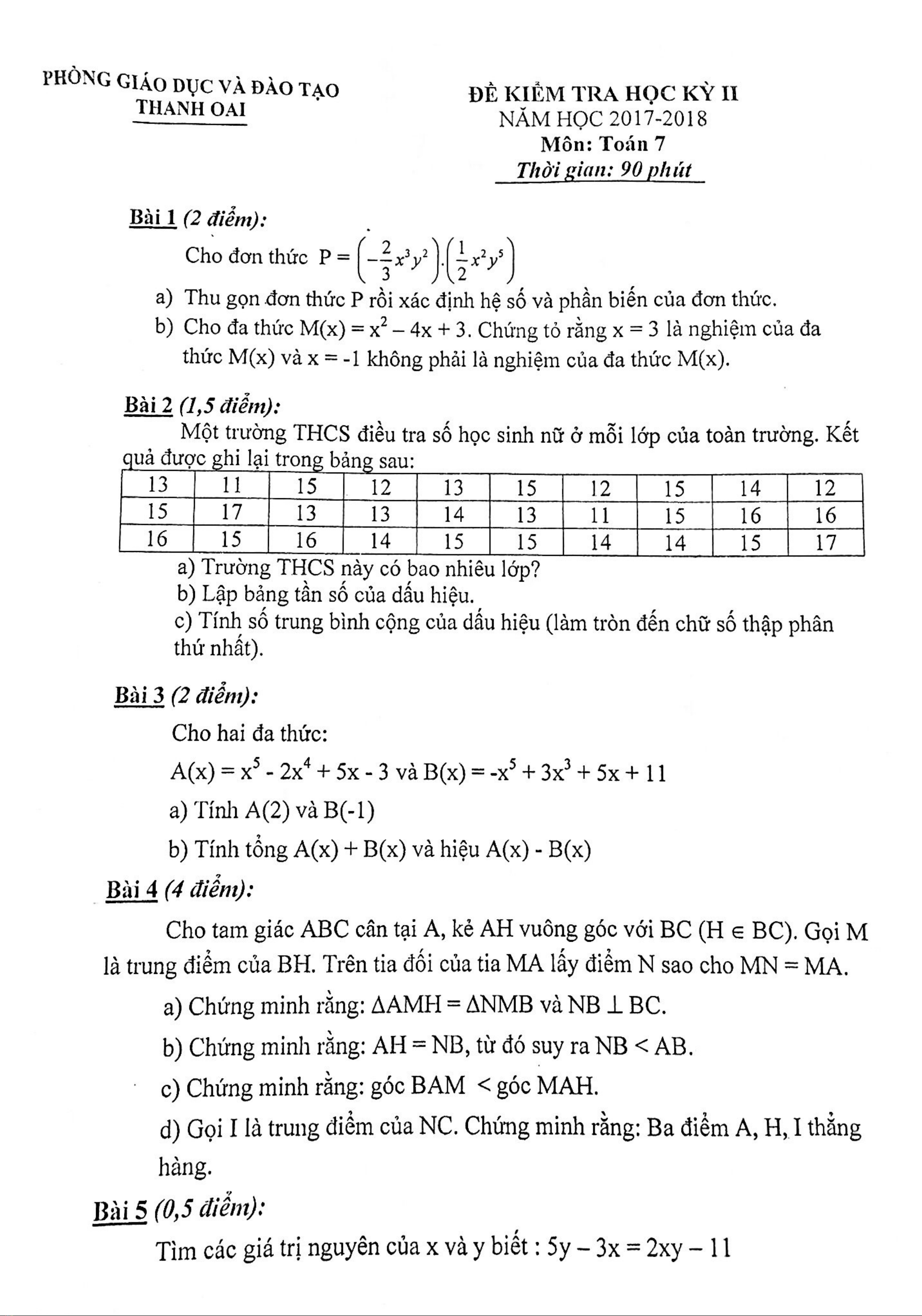 Đề thi học kì 2 lớp 7 môn Toán năm 2018 có đáp án - Phòng GD&ĐT Thanh Oai