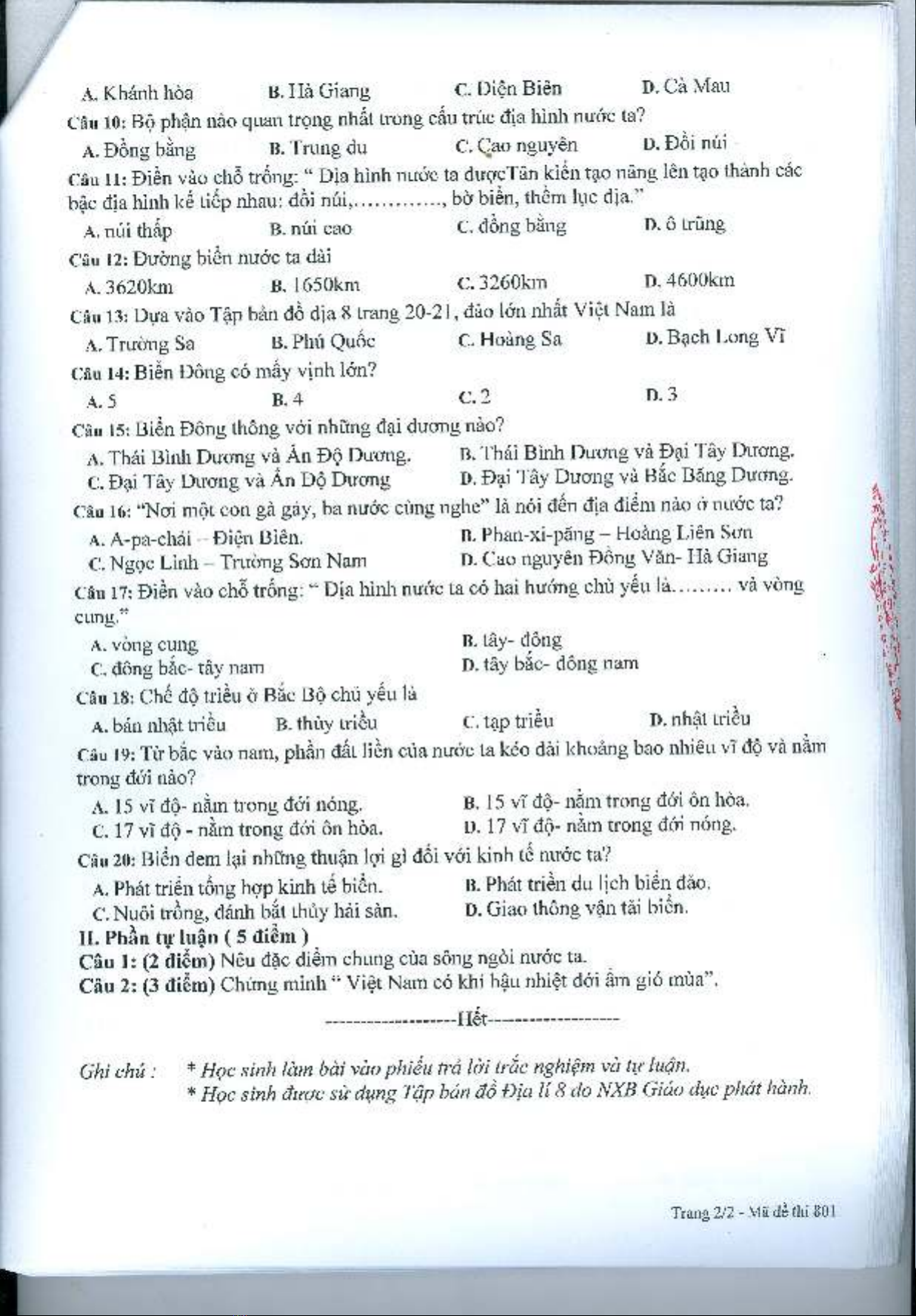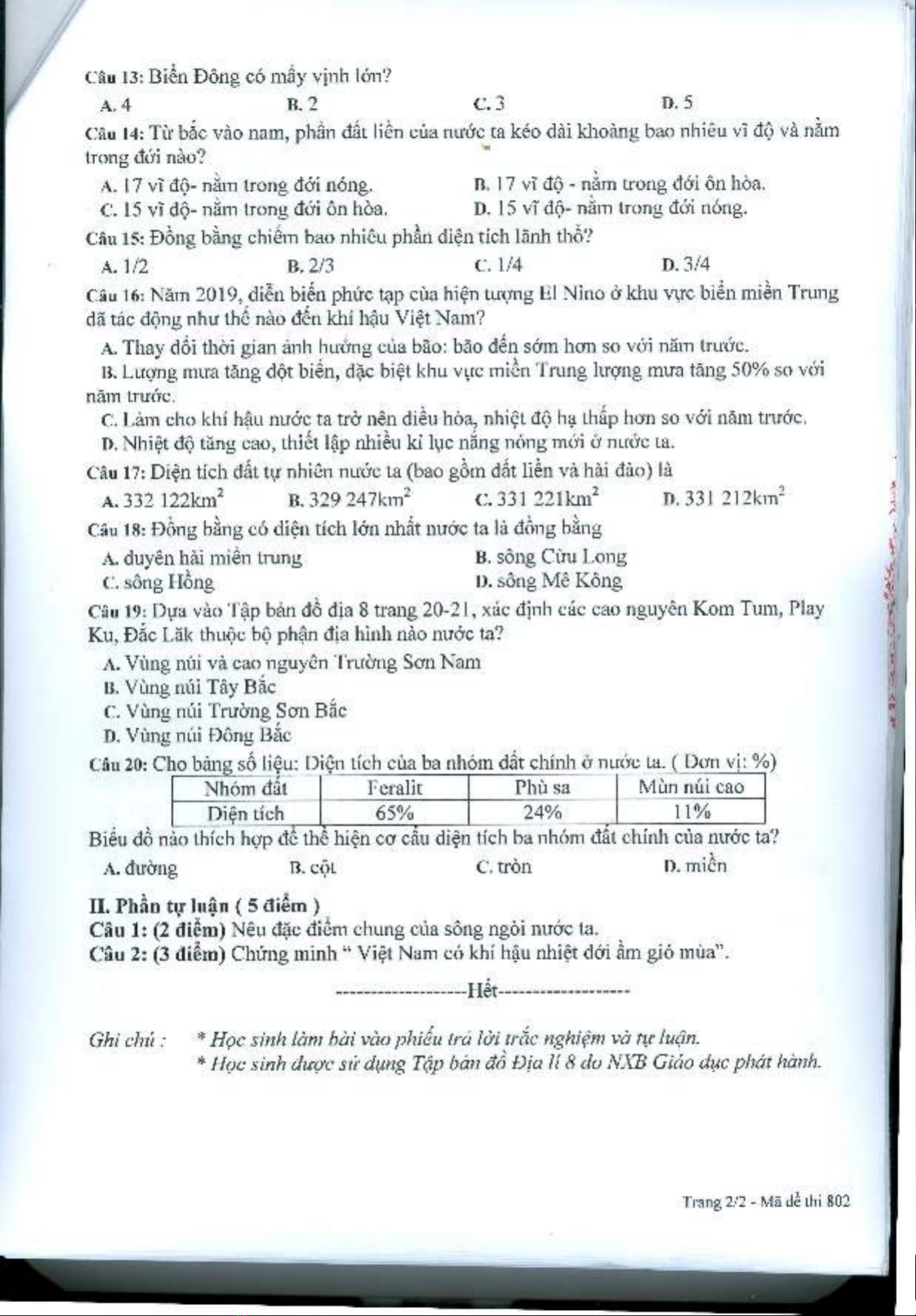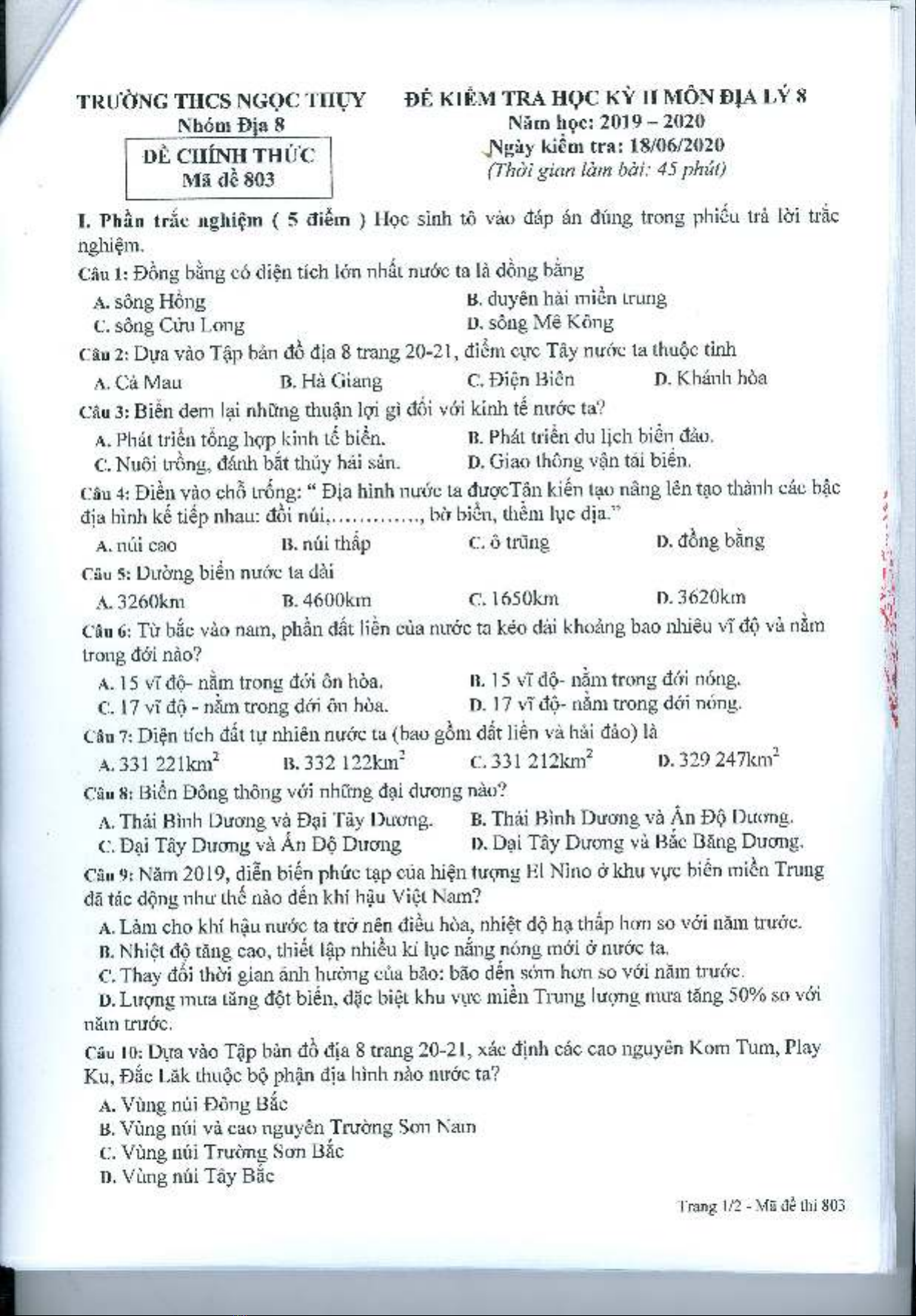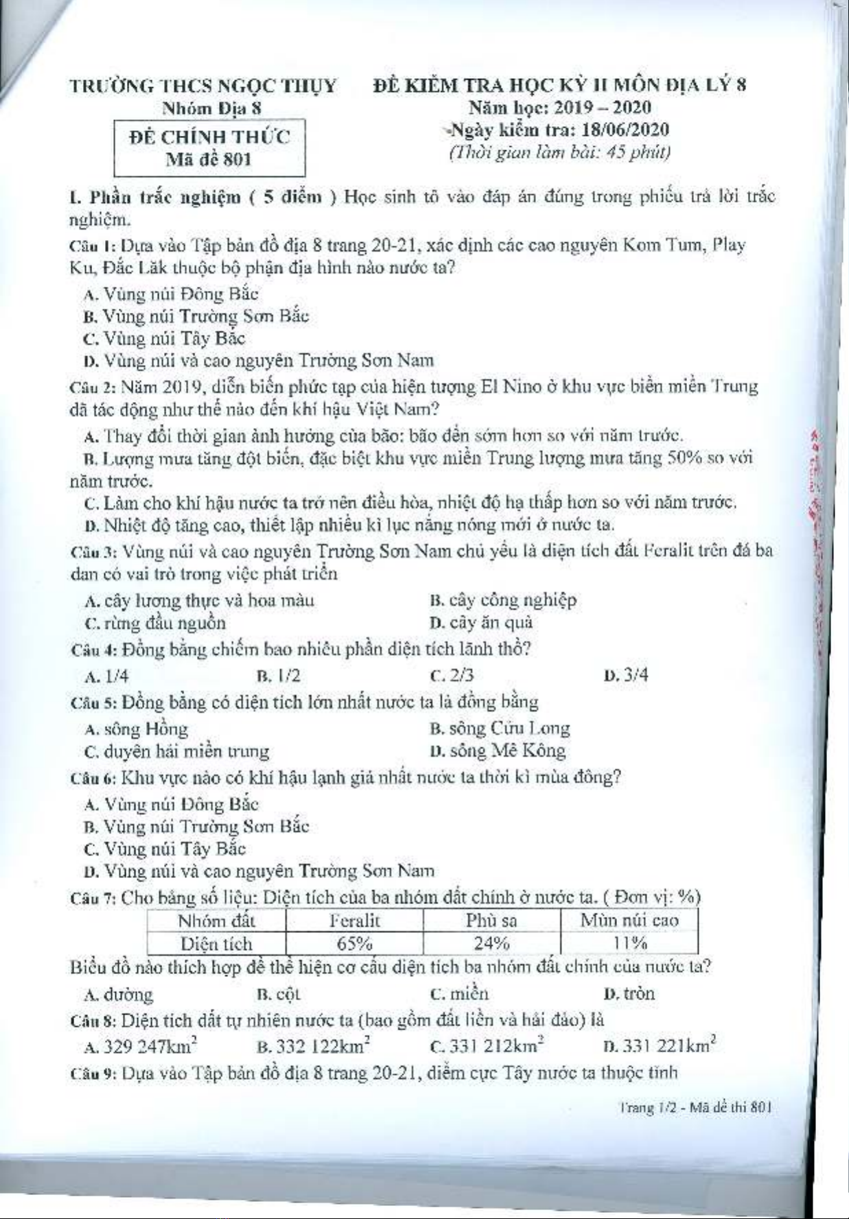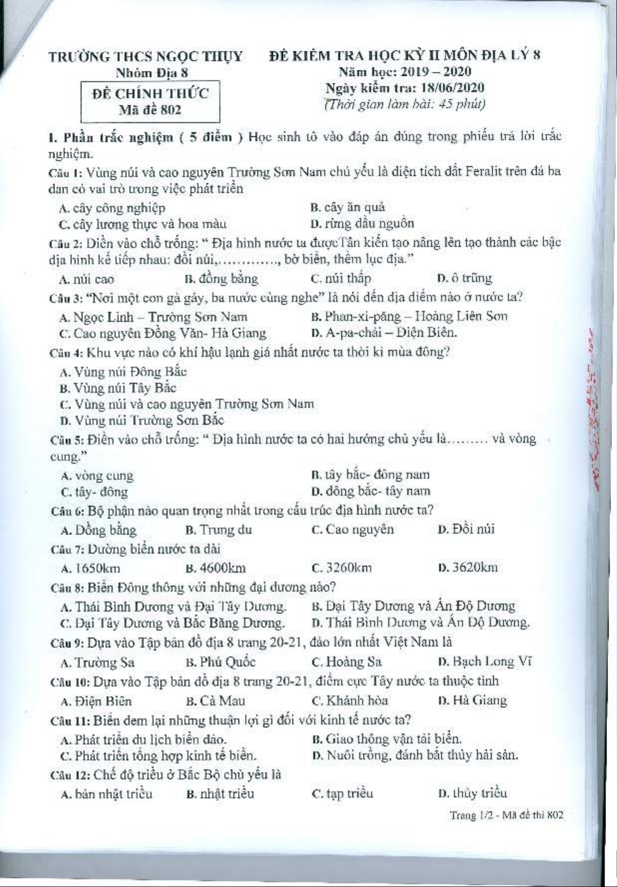 Đề thi học kì 2 môn Địa lý lớp 8 năm 2019-2020 – Trường THCS Ngọc Thụy