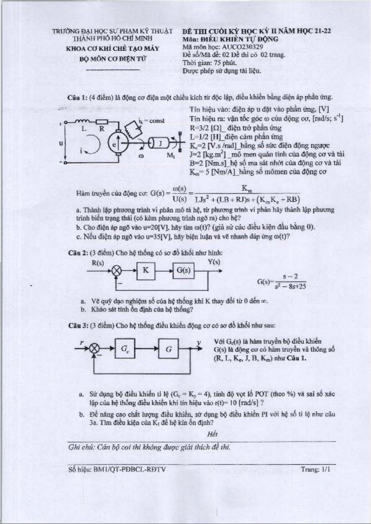 Câu 1:(4 điểm) là động cơ điện một chiều kích tìr độc lập, điều khiển bằng điện áp phần ứng.
