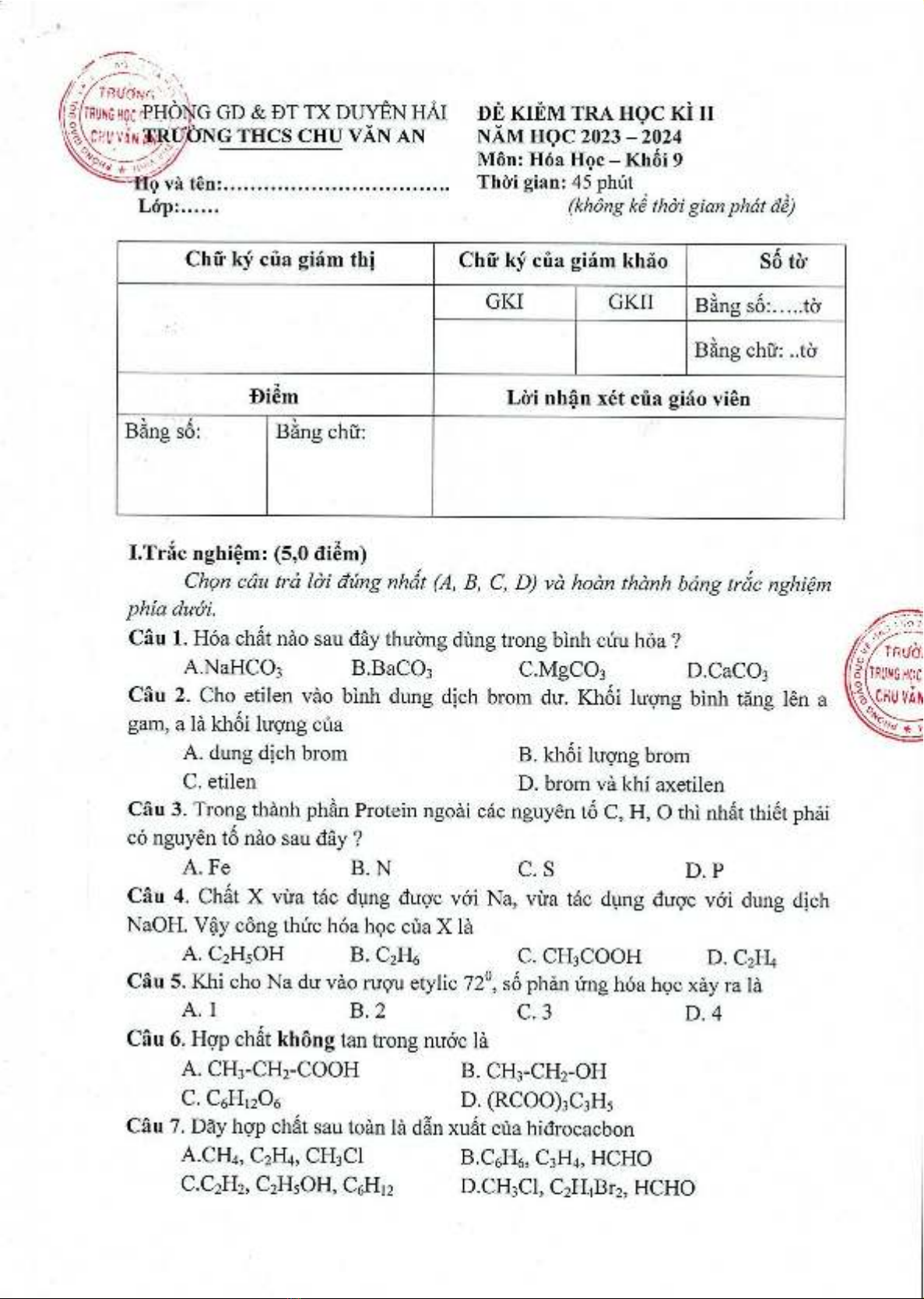 Đề thi học kì 2 môn Hóa học lớp 9 năm 2023-2024 - Trường THCS Chu Văn An, Duyên Hải