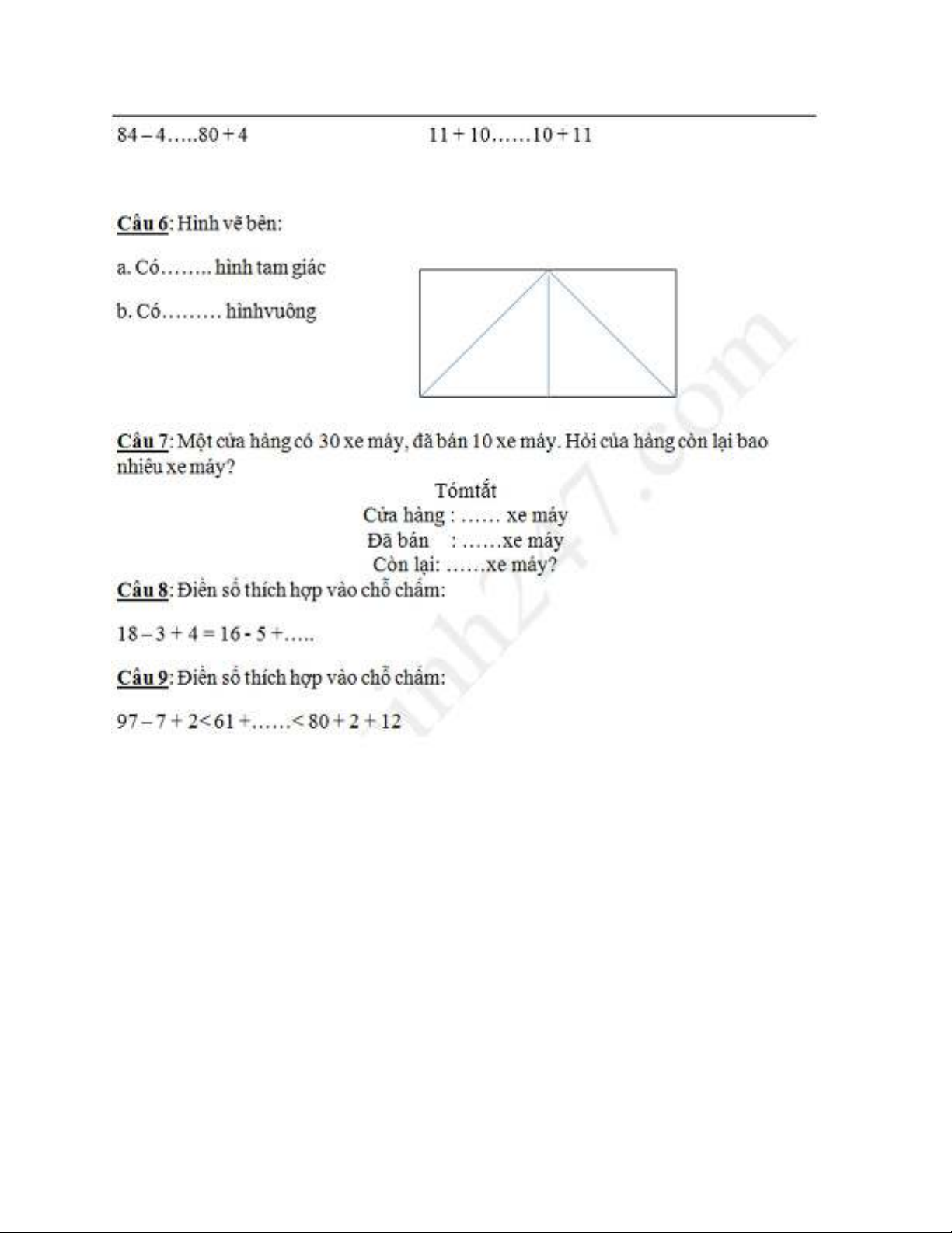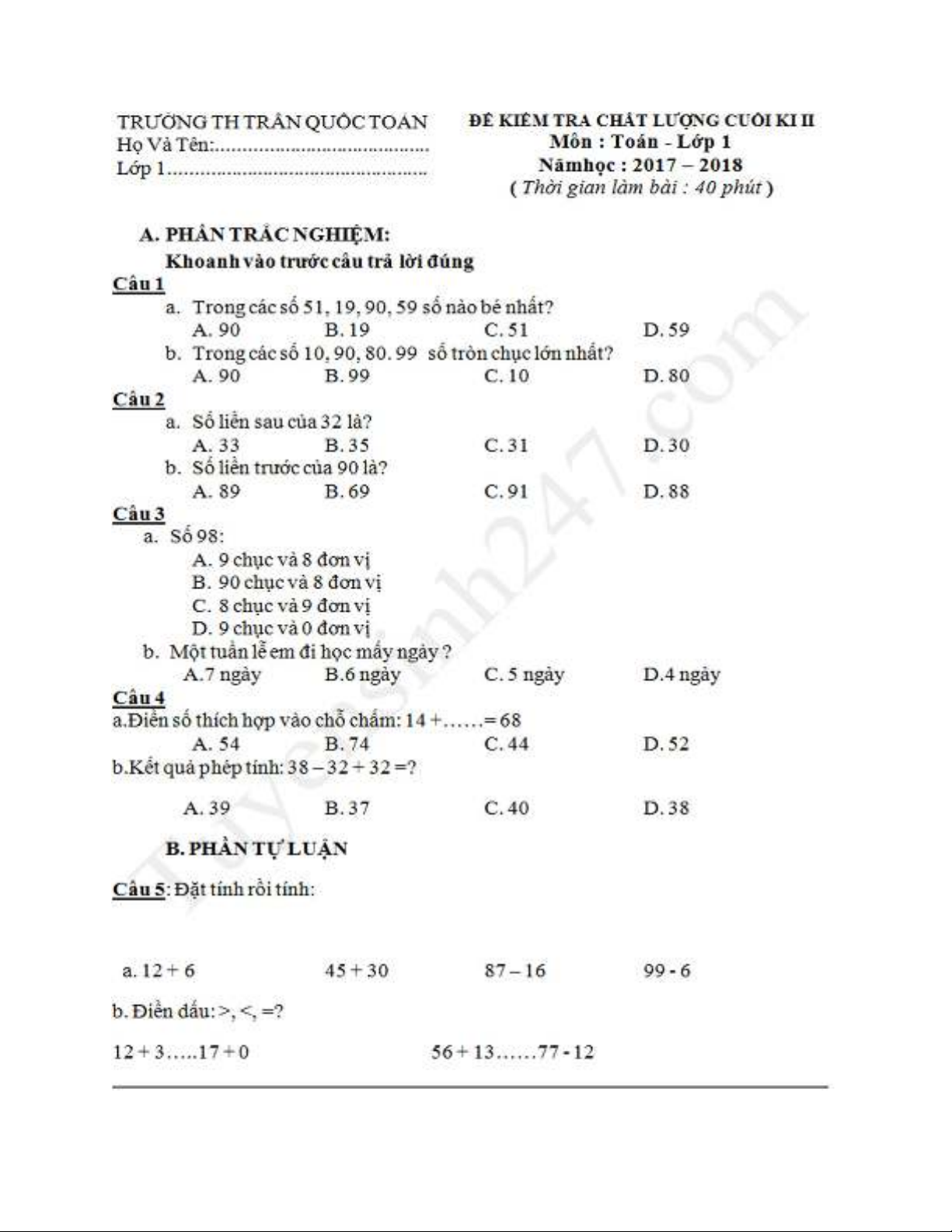 "Đề thi học kì 2 môn Toán lớp 1 năm 2017-2018 - Trường Tiểu học Trần Quốc Toản" này giúp các em học sinh ôn tập kiến thức, ôn tập kiểm tra, thi cuối kỳ, rèn luyện kỹ năng để các em nắm được toàn bộ kiến thức chương trình Toán lớp 1. Chúc các ôn tập thật tốt!