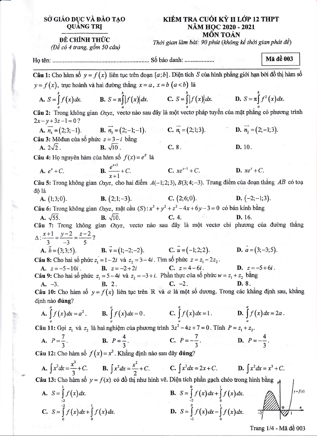 Cf,u 13: Cho him s6 y = /(x) c6 A6 tni nhu hinh v6. DiQn tich phAn gpch ch6o trong hinh bang