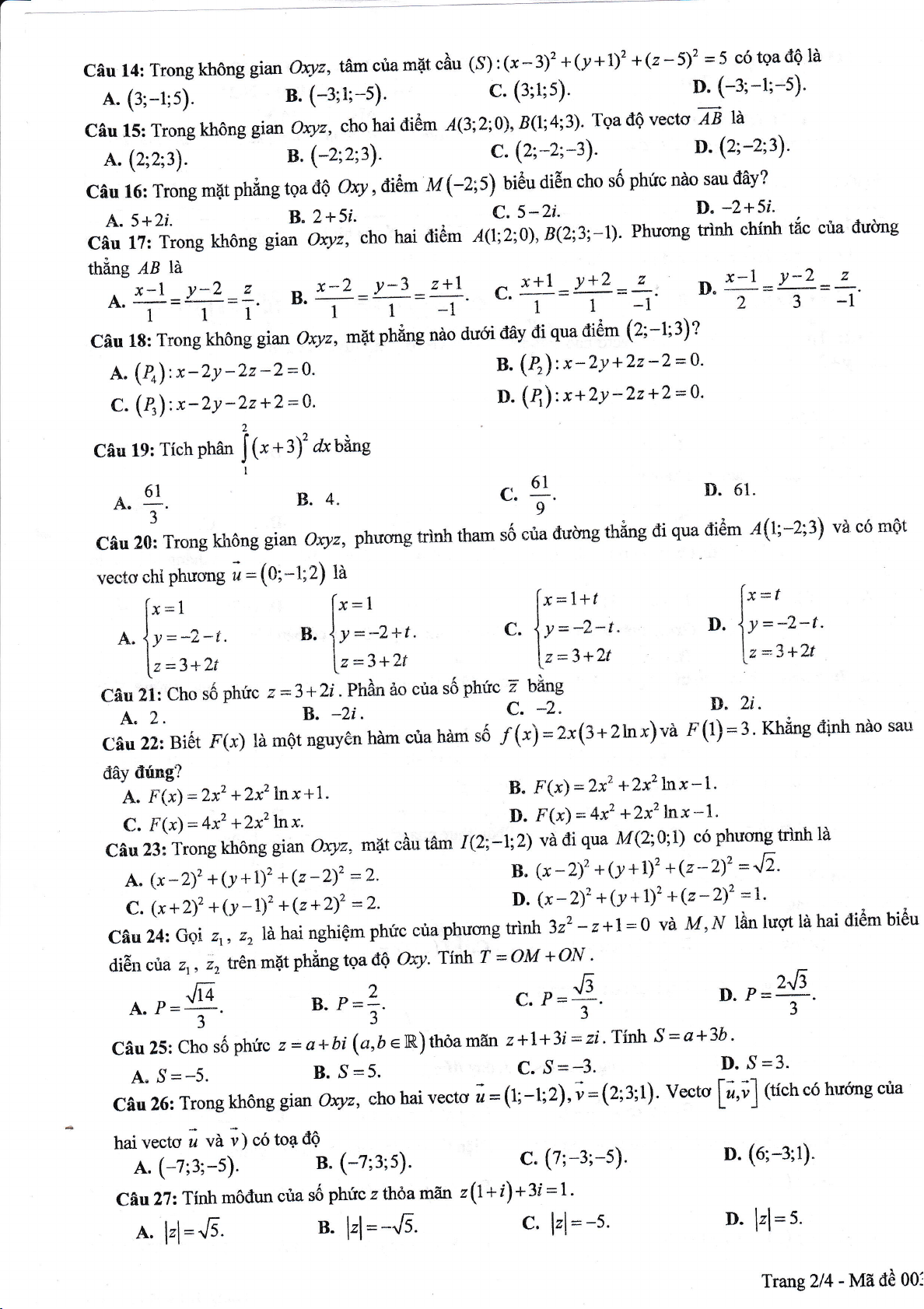 Cflu 14: Trong kh6ng gian Ox-vz, tam ctra rnflt cAu (.9): (x- 3)' +(y+1)2 + (' -5)'= 5 c6 t9a d0 li