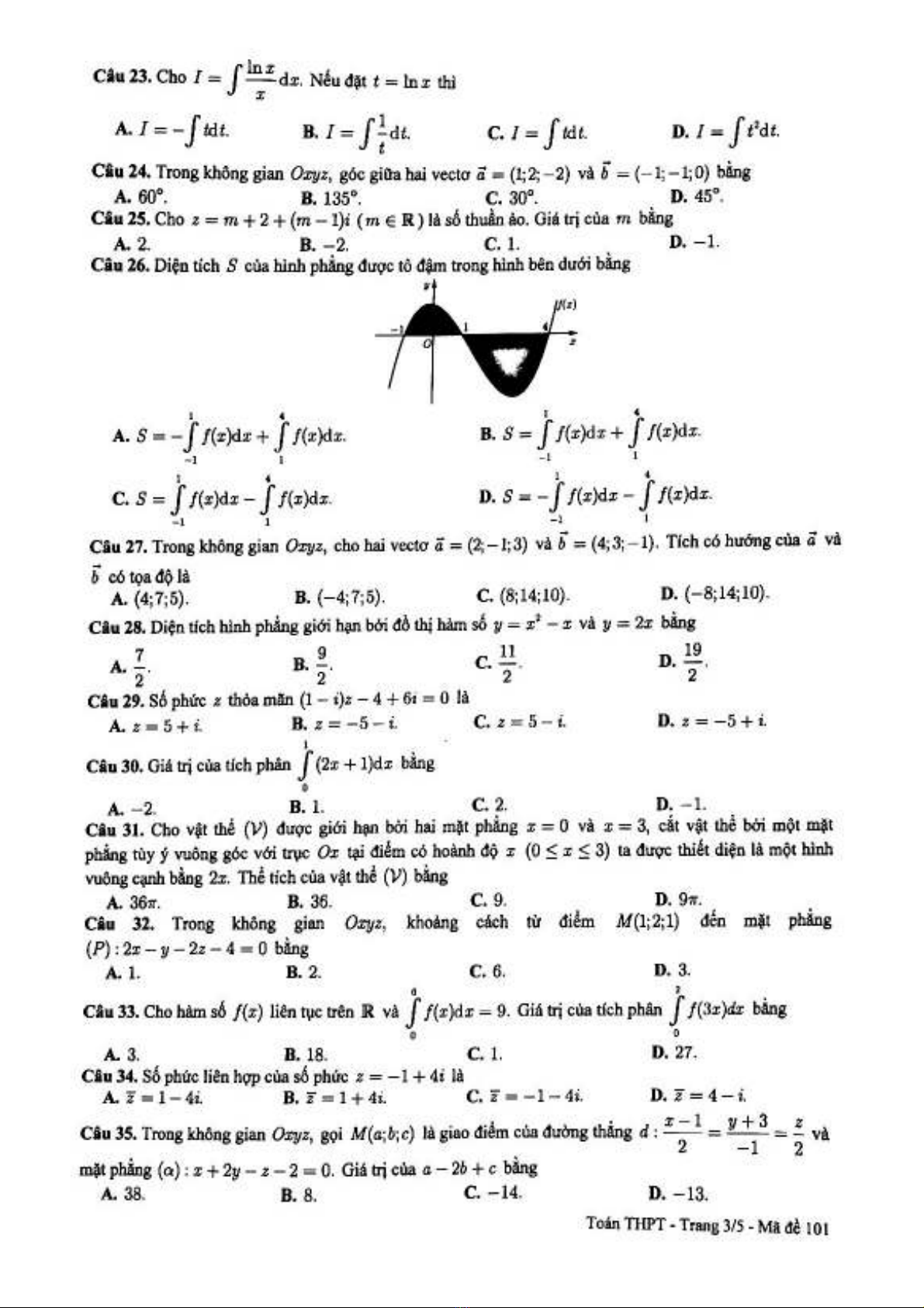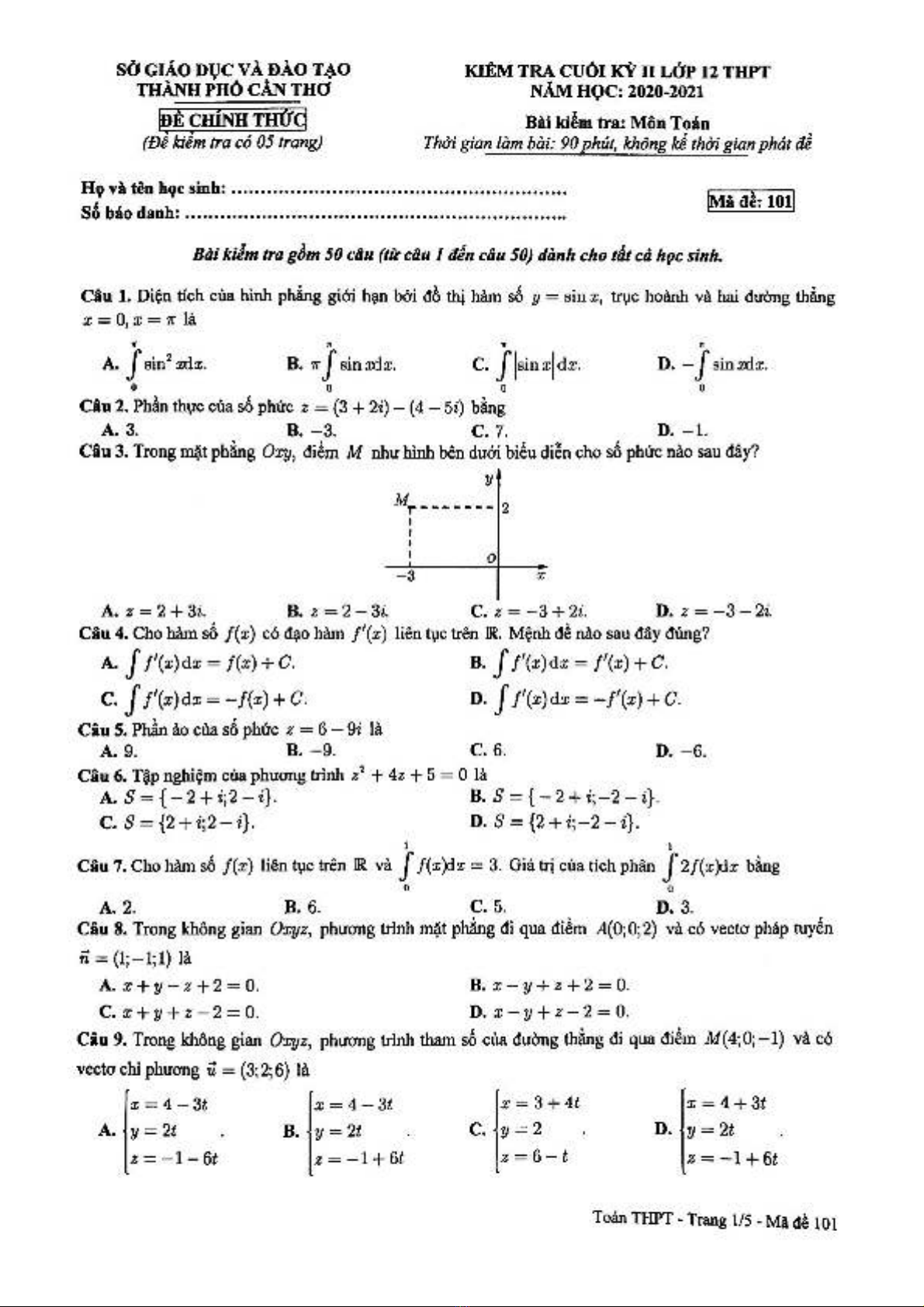 Đề thi học kì 2 môn Toán lớp 12 năm 2020-2021 có đáp án - Sở GD&ĐT thành phố Cần Thơ