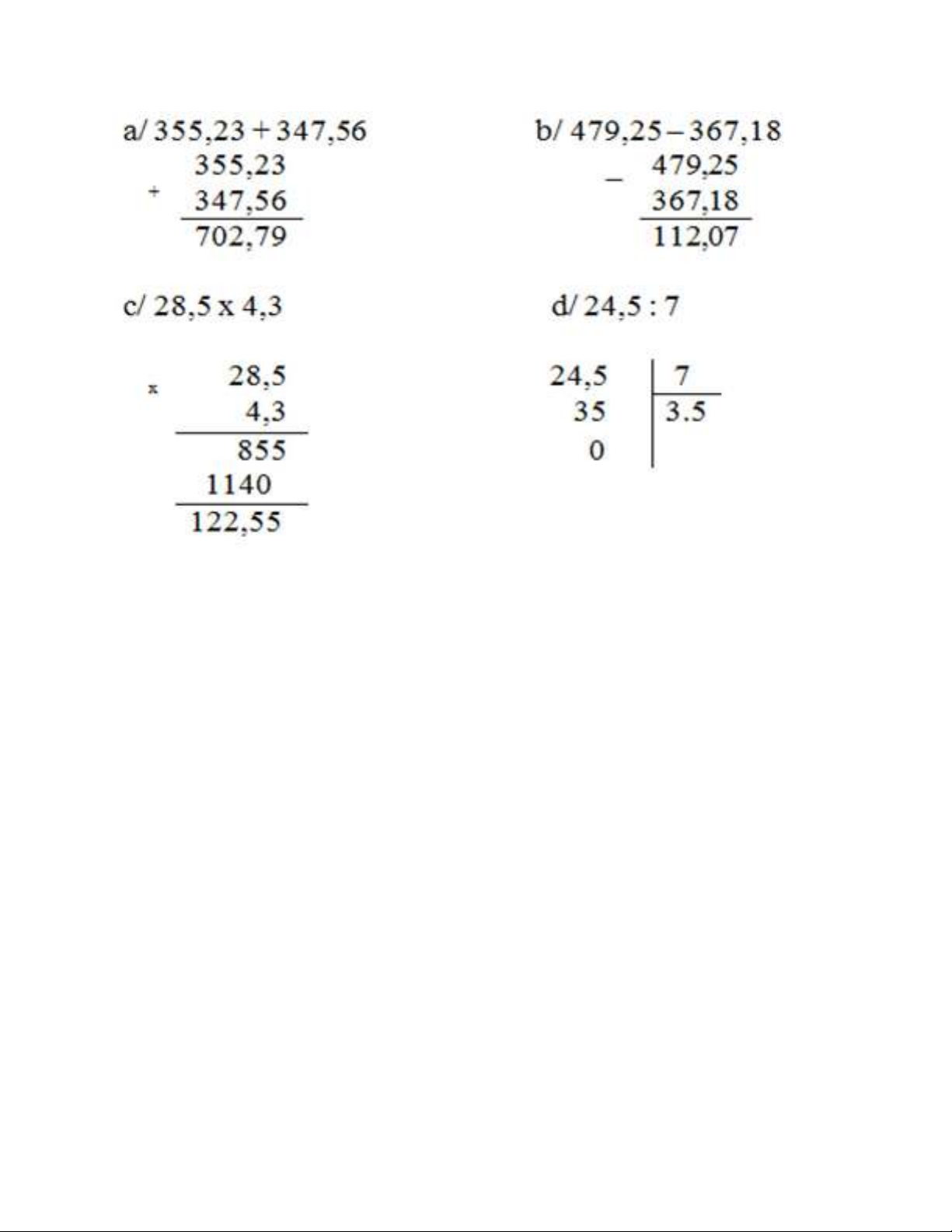 a/ 355,23 + 347,56 b/ 479,25 – 367,18