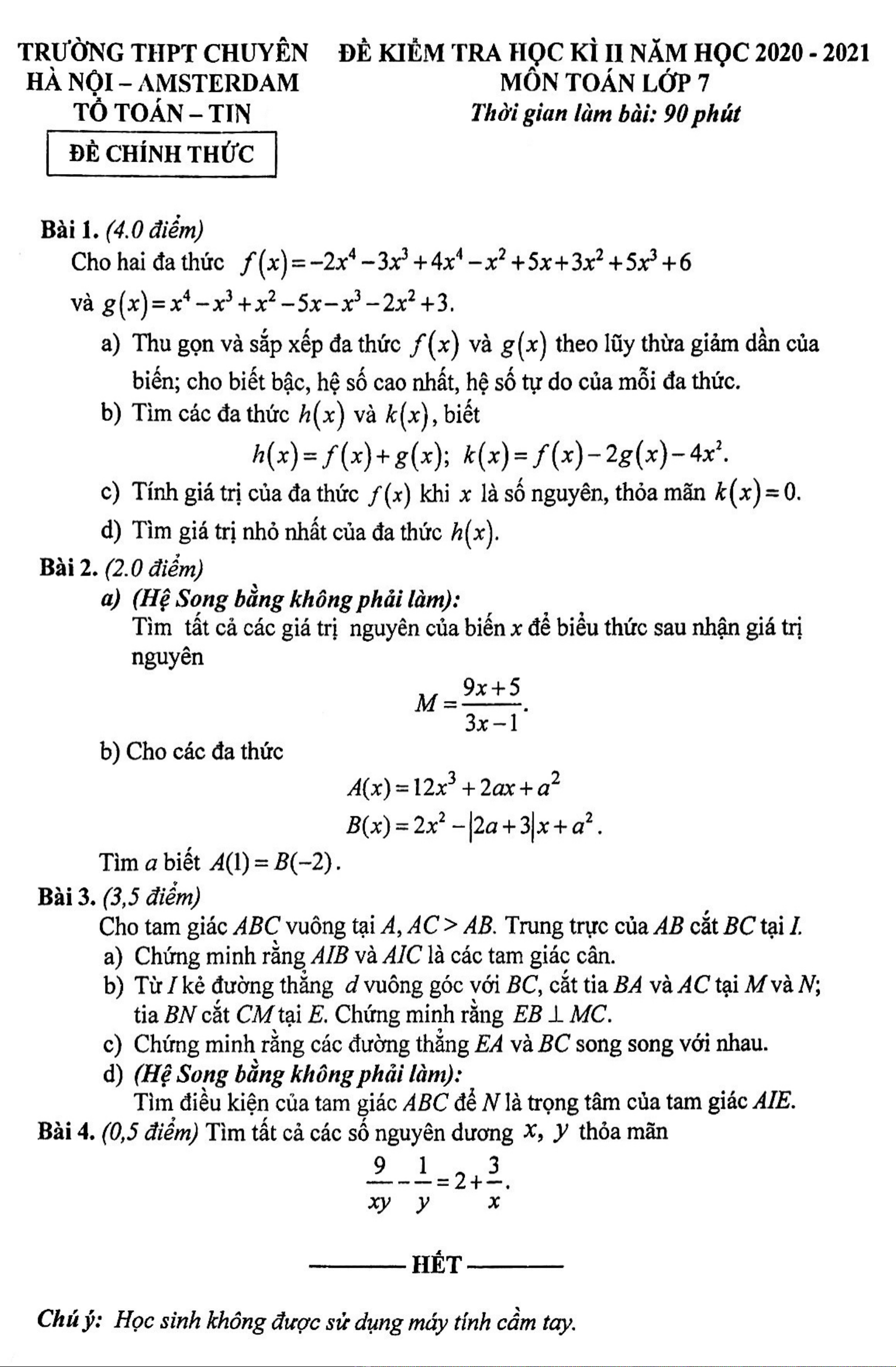 Đề thi học kì 2 môn Toán lớp 7 năm 2020-2021 - Trường THPT chuyên Hà Nội – Amsterdam