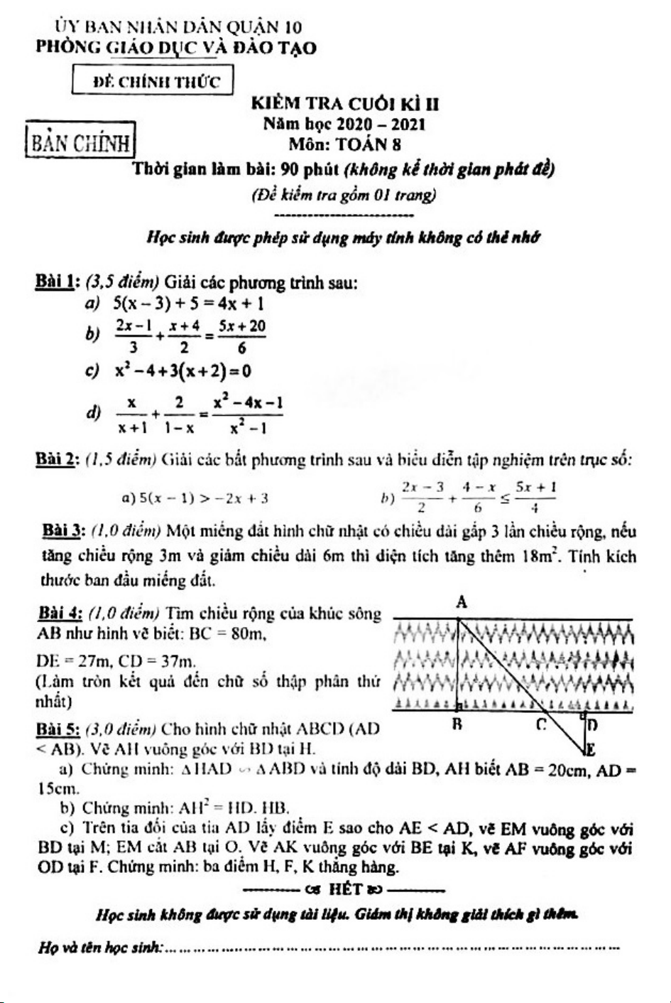 Đề thi học kì 2 môn Toán lớp 8 năm 2020-2021 - Phòng GD&ĐT Quận 10