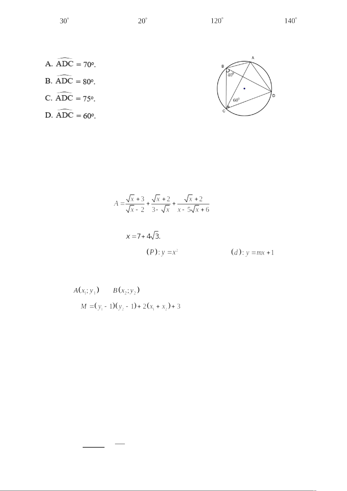 Câu 10. Tứ giác ABCD nội tiếp đường tròn có . Khi đó bằng