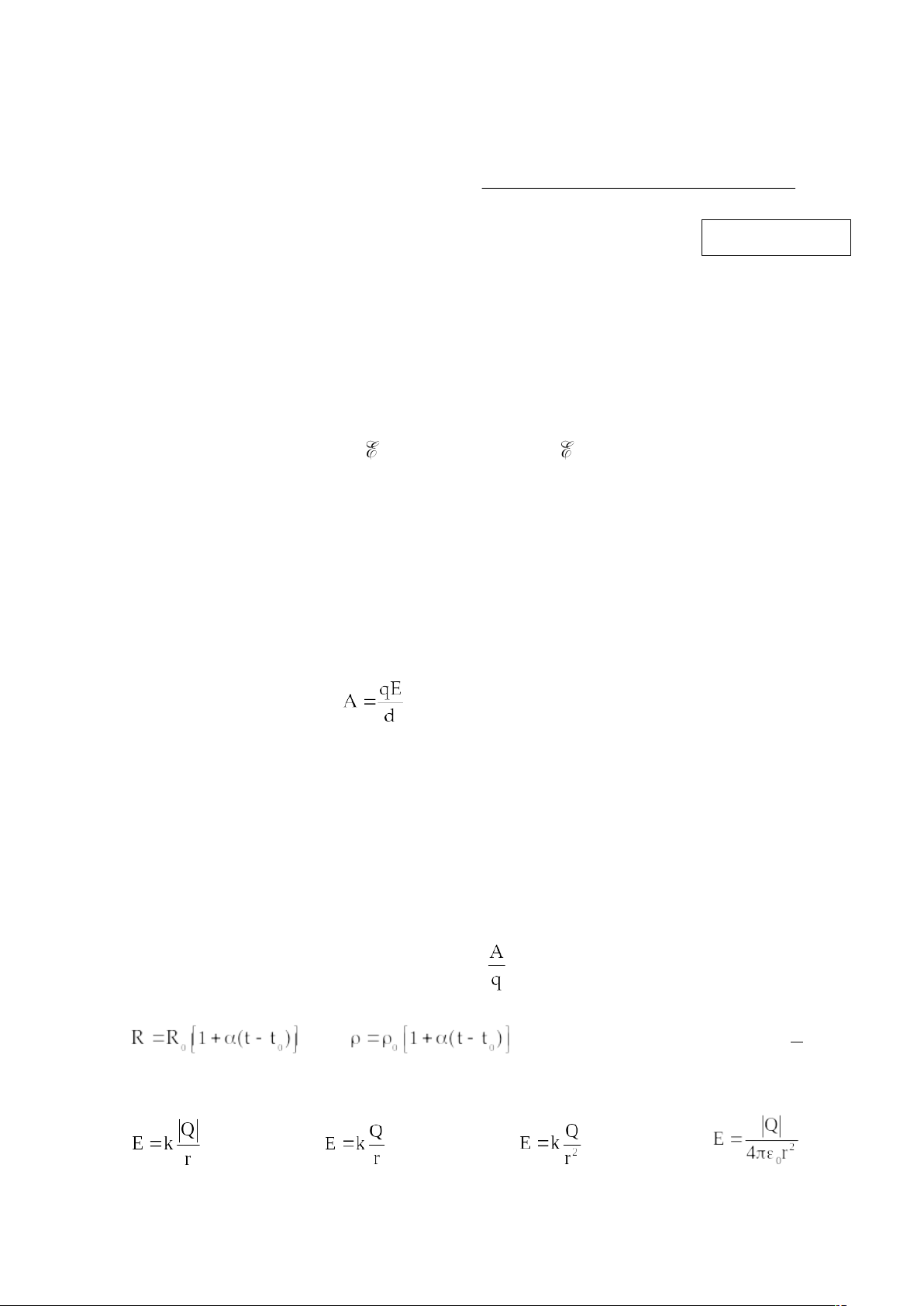 Câu 9: Công thức tính độ lớn cường độ điện trường do Q gây ra tại 1 điểm cách điện tích