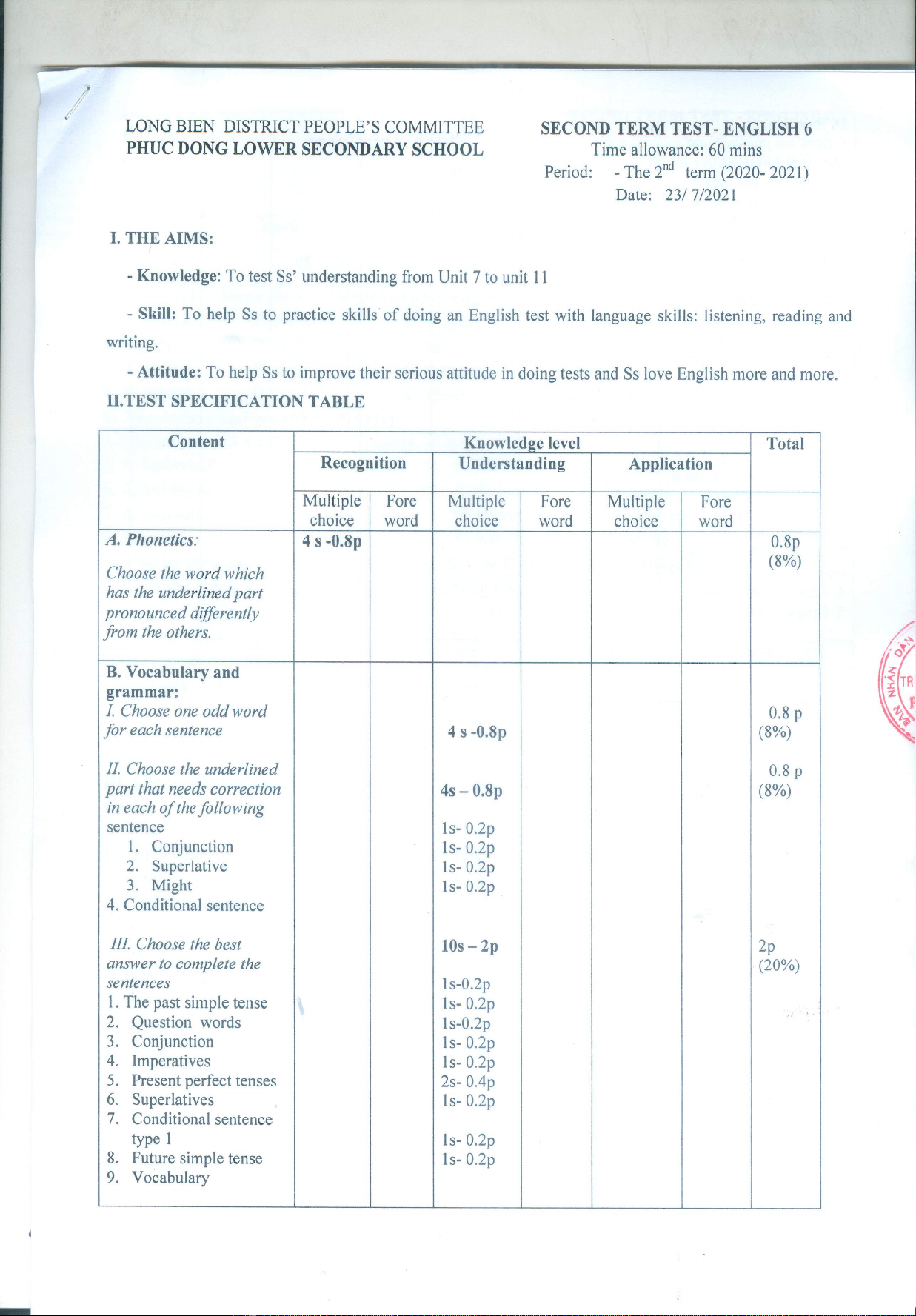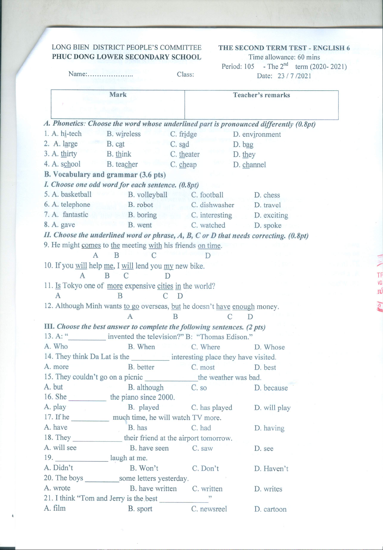 Để hệ thống lại kiến thức cũ, trang bị thêm kiến thức mới, rèn luyện kỹ năng giải đề nhanh và chính xác cũng như thêm tự tin hơn khi bước vào kì kiểm tra HK2 sắp đến, mời các bạn học sinh cùng tham khảo “Đề thi học kì 2 môn Tiếng Anh lớp 6 năm 2020-2021 có đáp án - Trường THCS Phúc Đồng” làm tài liệu để ôn tập. Chúc các bạn làm bài kiểm tra tốt!