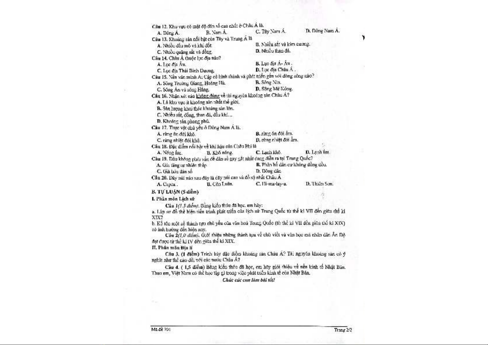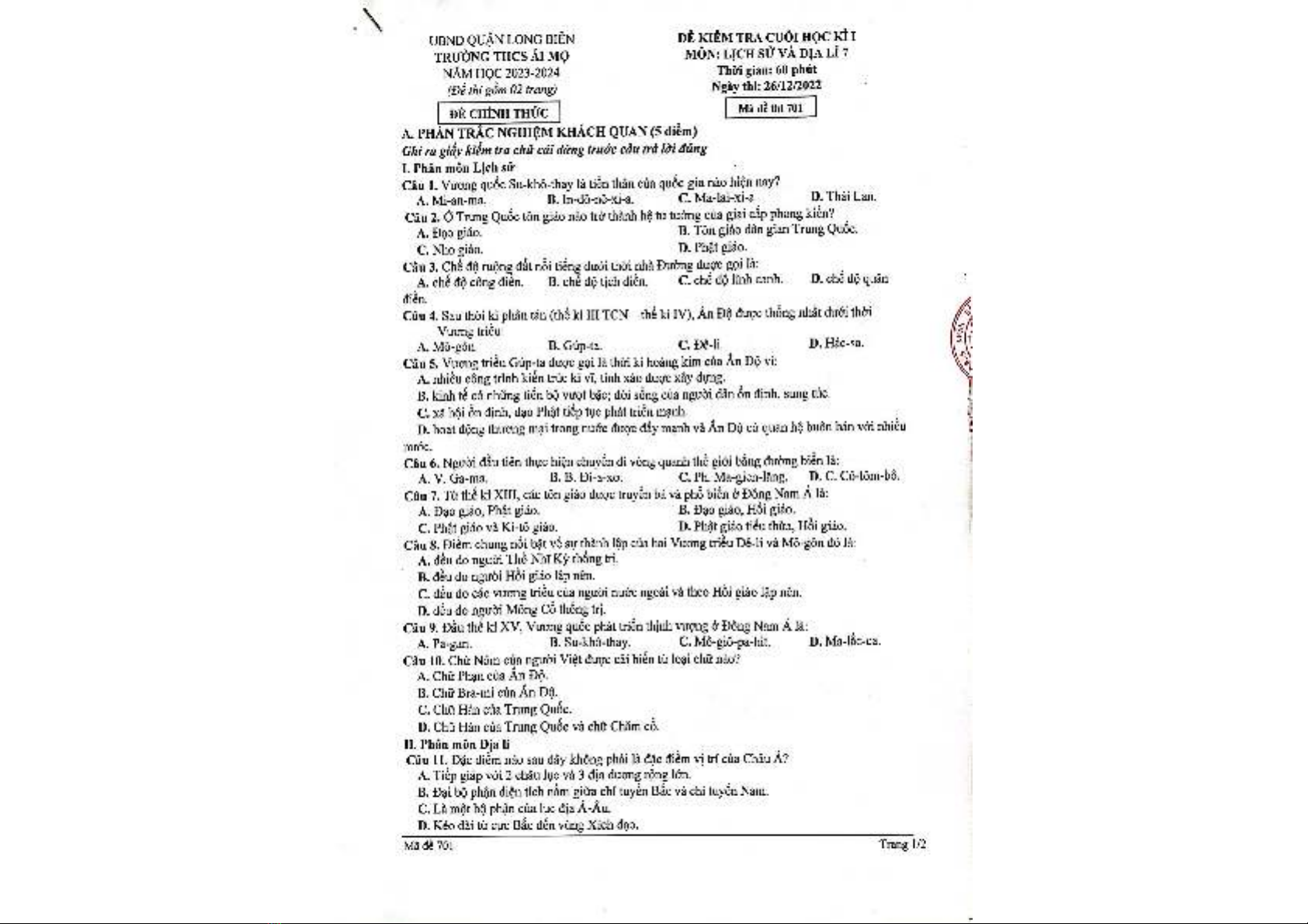 Đề thi học kì 1 môn Lịch sử và Địa lí lớp 7 năm 2023-2024 - Trường THCS Ái Mộ, Long Biên