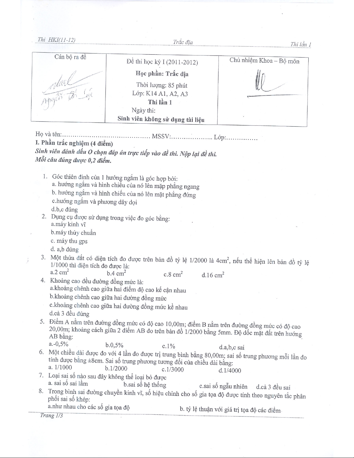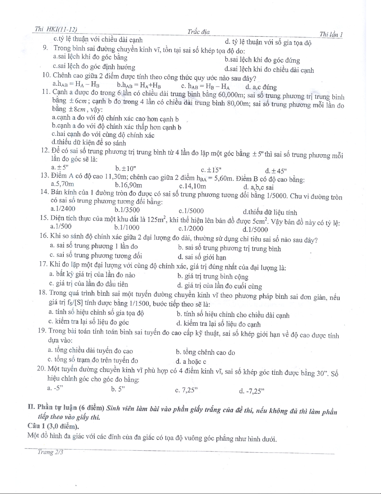 Đề thi học kỳ 1 học phần trắc địa