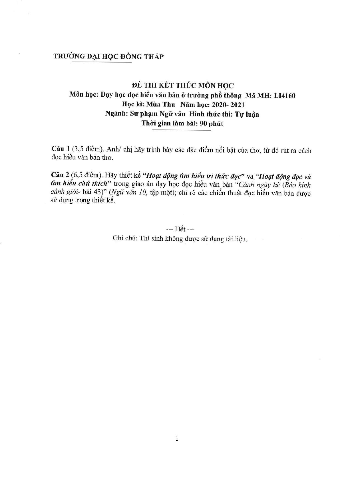 Đề thi kết thúc học phần học kì 1 môn Dạy học đọc hiểu văn bản ở trường phổ thông năm 2020-2021 có đáp án - Trường ĐH Đồng Tháp