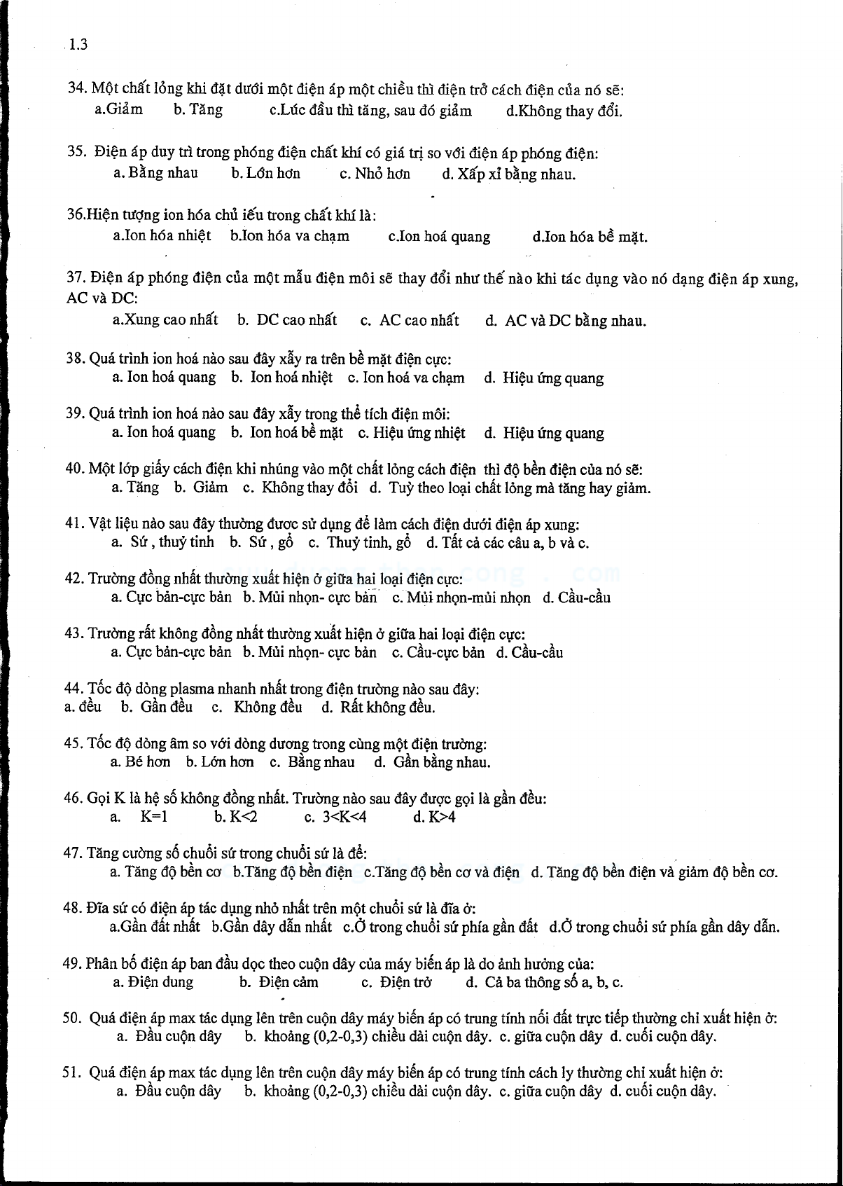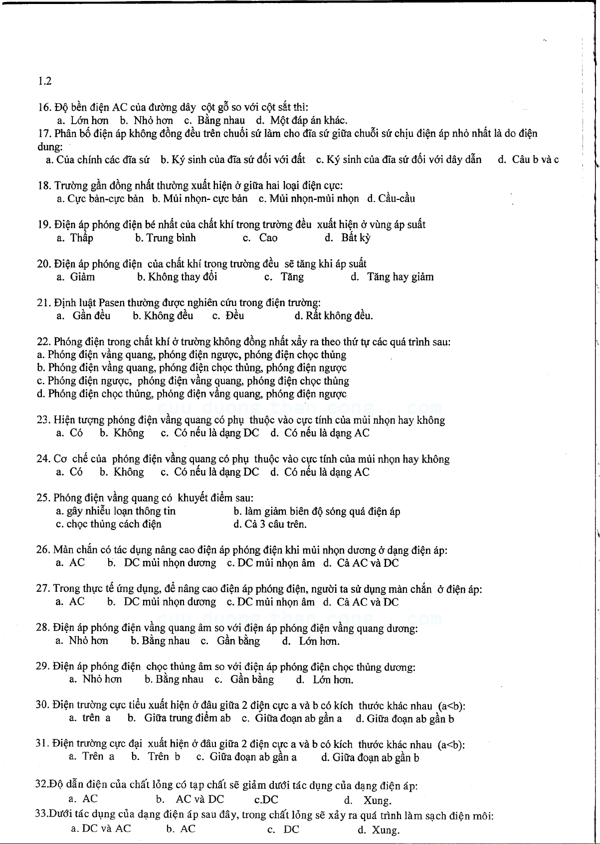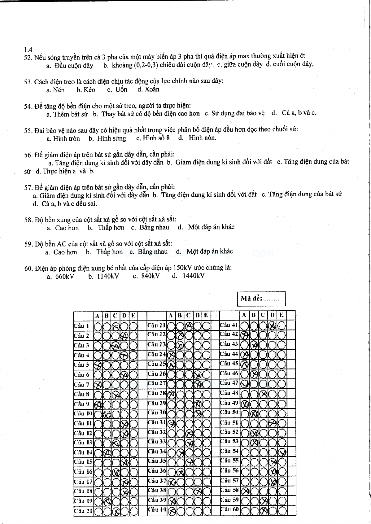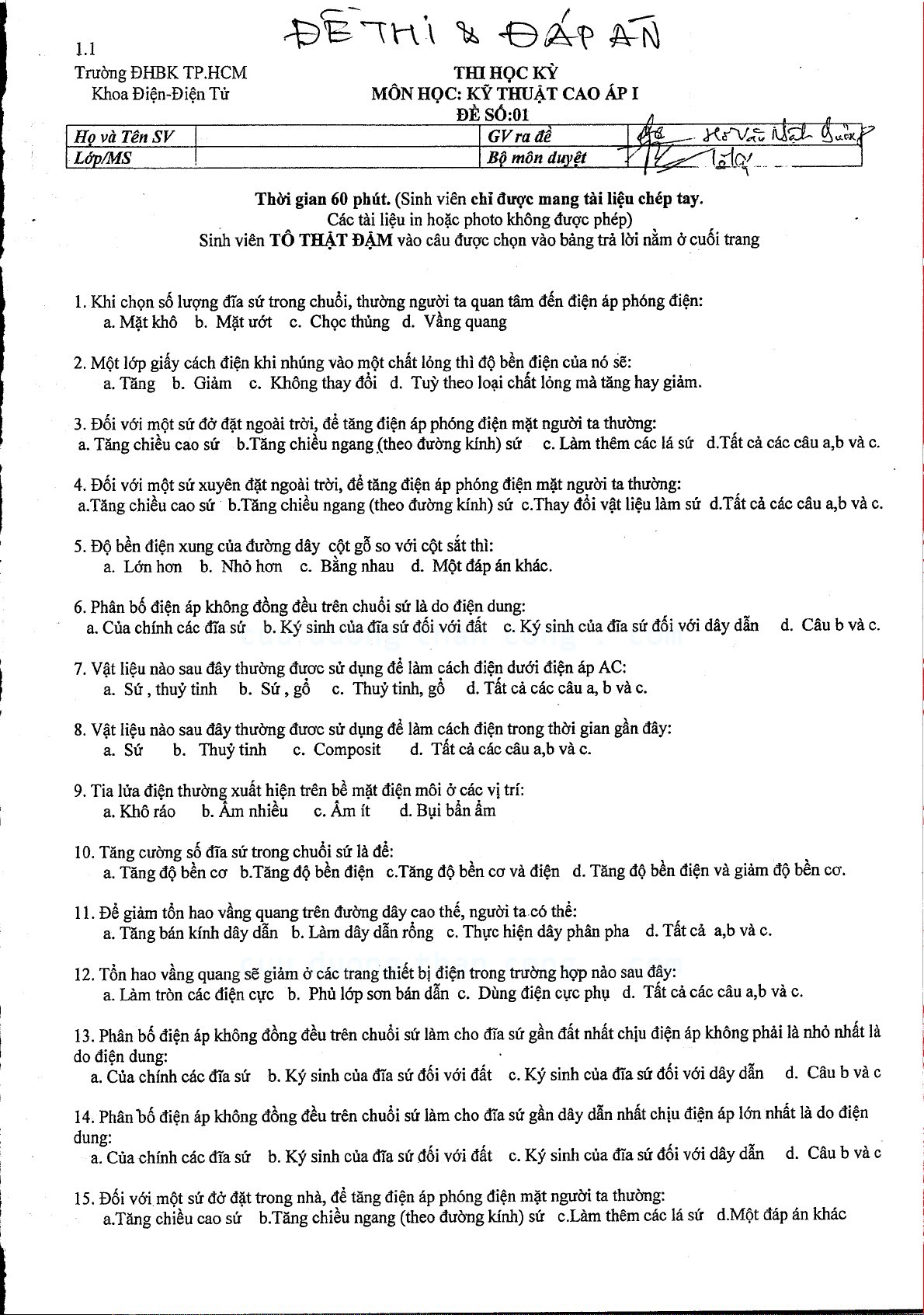 Đề thi học kỳ môn Kỹ thuật cao áp I
