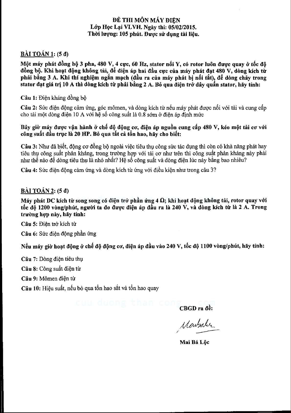 Đề thi học kỳ môn Máy điện năm học 2015