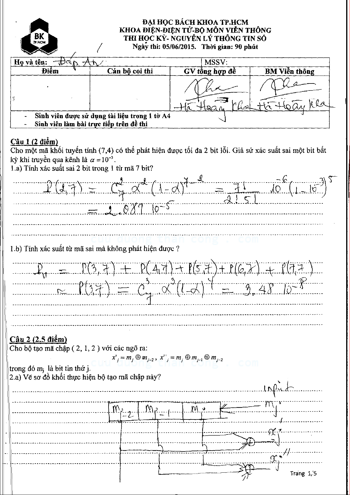 Đề thi học kỳ môn Nguyên lý thông tin số