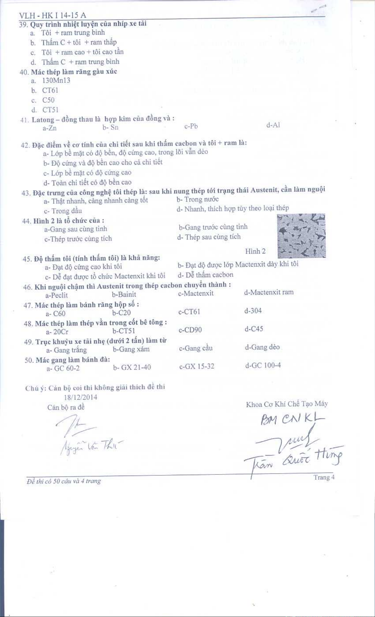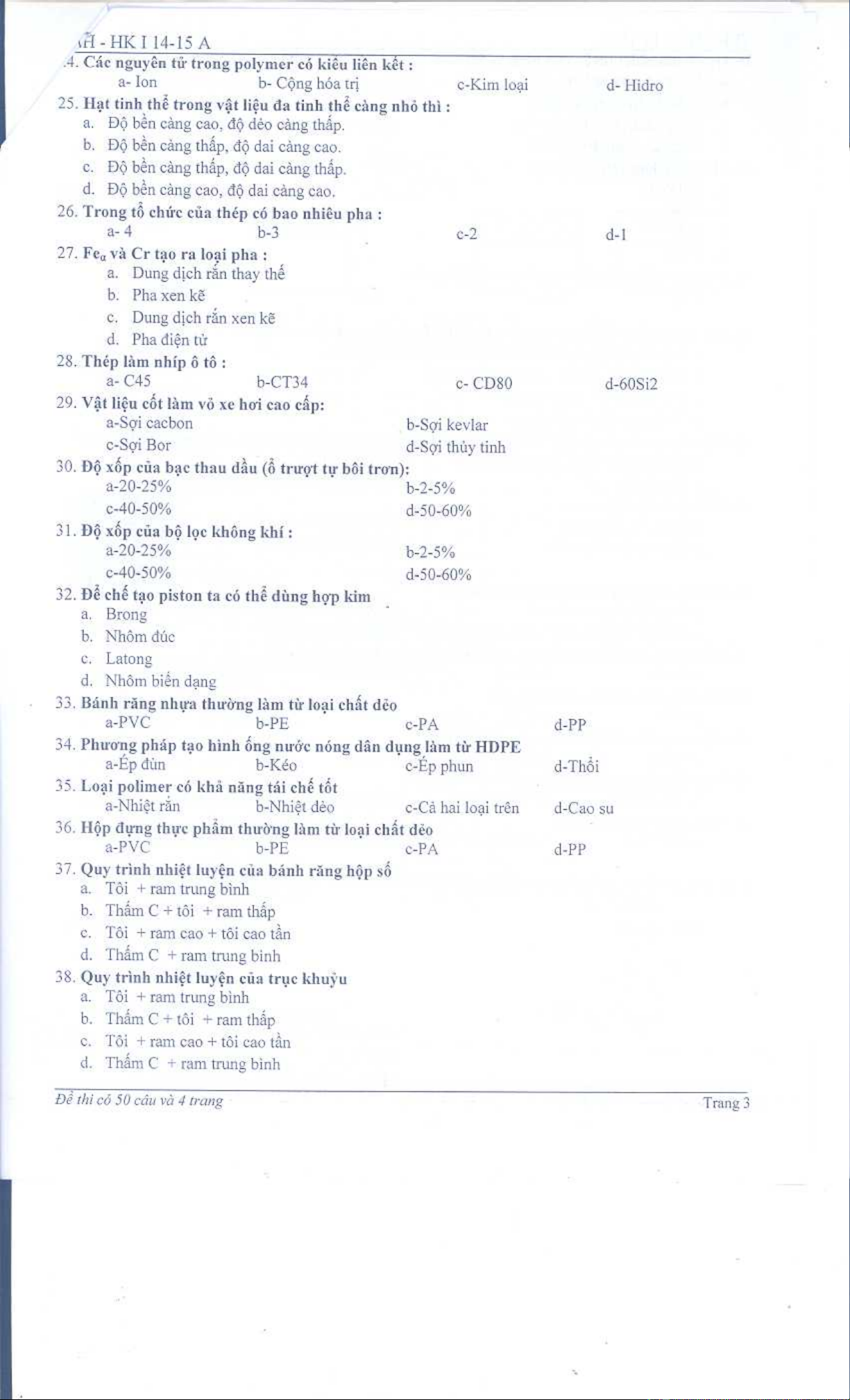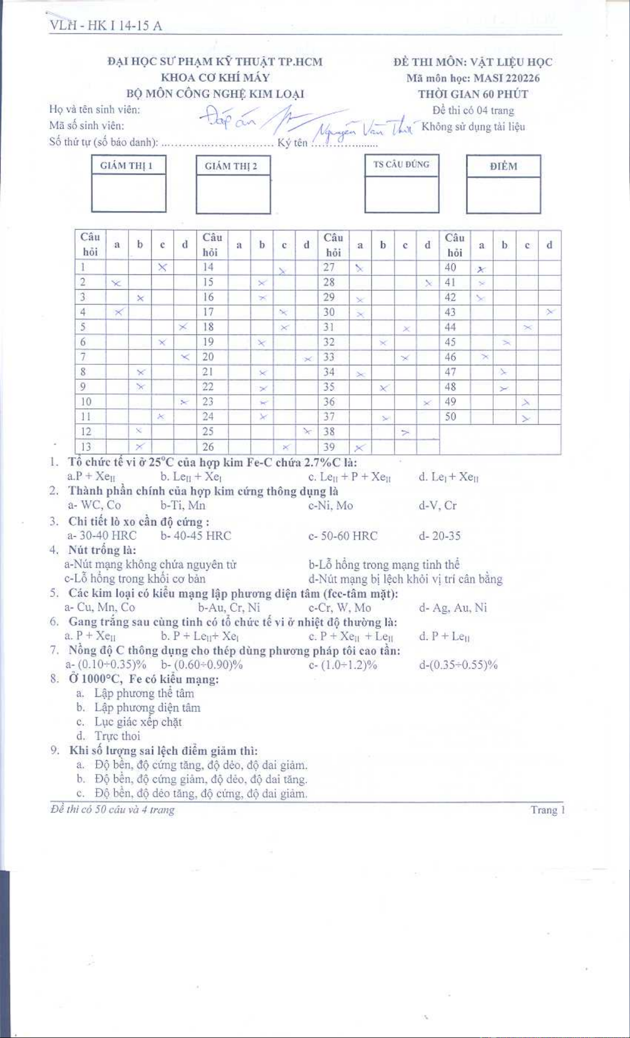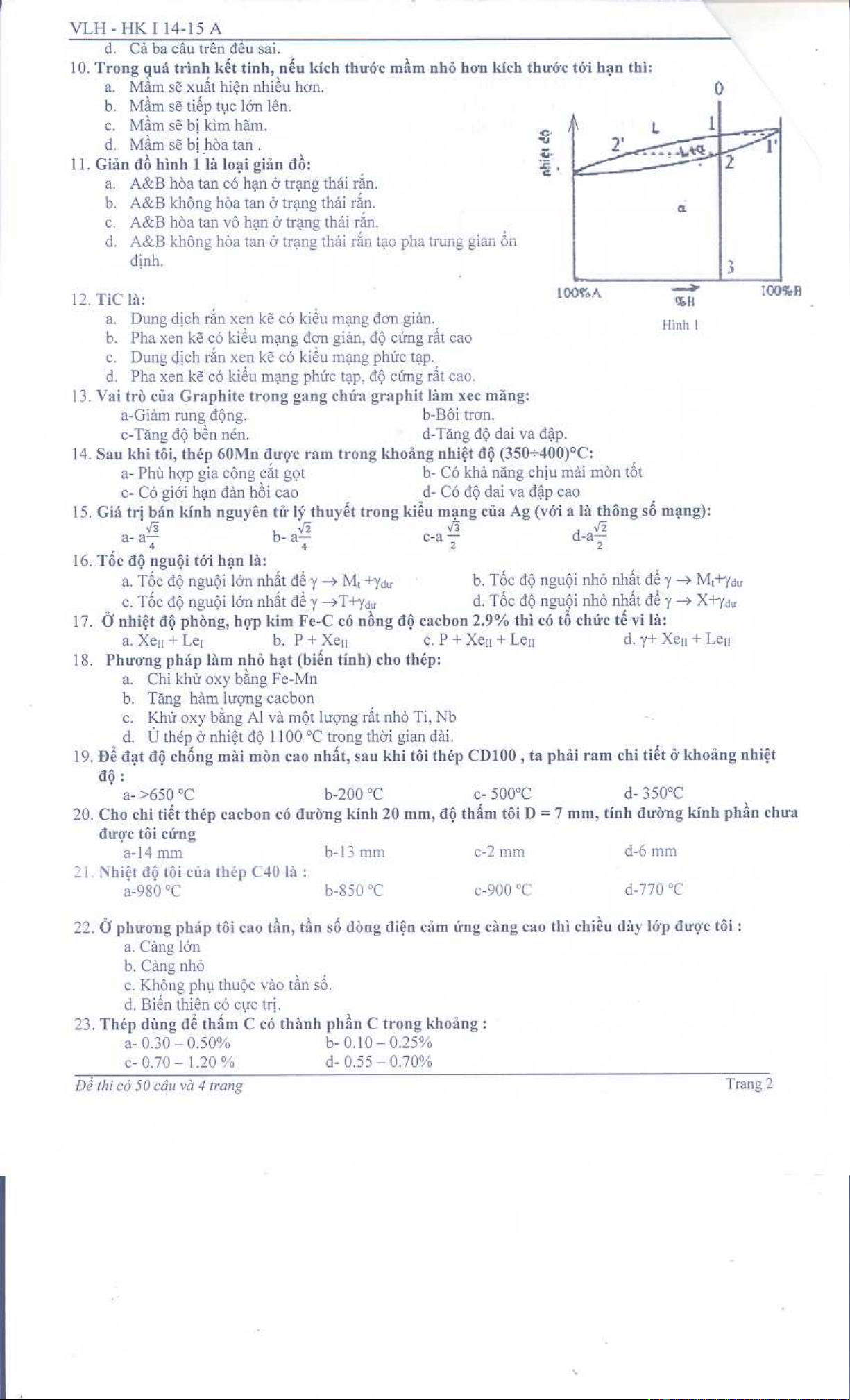 Đề thi học kỳ I năm học 2014-2015 môn Vật liệu học (Đề A) - ĐH Sư phạm Kỹ thuật