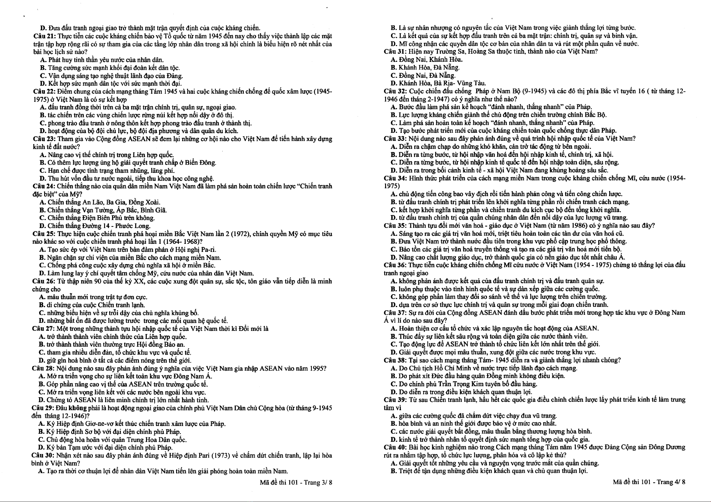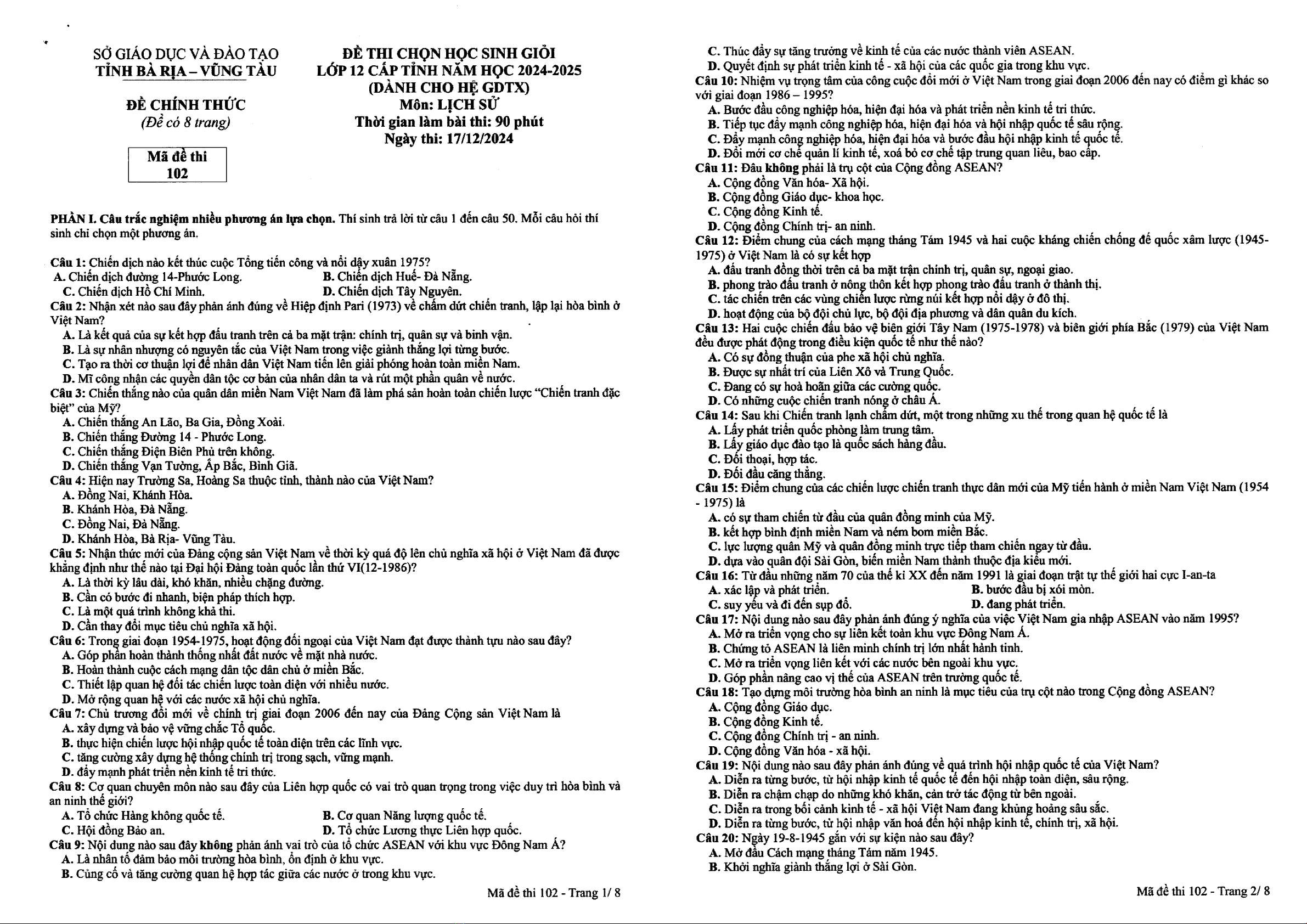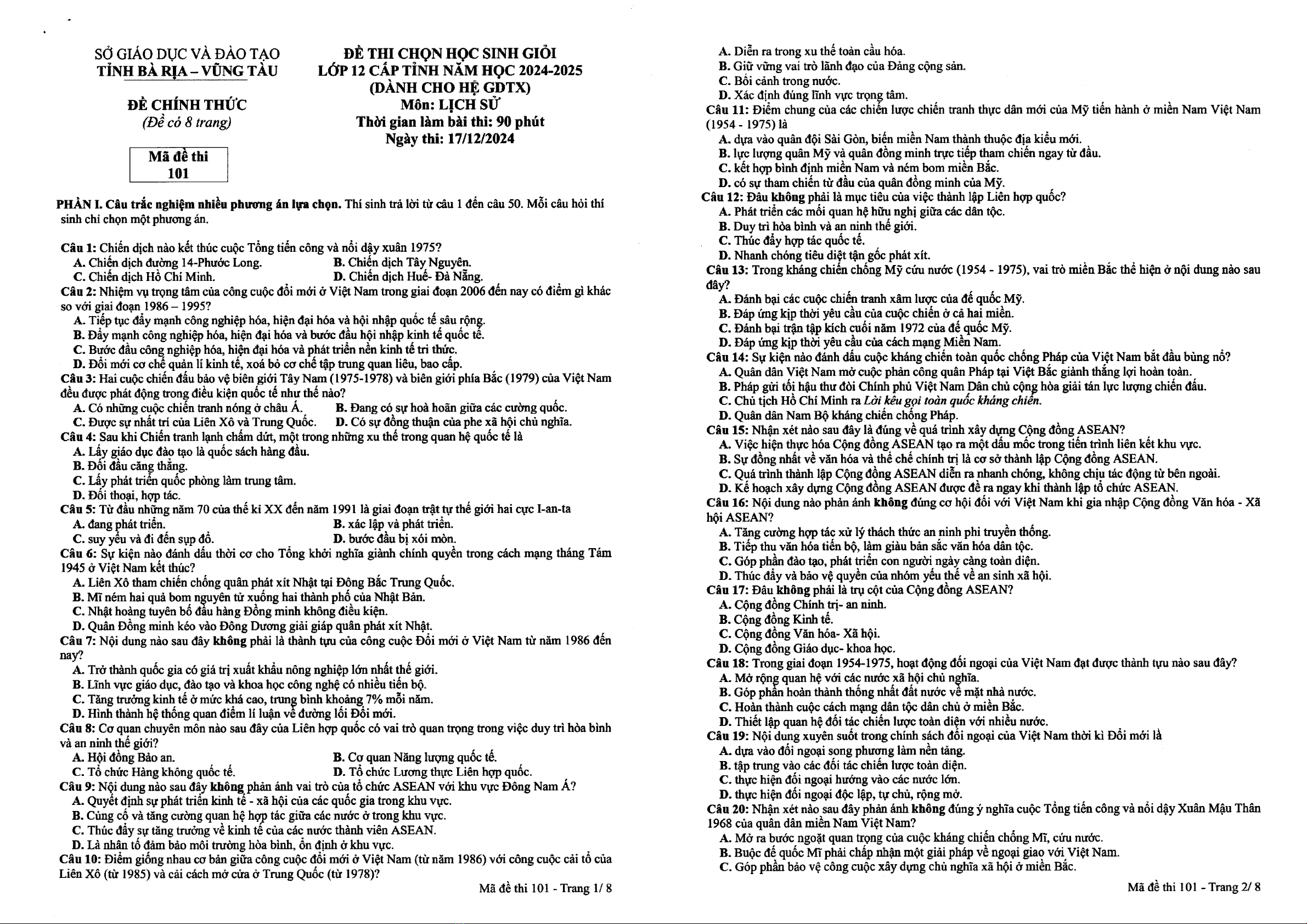 Đề thi học sinh giỏi cấp tỉnh môn Lịch sử lớp 12 năm 2024-2025 là một vũ kiện hữu ích cho các em học sinh củng cố kiến thức, phát triển tư duy và kỹ năng giải quyết vấn đề. Với 50 câu hỏi trắc nghiệm, chia thành 3 phần về lịch sử Việt Nam, thế giới và phương pháp nghiên cứu và đánh giá, đề thi là một gợi ý tốt cho việc luyện tập trước khi thi.