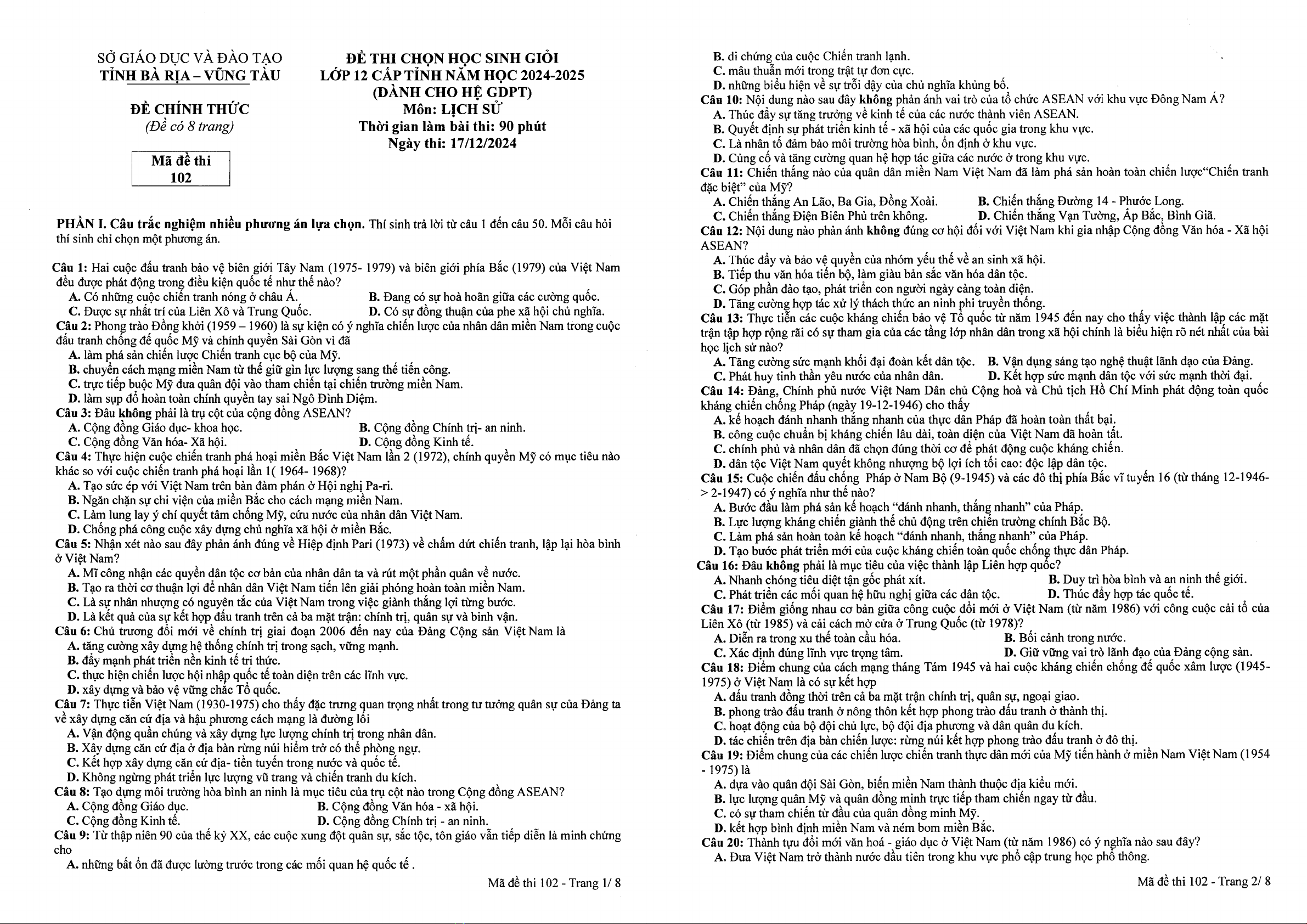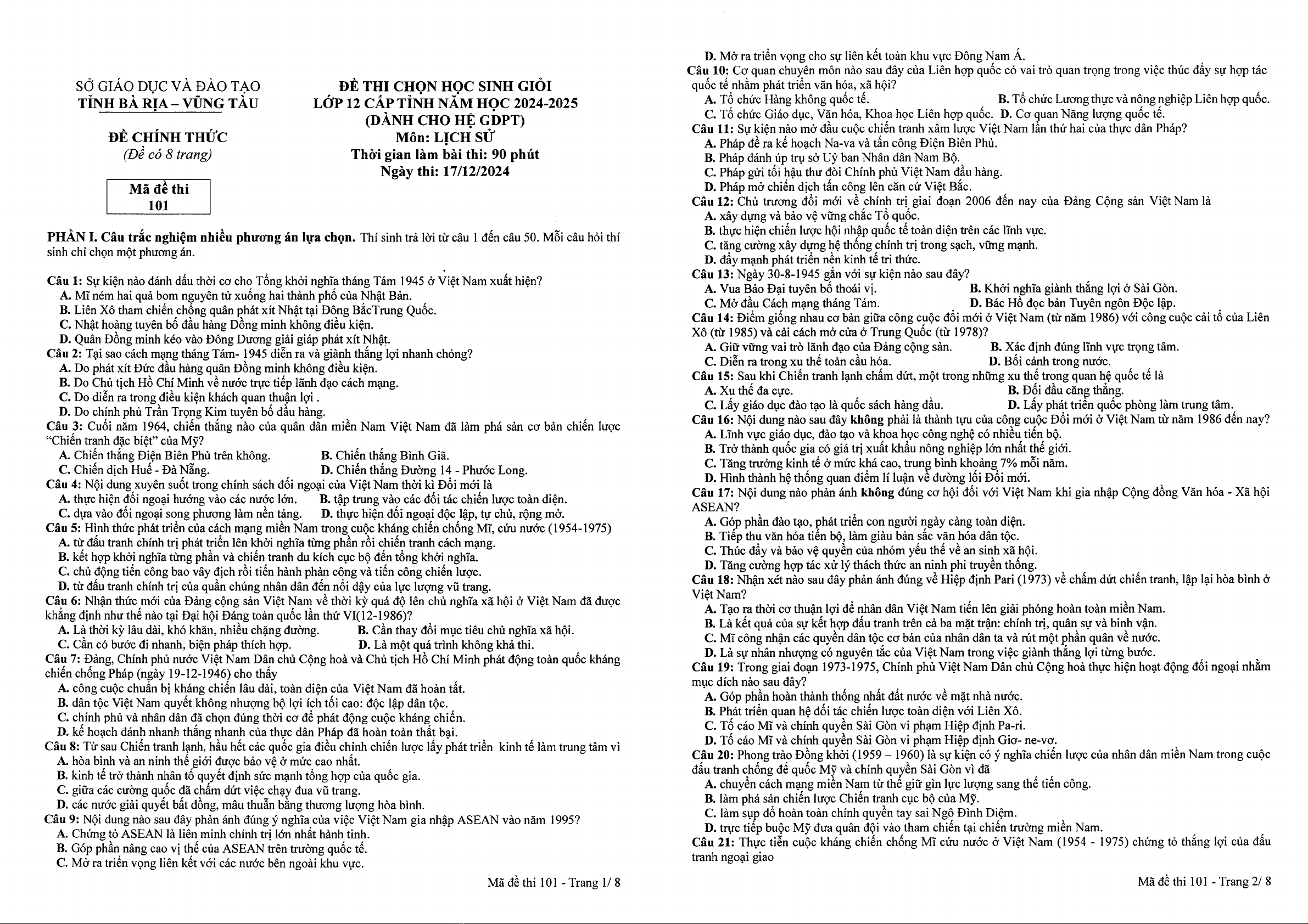 Đề thi học sinh giỏi cấp tỉnh môn Lịch sử lớp 12 năm 2024-2025 - Sở GD&ĐT Bà Rịa - Vũng Tàu là một đề thi chuẩn trong học kỳ để giúp em hệ thống kiến thức môn Lịch sử nhanh và hiệu quả. Nó cũng phải là một biểu diễn thực tế của cấu trúc kì thi chính thức.